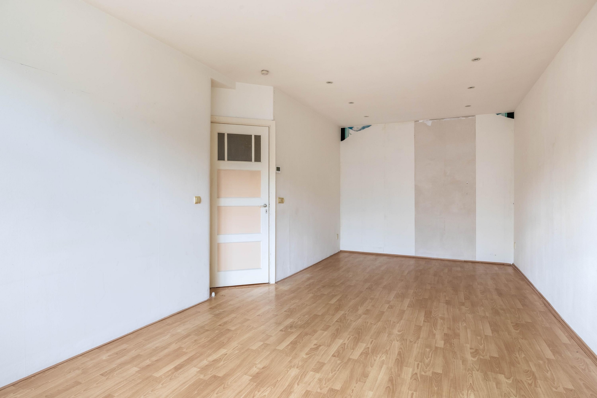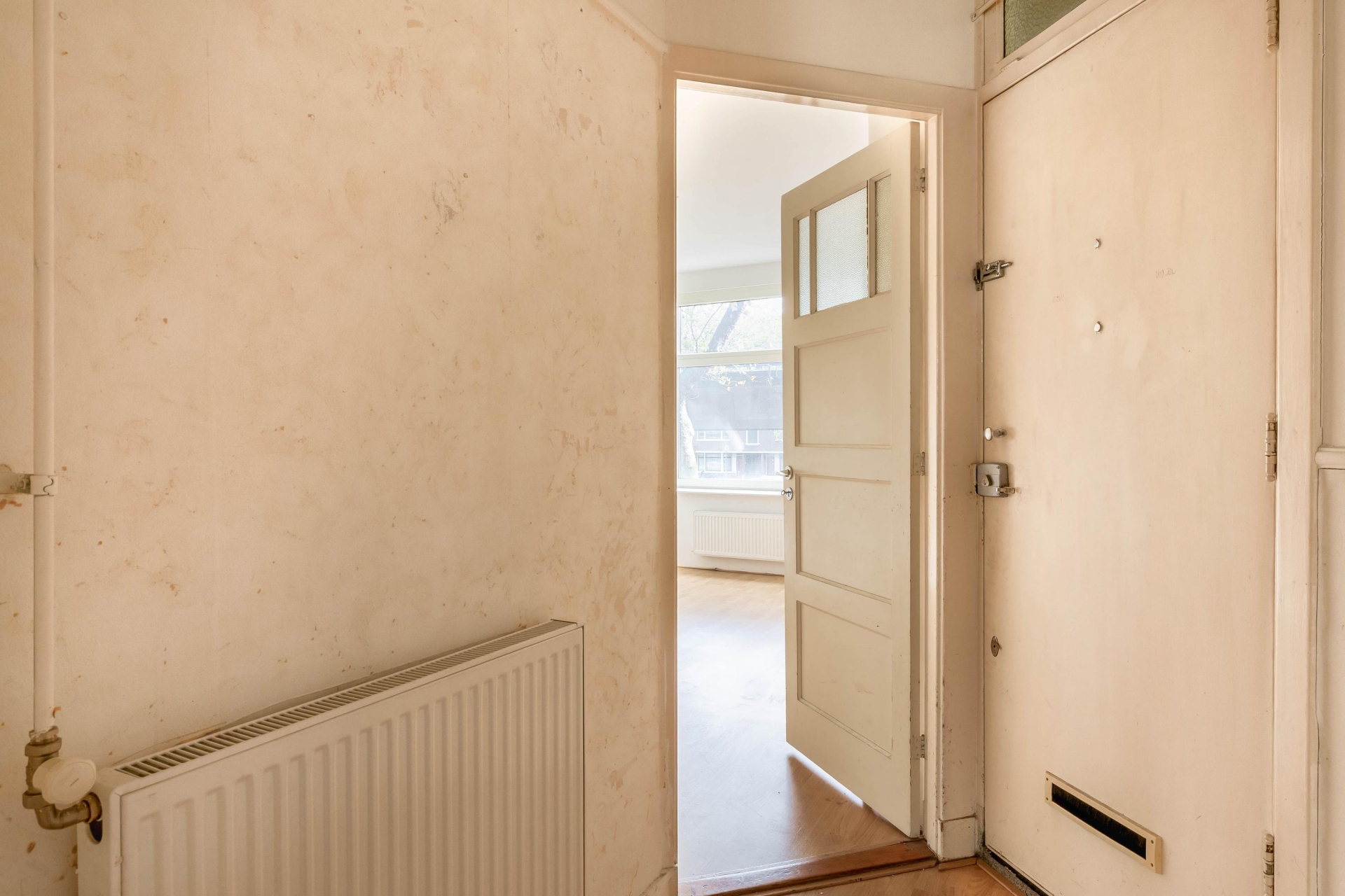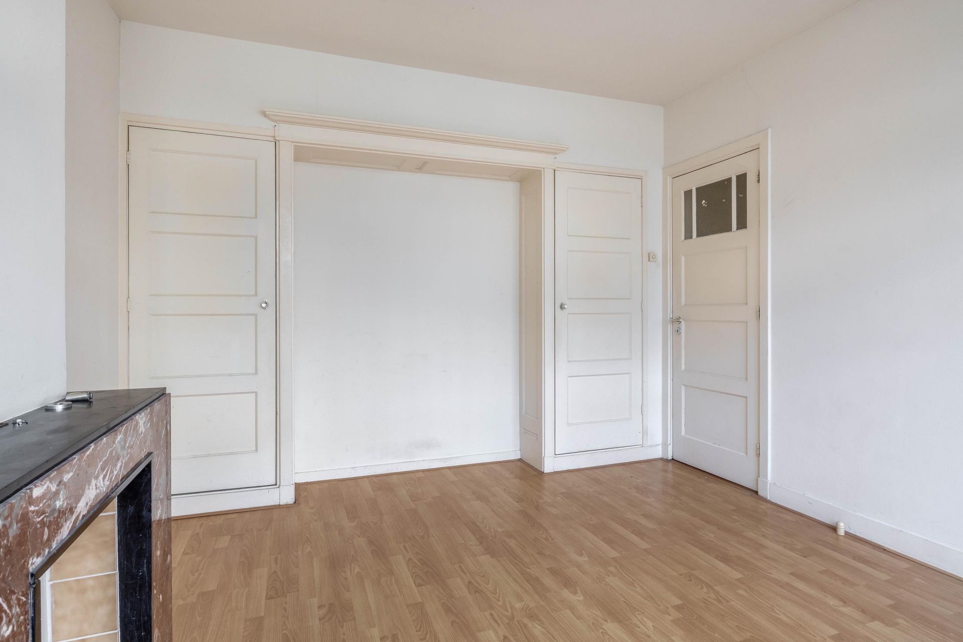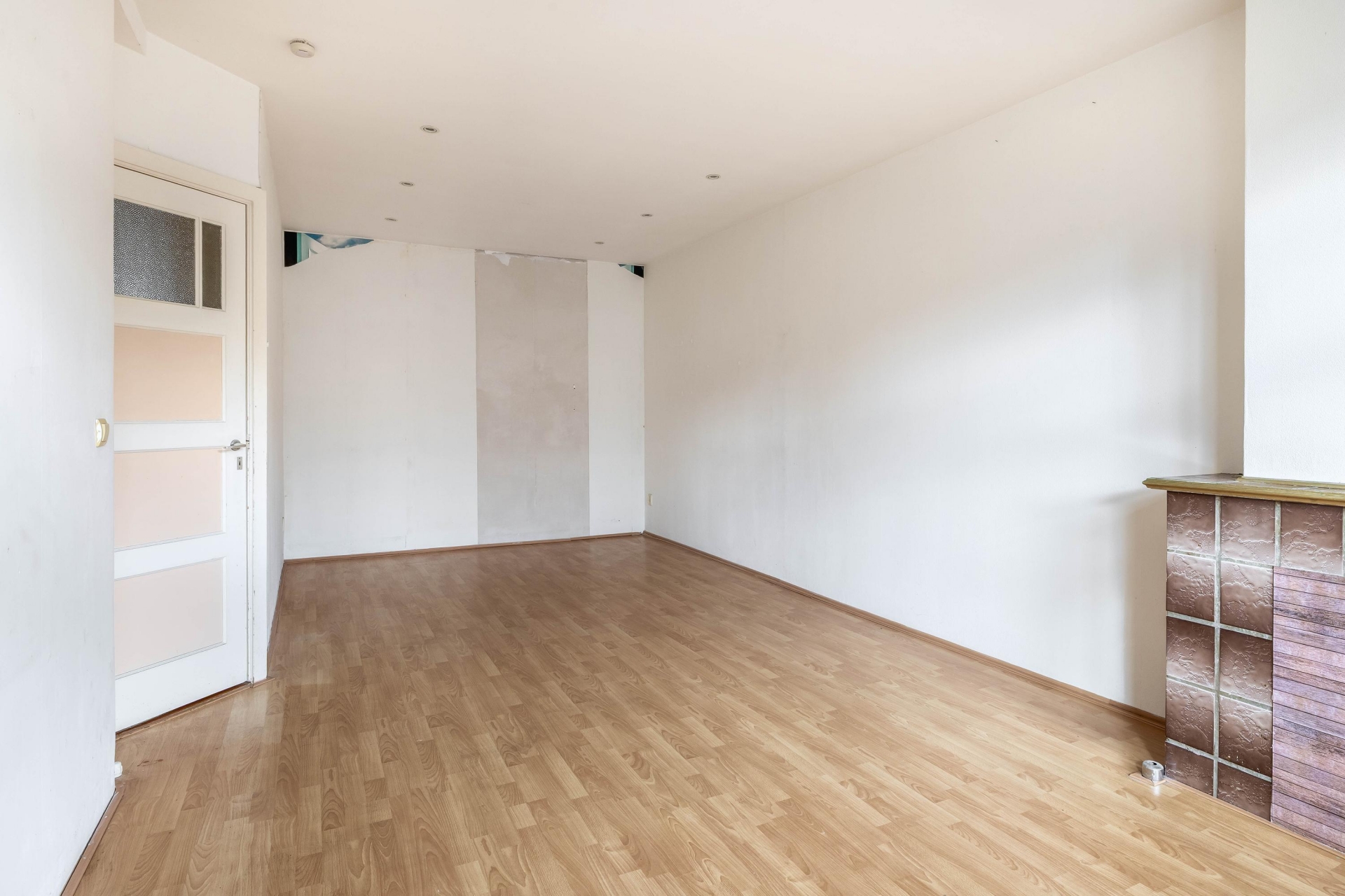 Entree van de woning met toegang tot de diverse vertrekken. De woonkamer is gesitueerd aan de straatzijde en voorzien van een laminaatvloer, een schouw en kunststof kozijnen met dubbel glas.