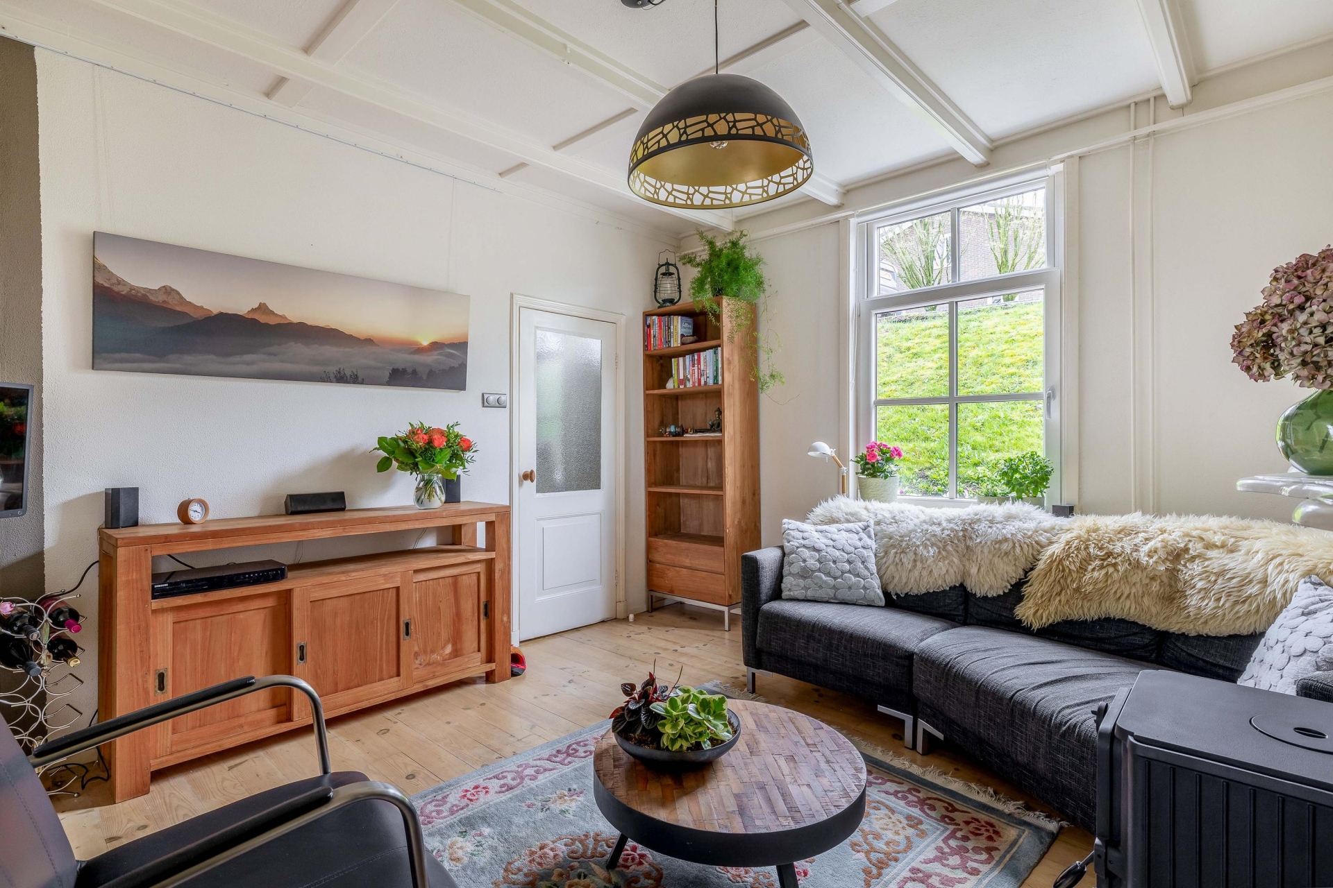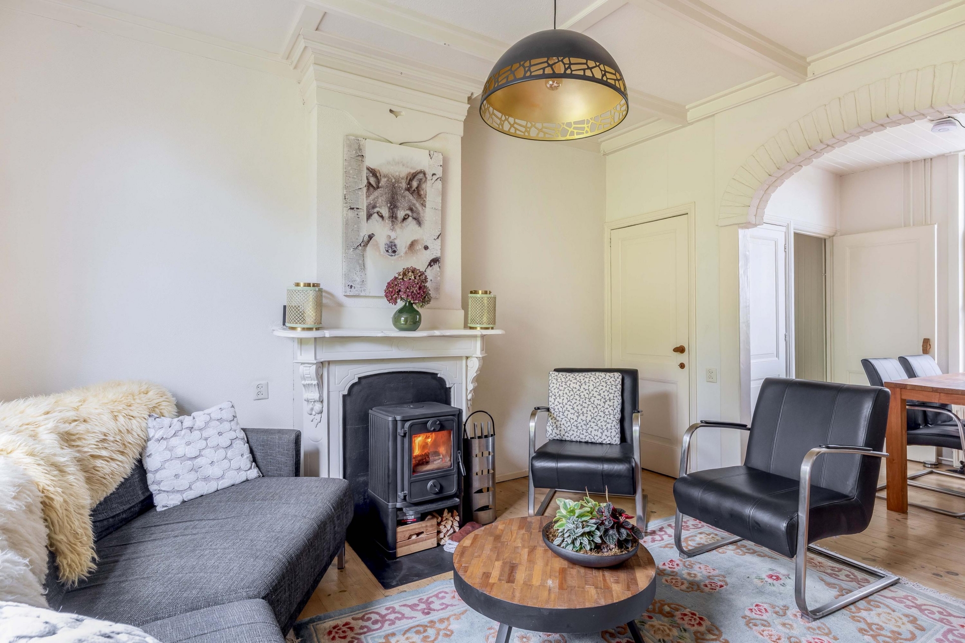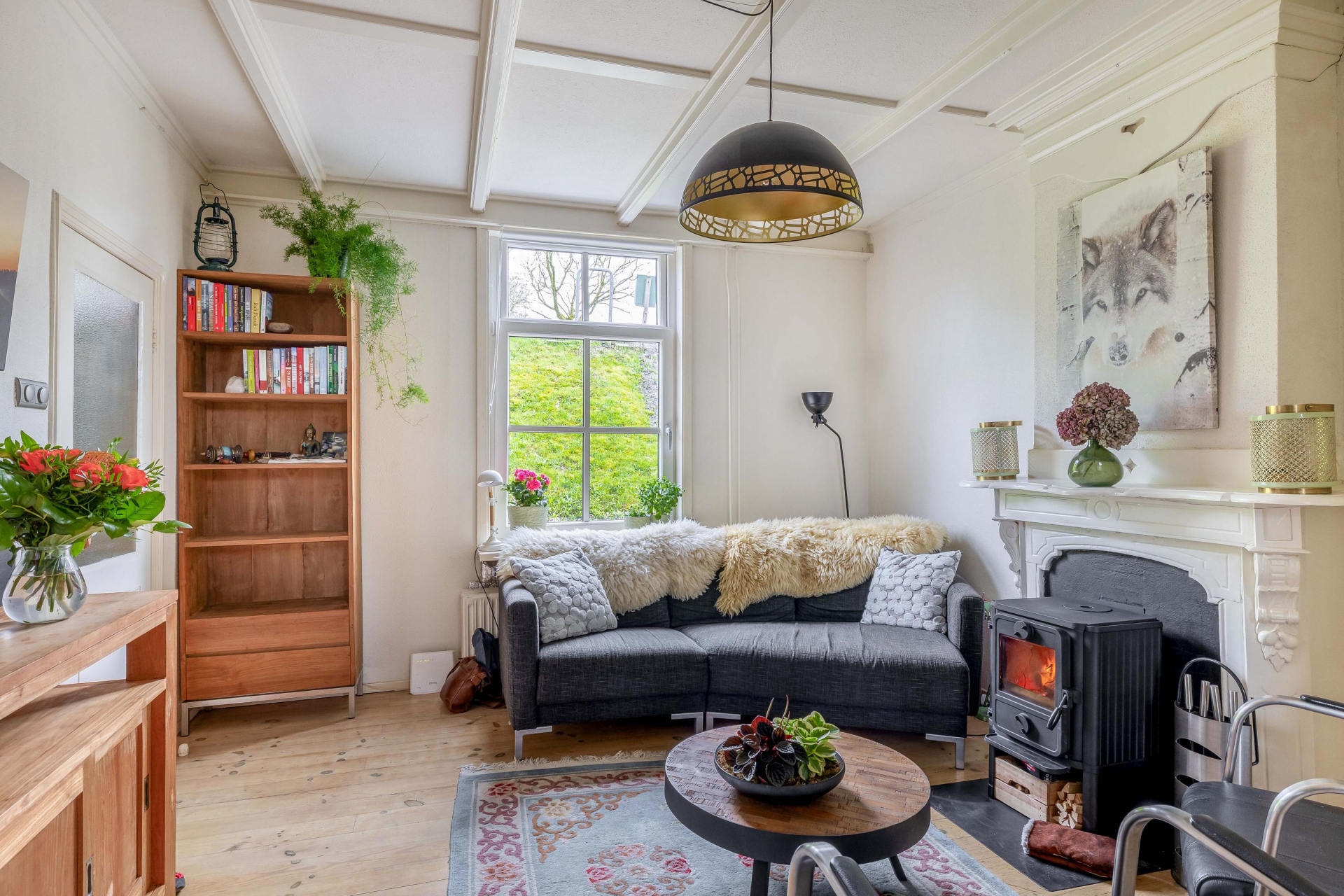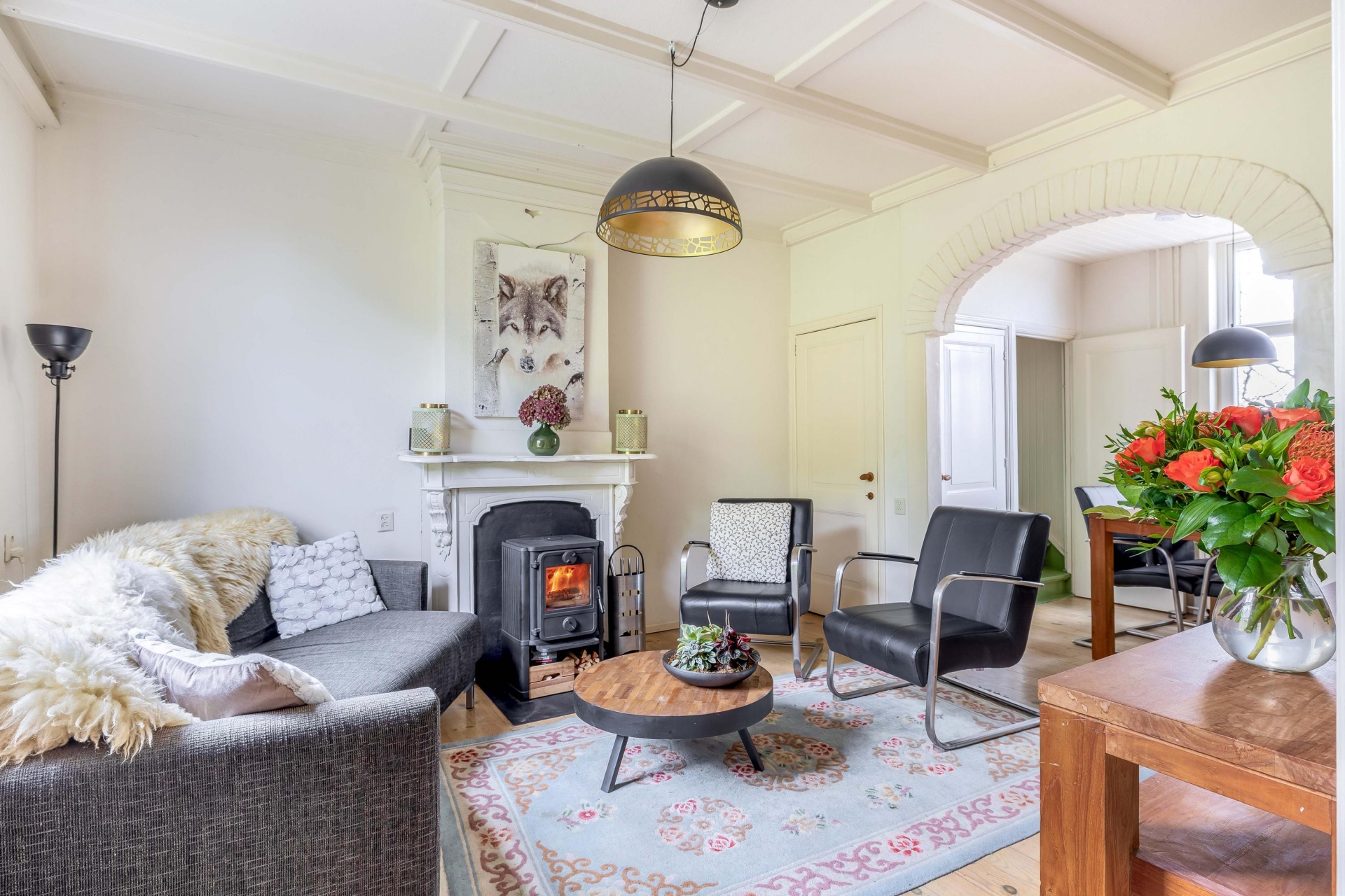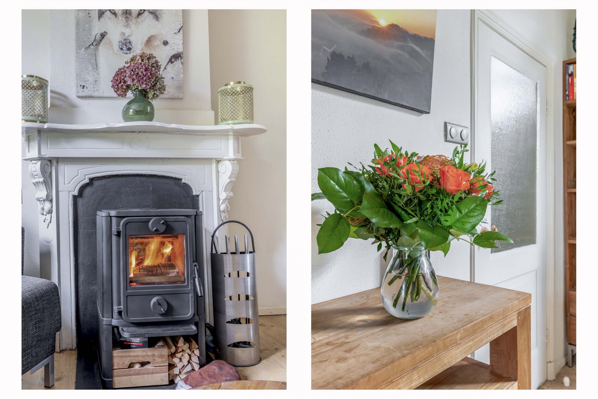Via de entree kom je binnen in de gezellige woonkamer. Hier valt meteen de prettige lichtinval op, gecombineerd met de mooie details zoals het balkenplafond en de schouw met houtkachel. Dit is zo’n ruimte waar je je direct thuis voelt. De zithoek is knus en overzichtelijk, maar biedt voldoende plek voor een comfortabele opstelling. Aan de achterzijde van de woonkamer is ruimte voor een eettafel, waar je uitkijkt richting de tuin. De open verbinding richting de keuken zorgt voor een fijne flow in het huis, waardoor het geheel ruimtelijk aanvoelt.