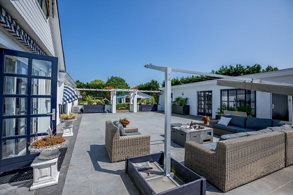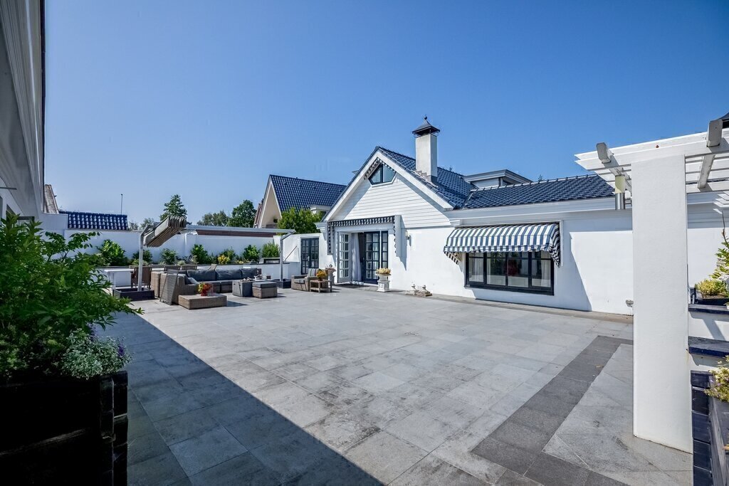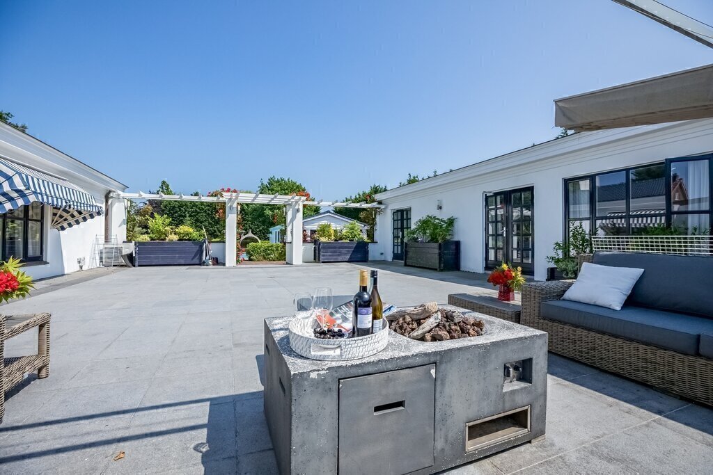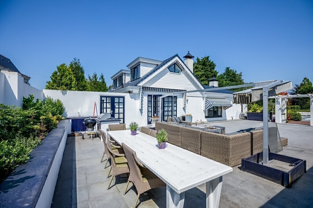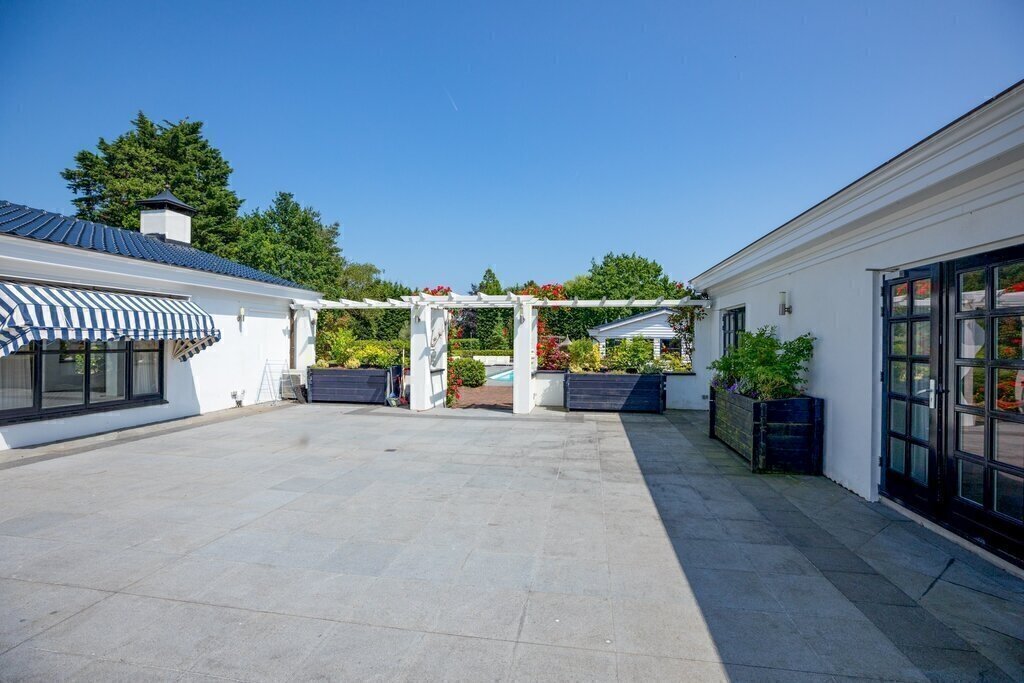 Tussen woning en bijgebouw is er een patio/riant zonneterras gecreëerd met buitenkeuken, barbecue en spoelbak. vanaf de patio kunt u naar het zwembad, bijgebouw en eetkeuken.