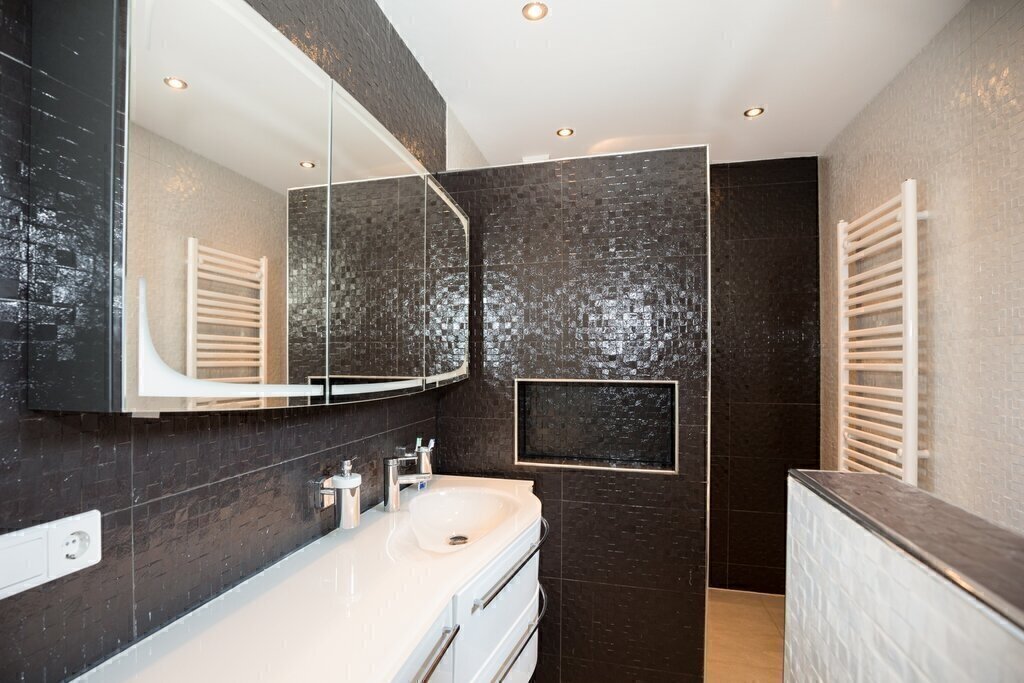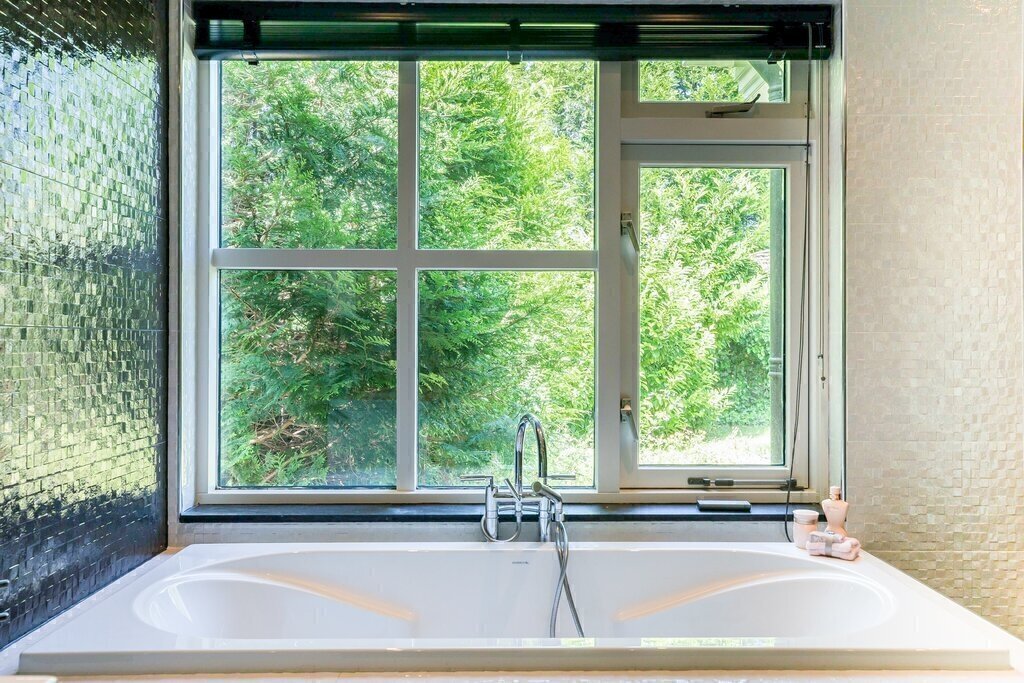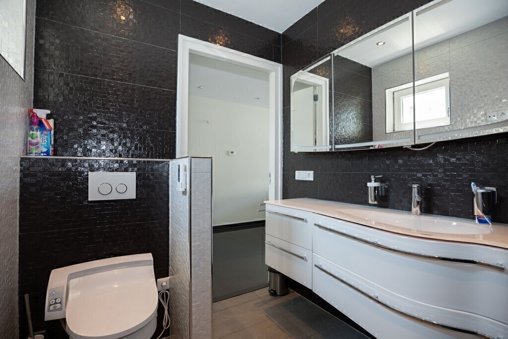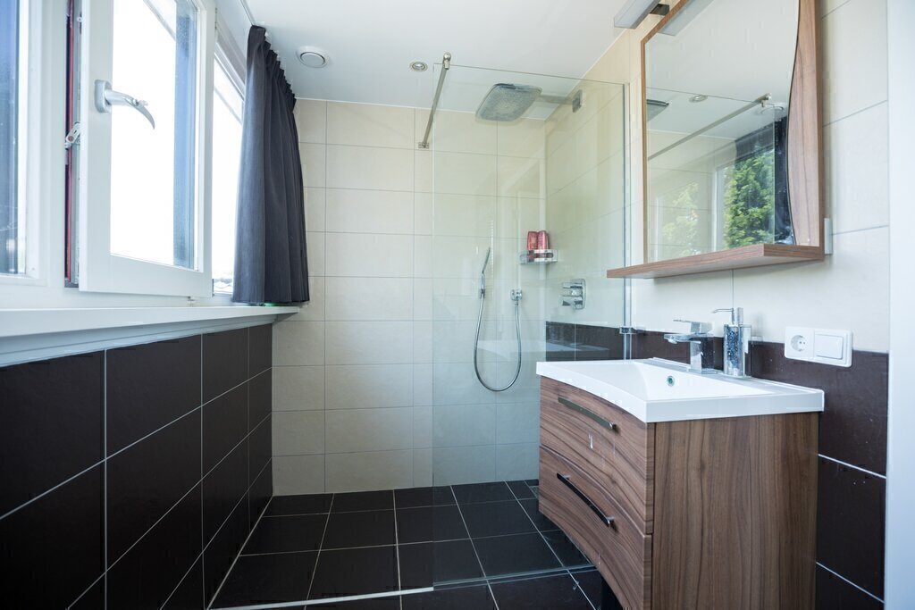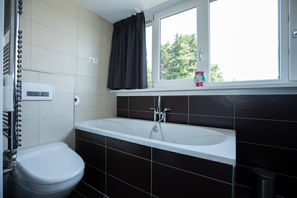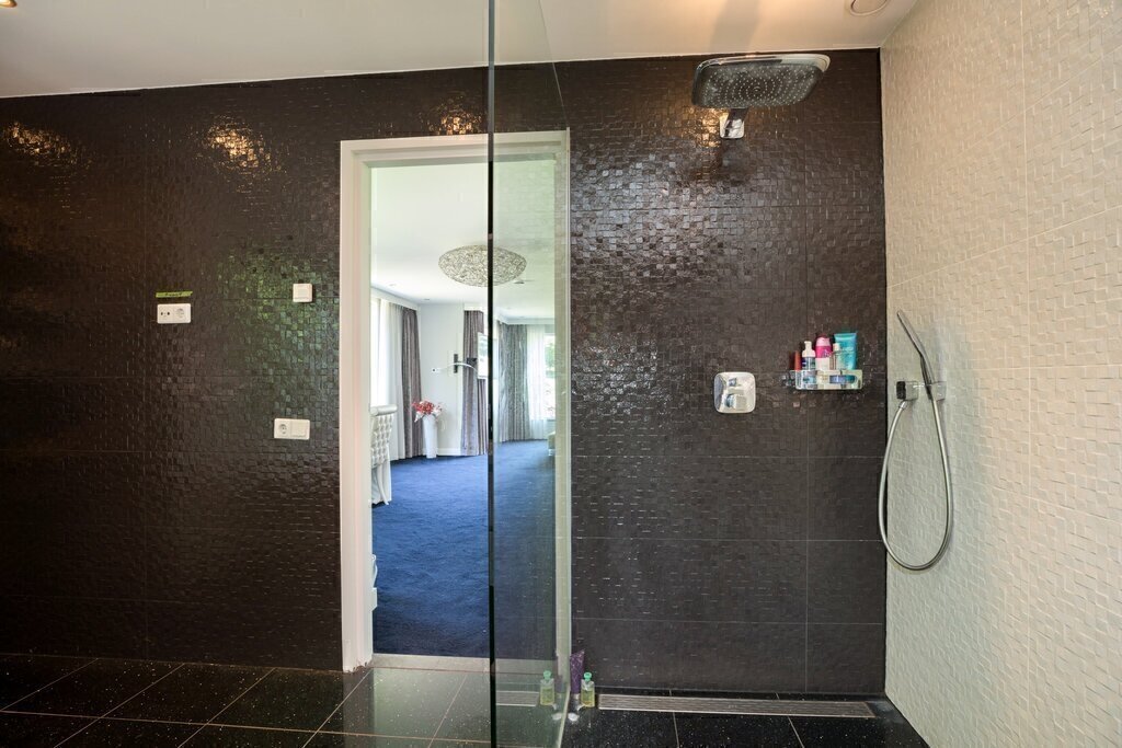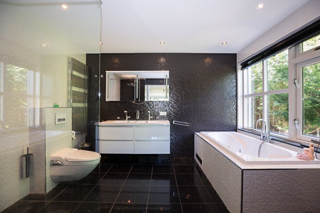 De modern en luxe badkamer is v.v. 2e toilet, bubbelbad, inloopdouche, wastafel, spiegel en verlichting.