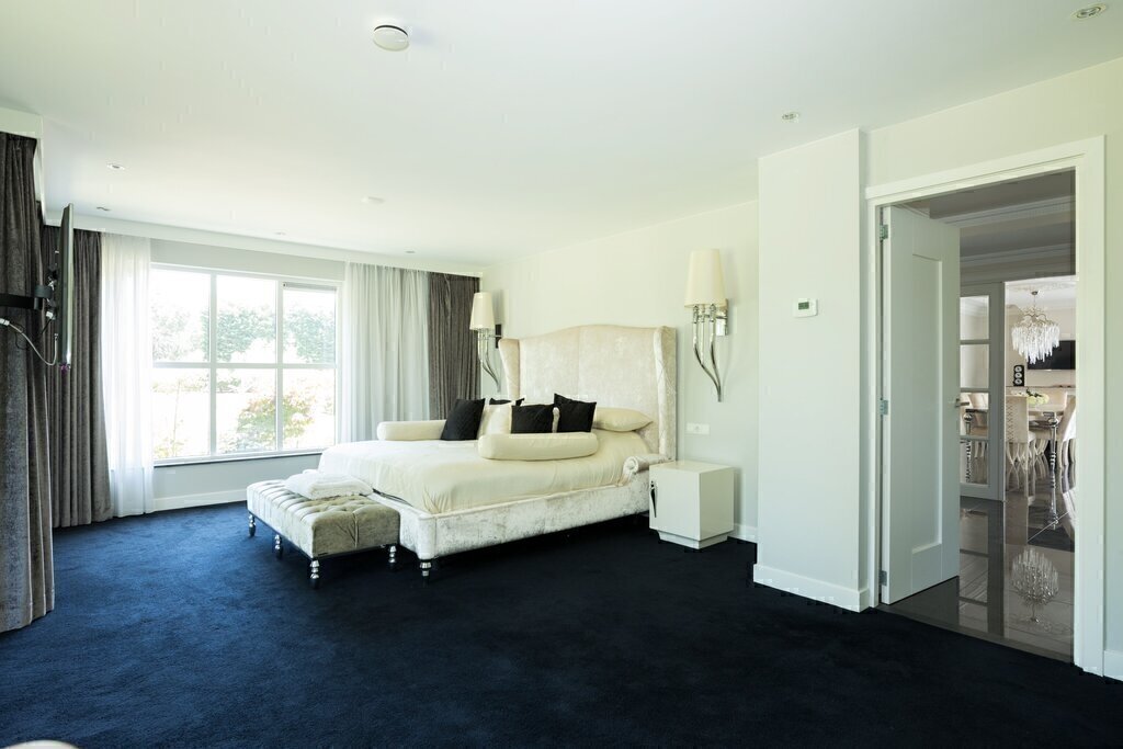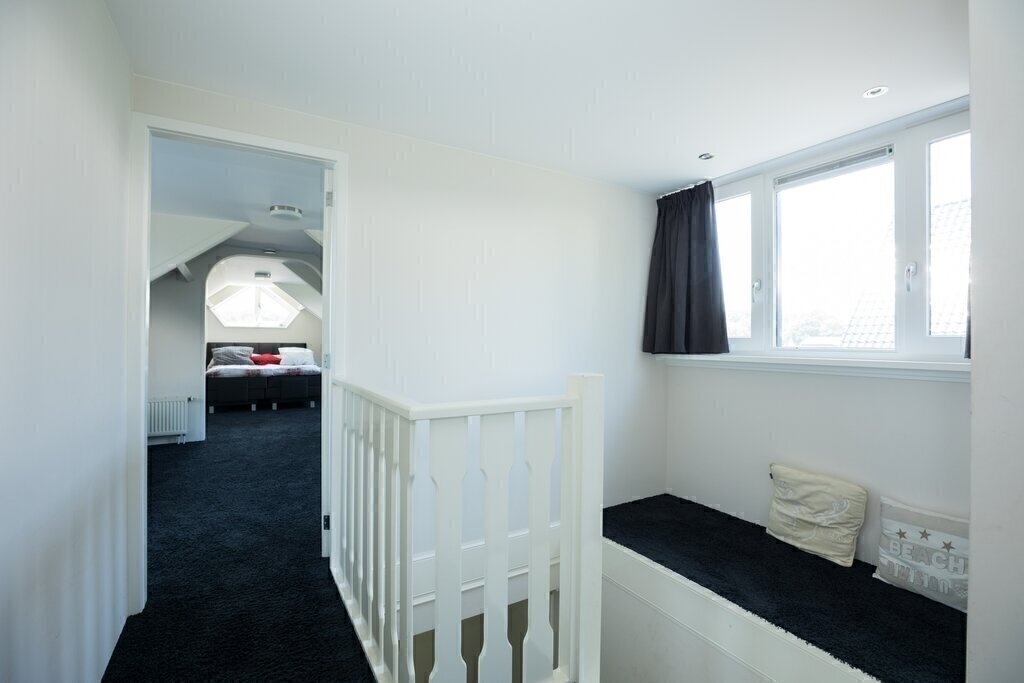 De hoofdslaapkamer van de verdieping ligt aan de linkerzijde, heeft 2 dakkapellen en een kastenkamer.
