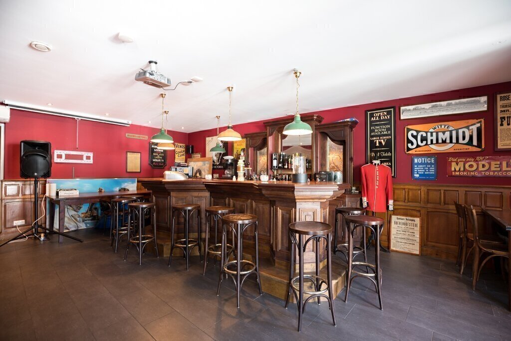 Het bijgebouw bestaat uit 2 appartementen/studio's en een Engelse kroeg.