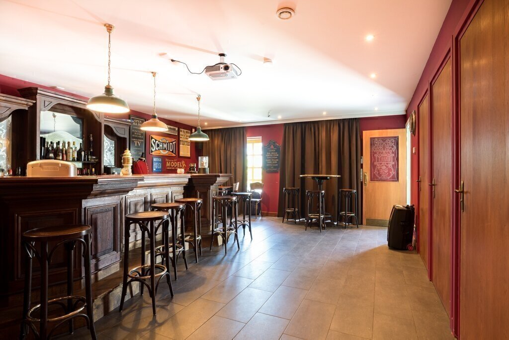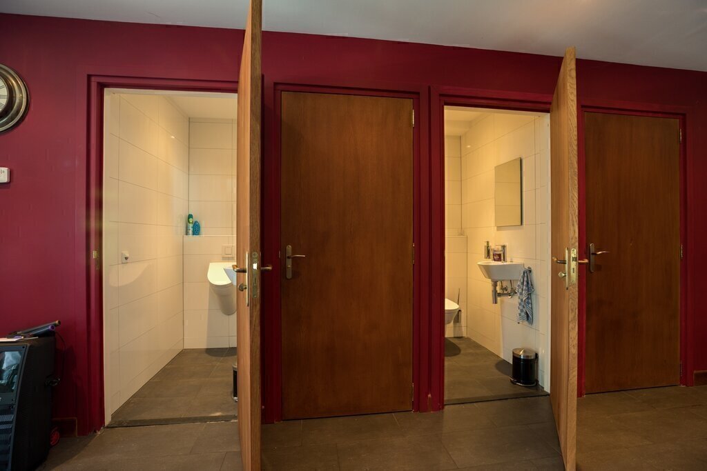 Achter de bar is er een hal met 2 toiletten (waarvan 1 toilet is v.v. van zwevend toilet en urinoir) en douche.