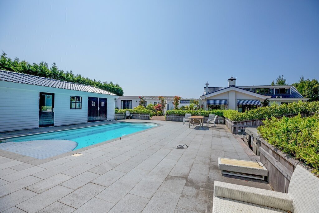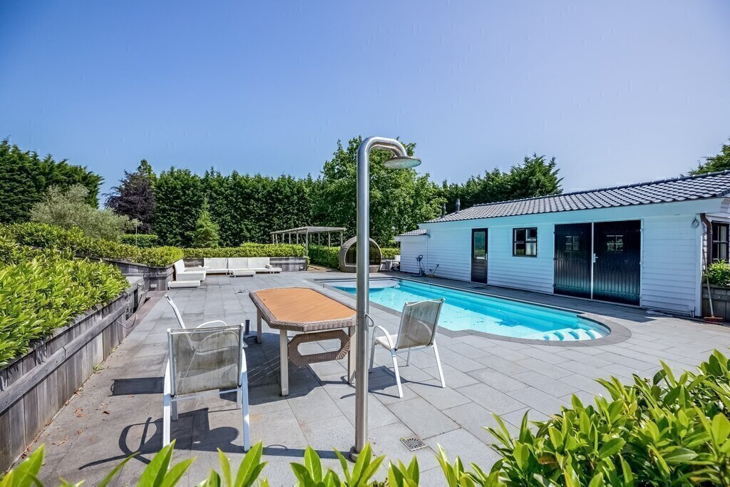 In de voortuin ligt een ruim zwembad (10x4 m) met jacuzzi, buiten douche en badhuis. Het badhuis is voorzien van een aparte berging waar de verwarming voor het zwembad en het badhuis plaats vinden, alsmede aan de voor- en achterzijde openslaande deuren.