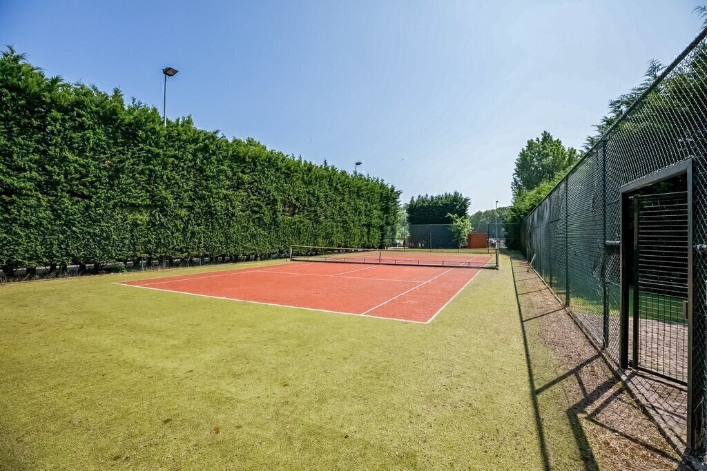 De tennisbaan ligt aan de 2e oprit, deze heeft standaard afmetingen en is v.v. verlichting en hekwerk.