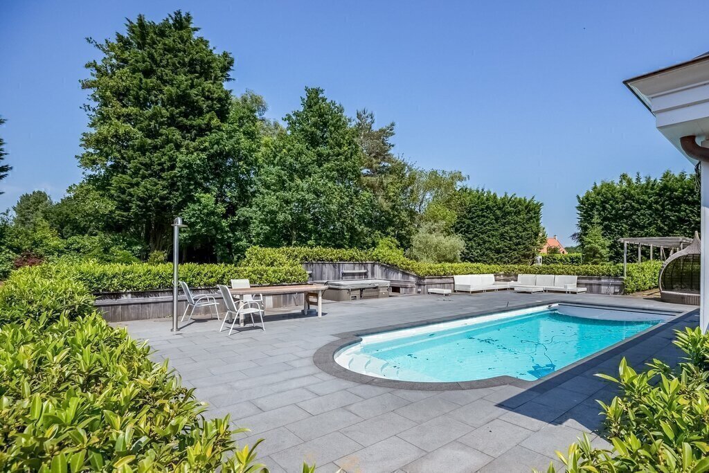 De oprit richting het huis heeft 6 vaste parkeergelegenheden en brengt u vervolgens langs het zwembad bij het vrijstaande luxe woonhuis.