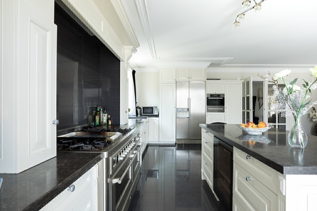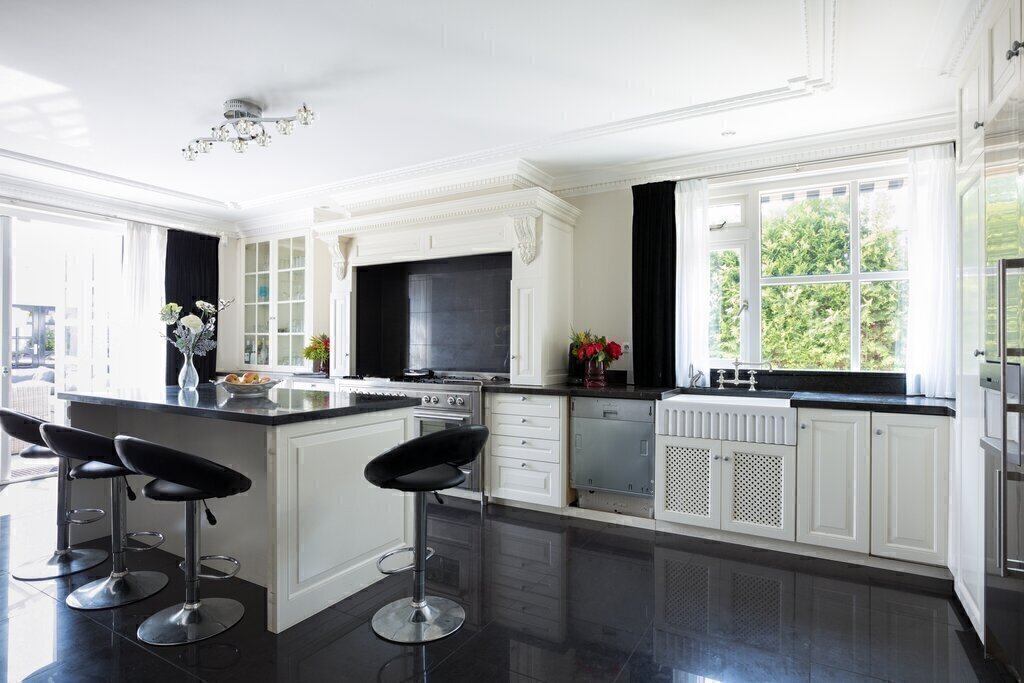 De moderne keuken heeft een vaste kastenwand, gashaard, een eiland, en inbouwapparatuur zoals wijnkoeler, combi-oven, koel/vriescombinatie, 6-pits losstaand Boretti gasfornuis met grillplaat en dubbele oven, afzuigkap, vaatwasser en stenen spoelbak met Quooker. Het geheel wordt gecompleteerd door een natuurstenen aanrechtblad. Het aanrecht heeft een opbouw servieskast. Begane grond v.v. vloerverwarming en keuken met mechanische ventilatie.