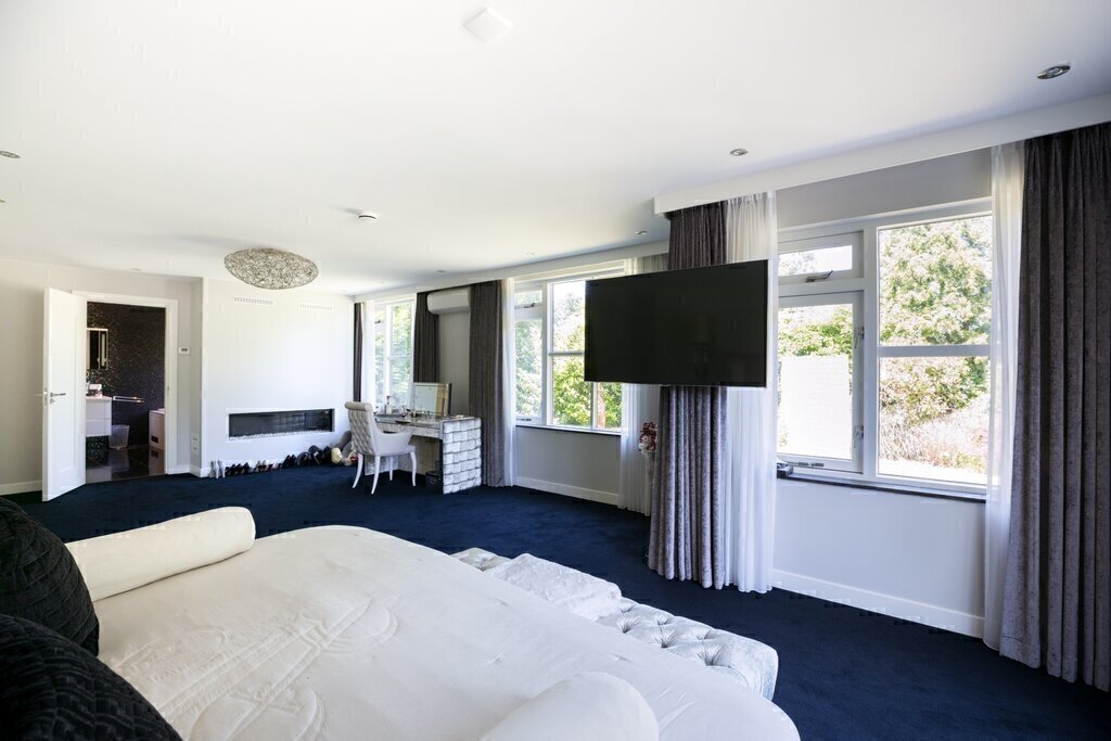 Aan de rechterzijde op de begane grond vind u tevens de hoofdslaapkamer met badkamer ensuite, gashaard, inloopkast met vaste kastenwand en openslaande deuren naar achterterras. De badkamer is v.v. bubbelbad, aparte douche, 2e toilet, nisje met glasplaten voor de handdoeken, mechanische ventilatie en dubbele wastafel.
