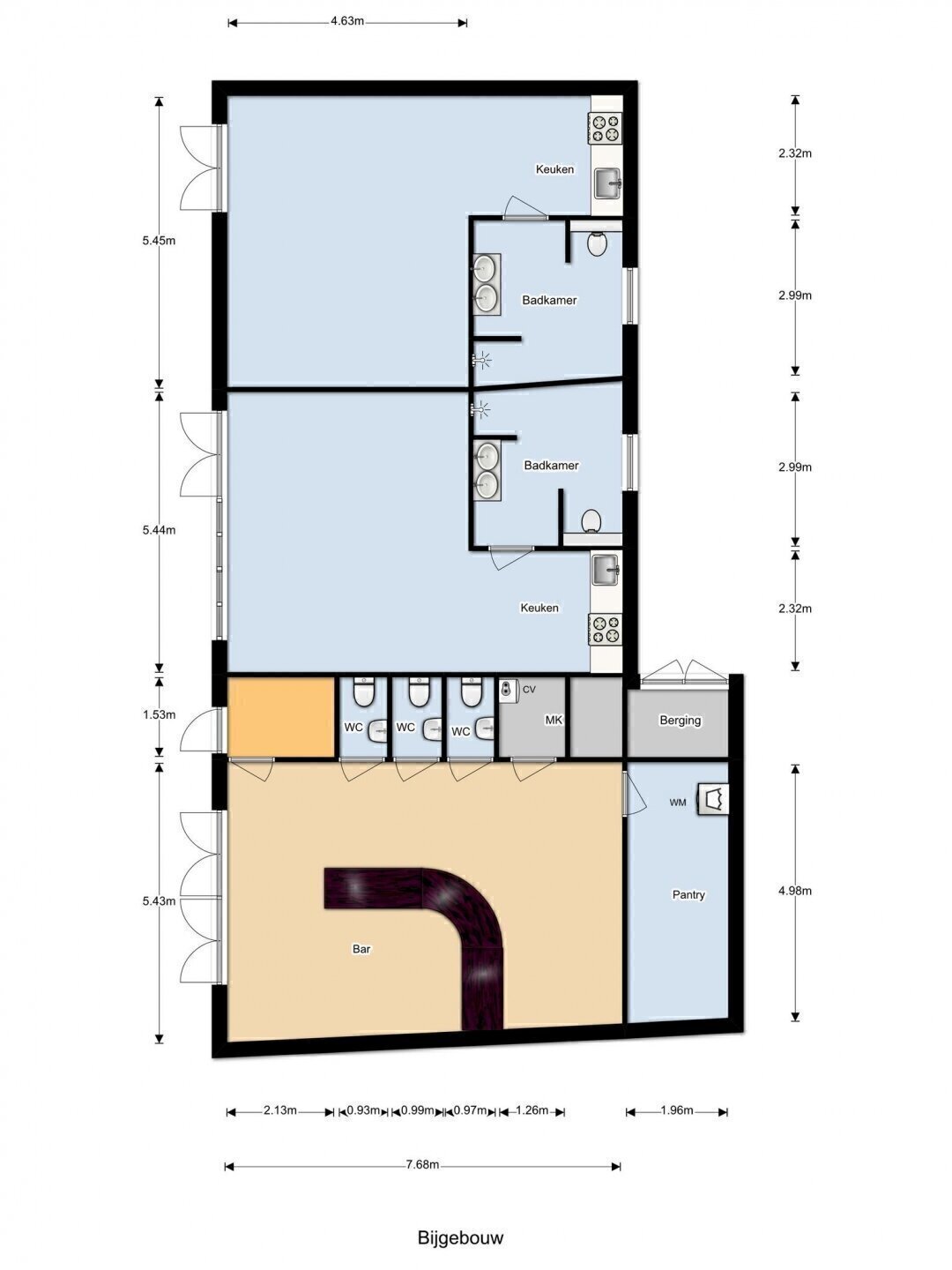 De bar is v.v. 1 urinoir, 2 toiletten, 1 technische ruimte met cv opstelling en de wasruimte met berging.