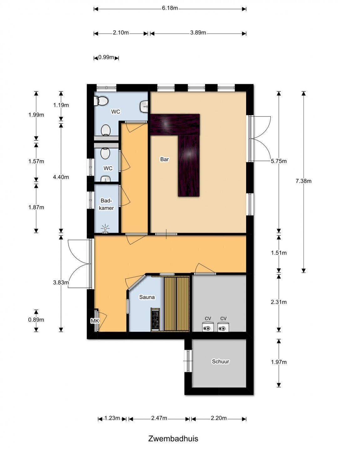 Aan de rechter voorzijde van het badhuis vinden we de zwembad bar (v.v. o.a. koelkast, tap aansluiting).