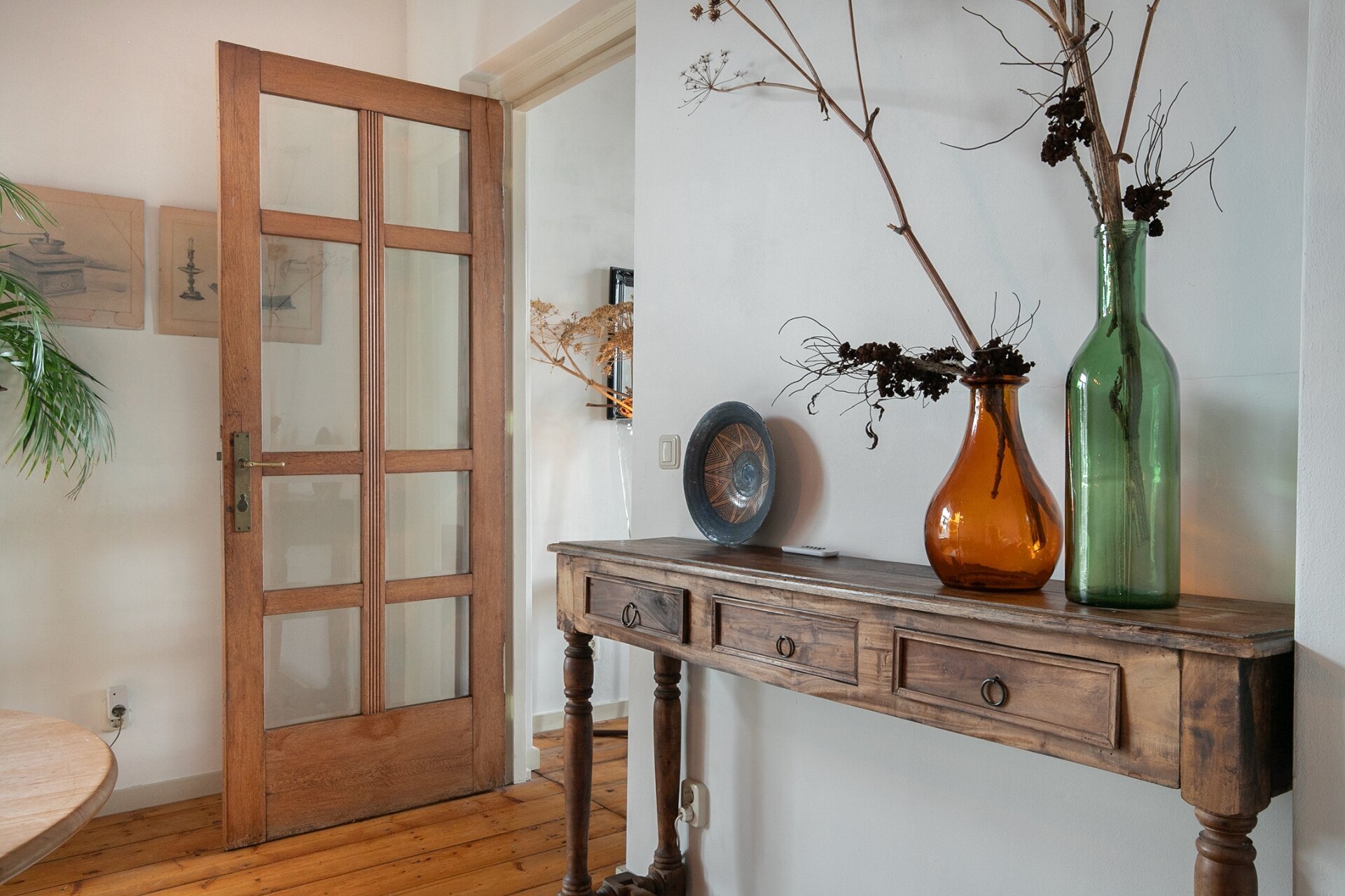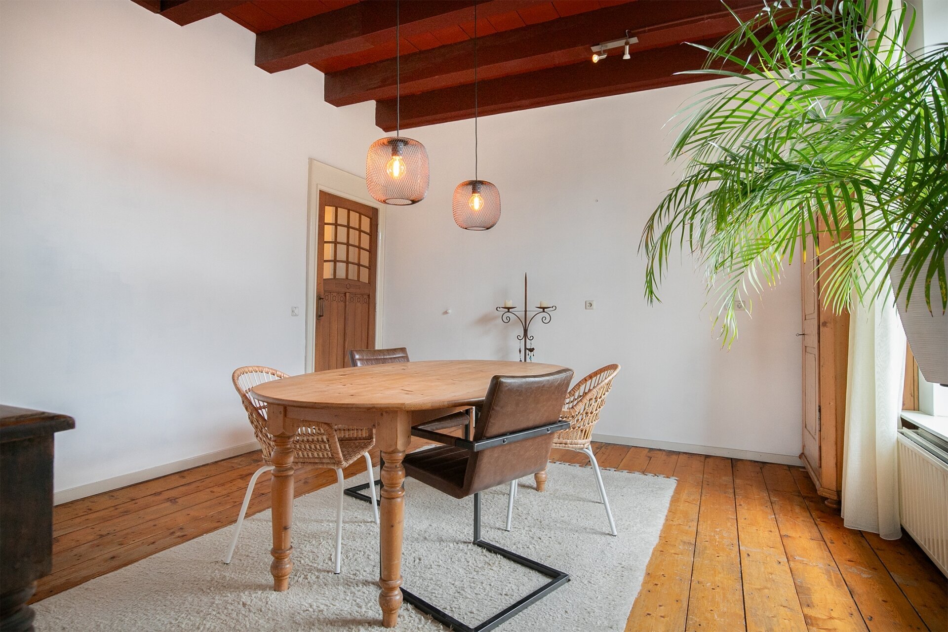 Aan de voorzijde van de woning bevindt zich een eerste slaapkamer, die kan dienen als studeerkamer of babykamer. Direct daarnaast ligt de ruime woonkamer, voorzien van een prachtige houten vloer en veel natuurlijk licht door de hoge ramen aan de voorkant. Vanuit de woonkamer heeft u toegang tot een aparte eetkamer.