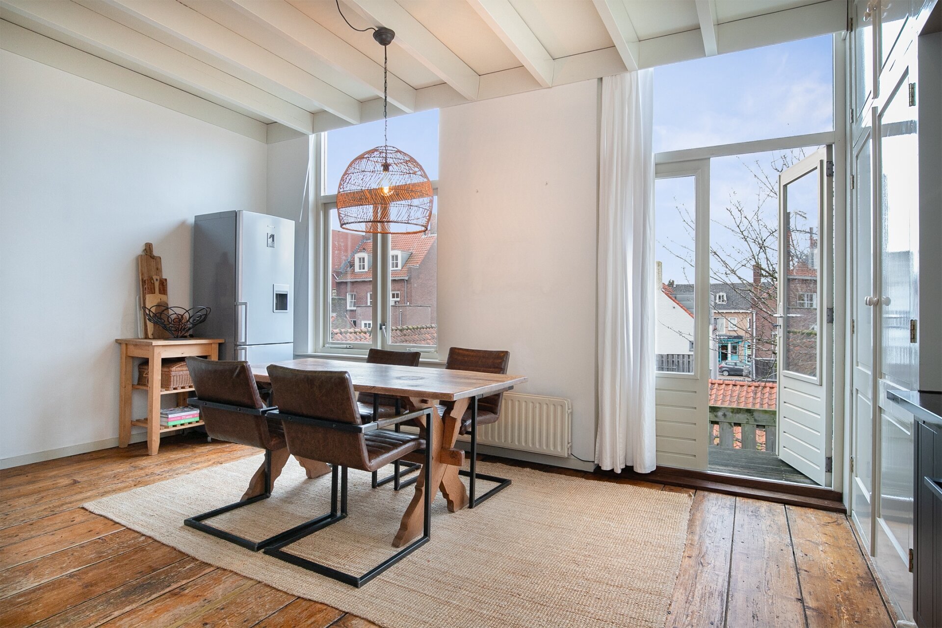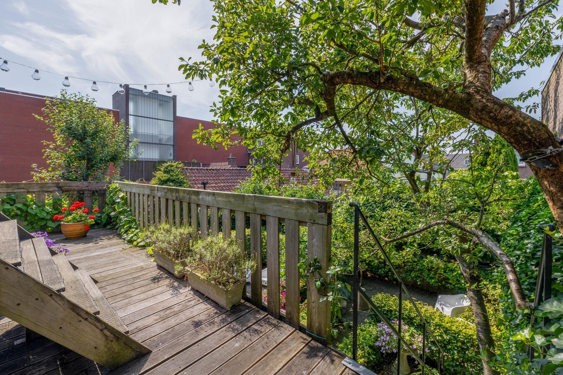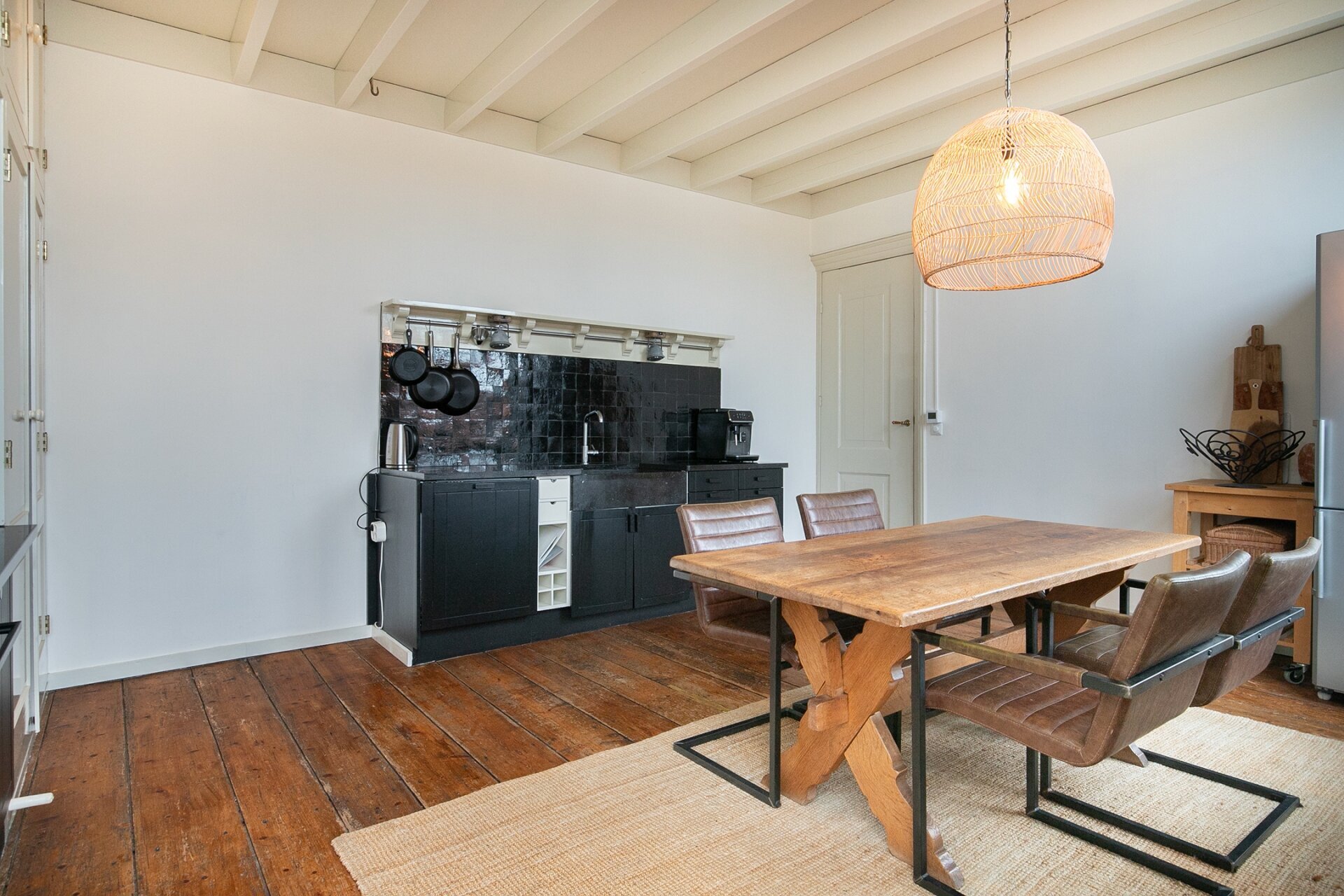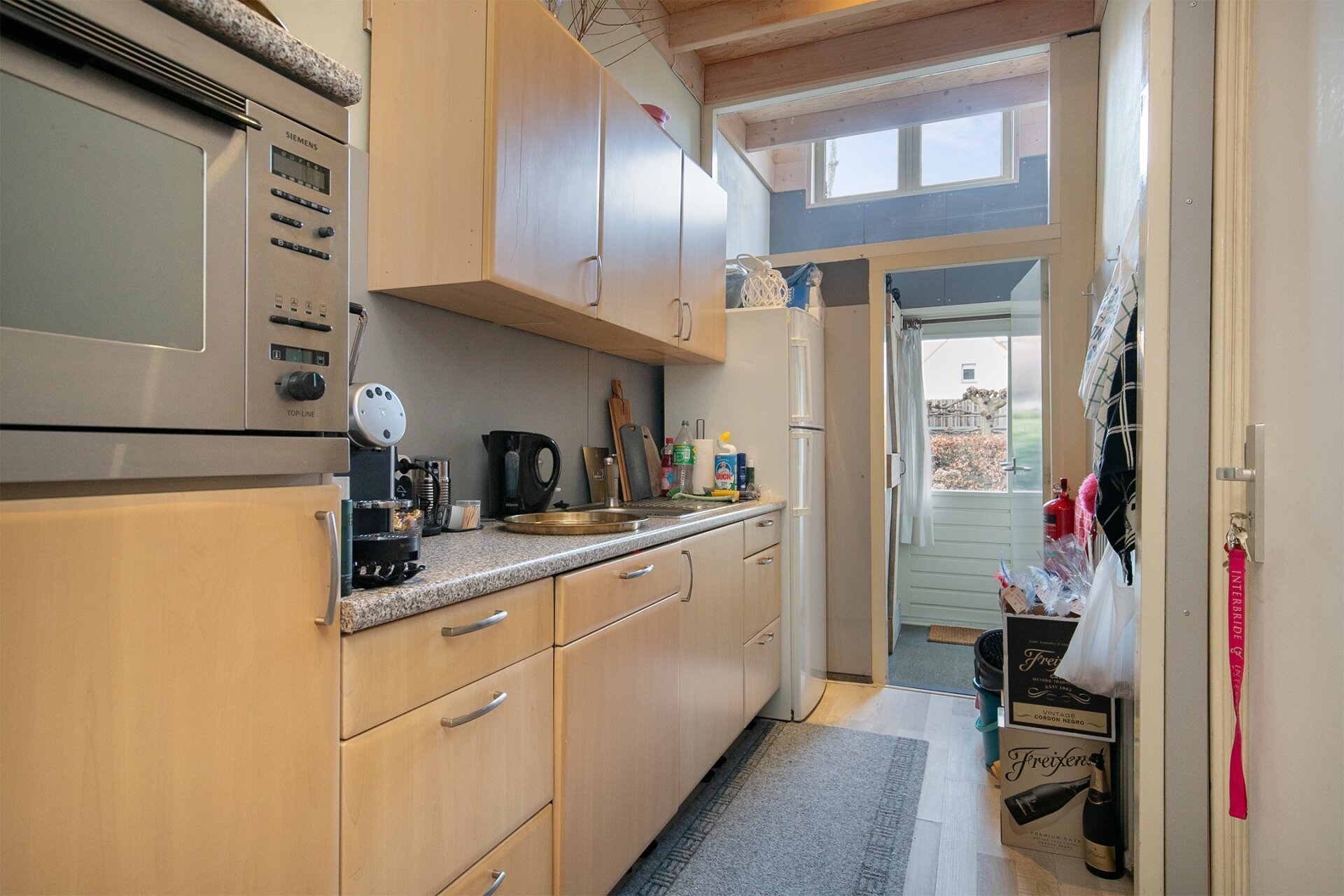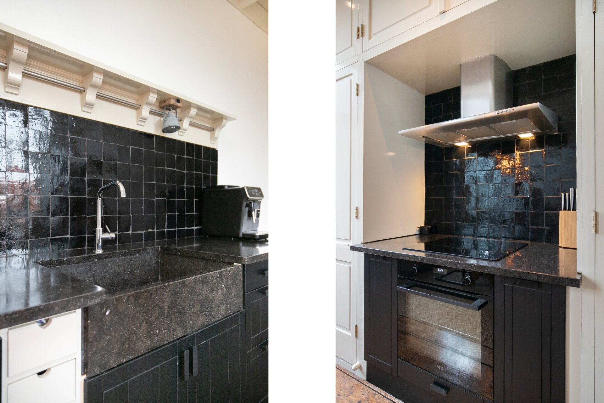 Aan de achterzijde van de woning vindt u de prachtige woonkeuken, die zeer stijlvol is ingericht. De keuken heeft een hoog keukenblok met oven, inductiekookplaat, afzuigkap en veel kastruimte, en een laag keukenblok met vaatwasser en een mooie spoelbak met kraan. De combinatie van witte en zwarte kleuren past uitstekend bij de houten vloer van de keuken. Via de keuken bereikt u het ruime balkon van 17 m², dat ook via een trap vanaf het dakterras toegang biedt tot de achtertuin.