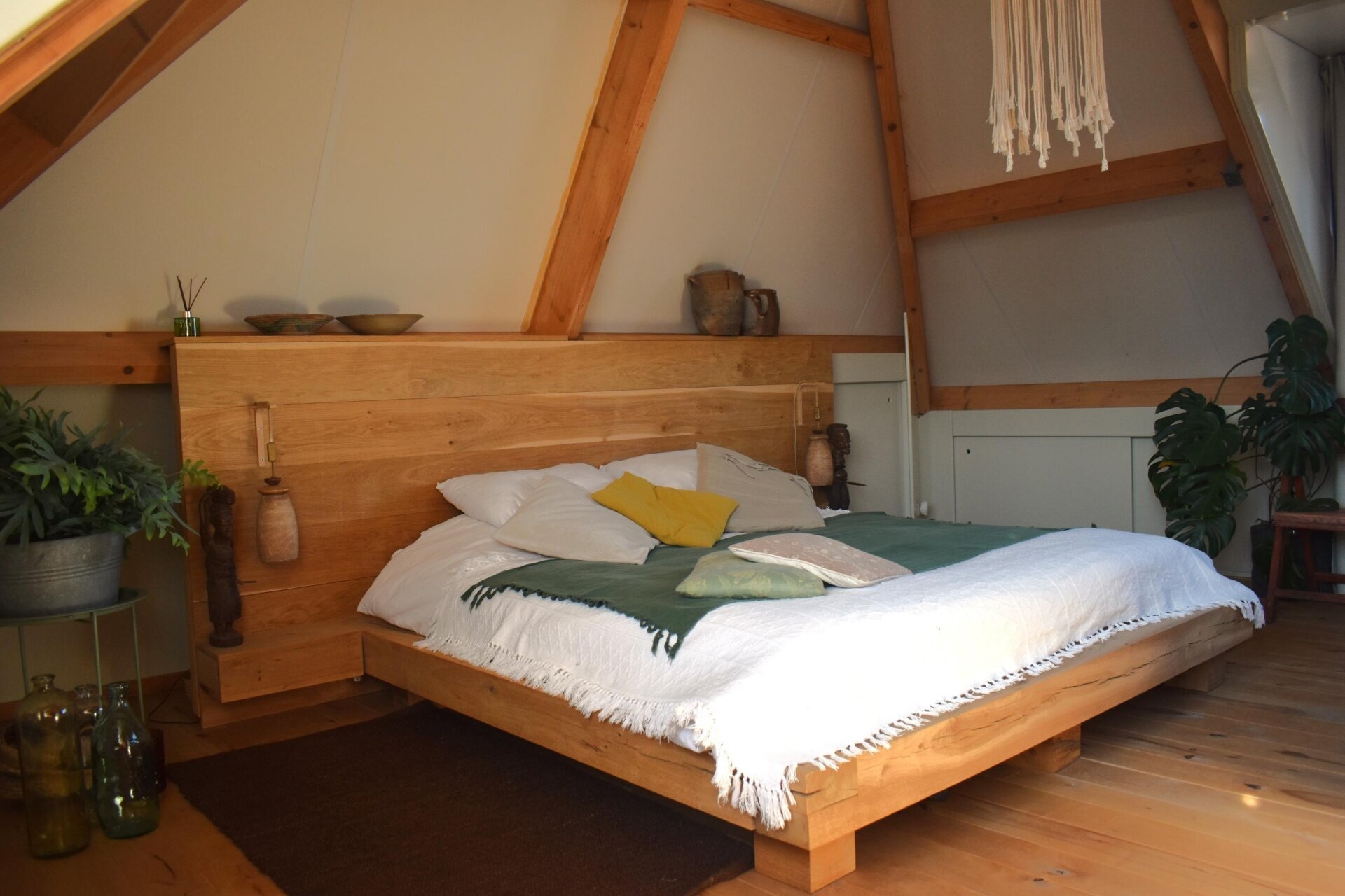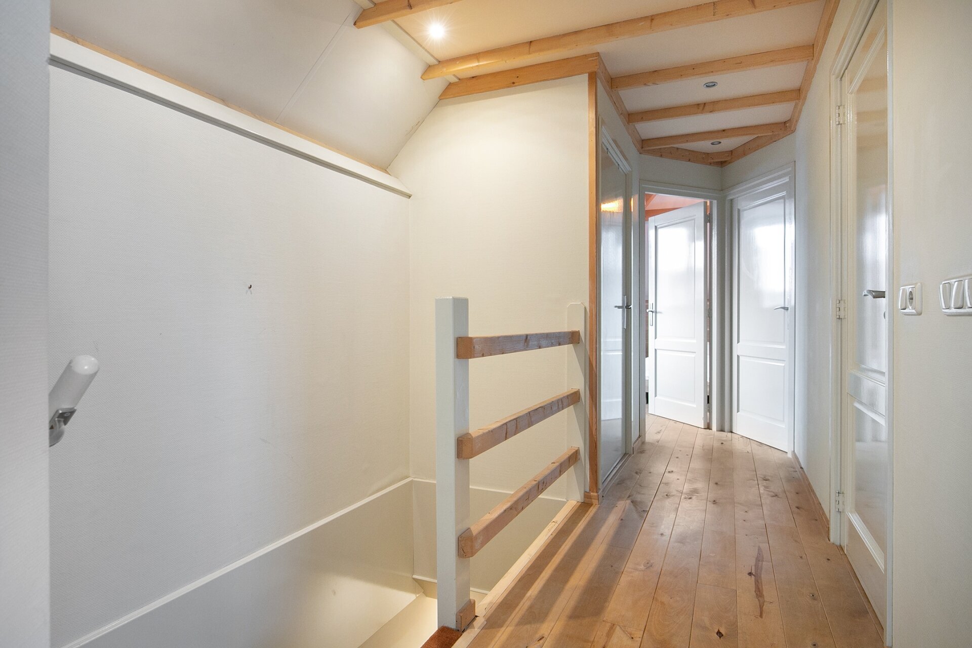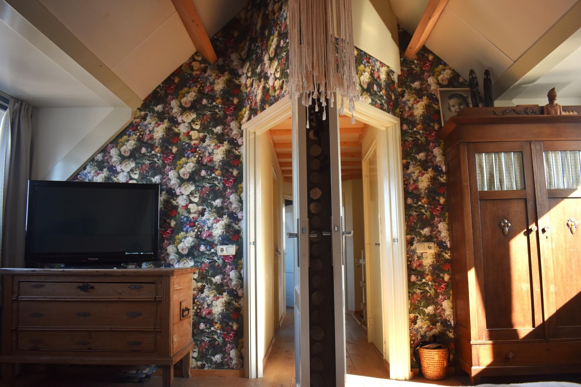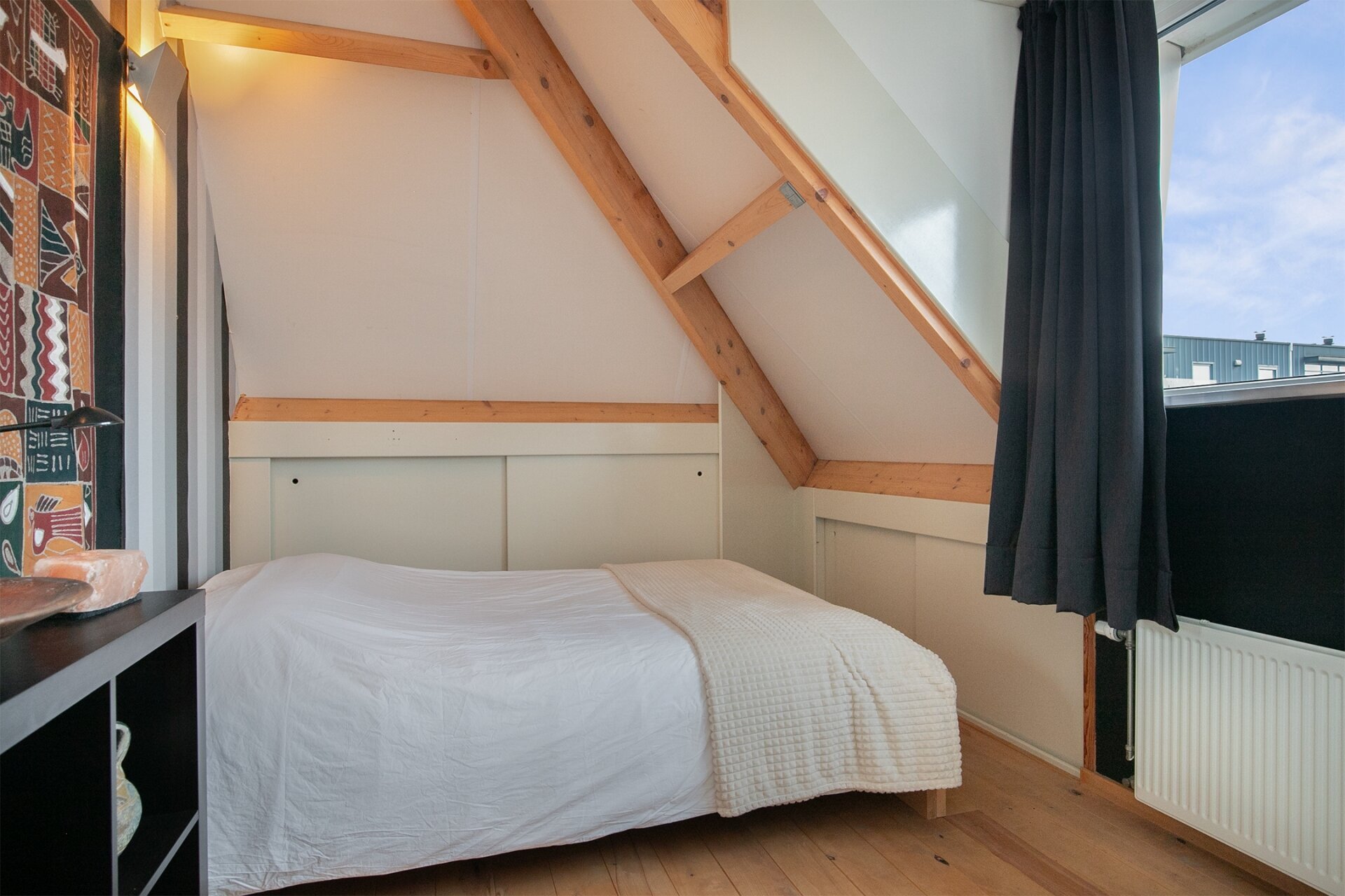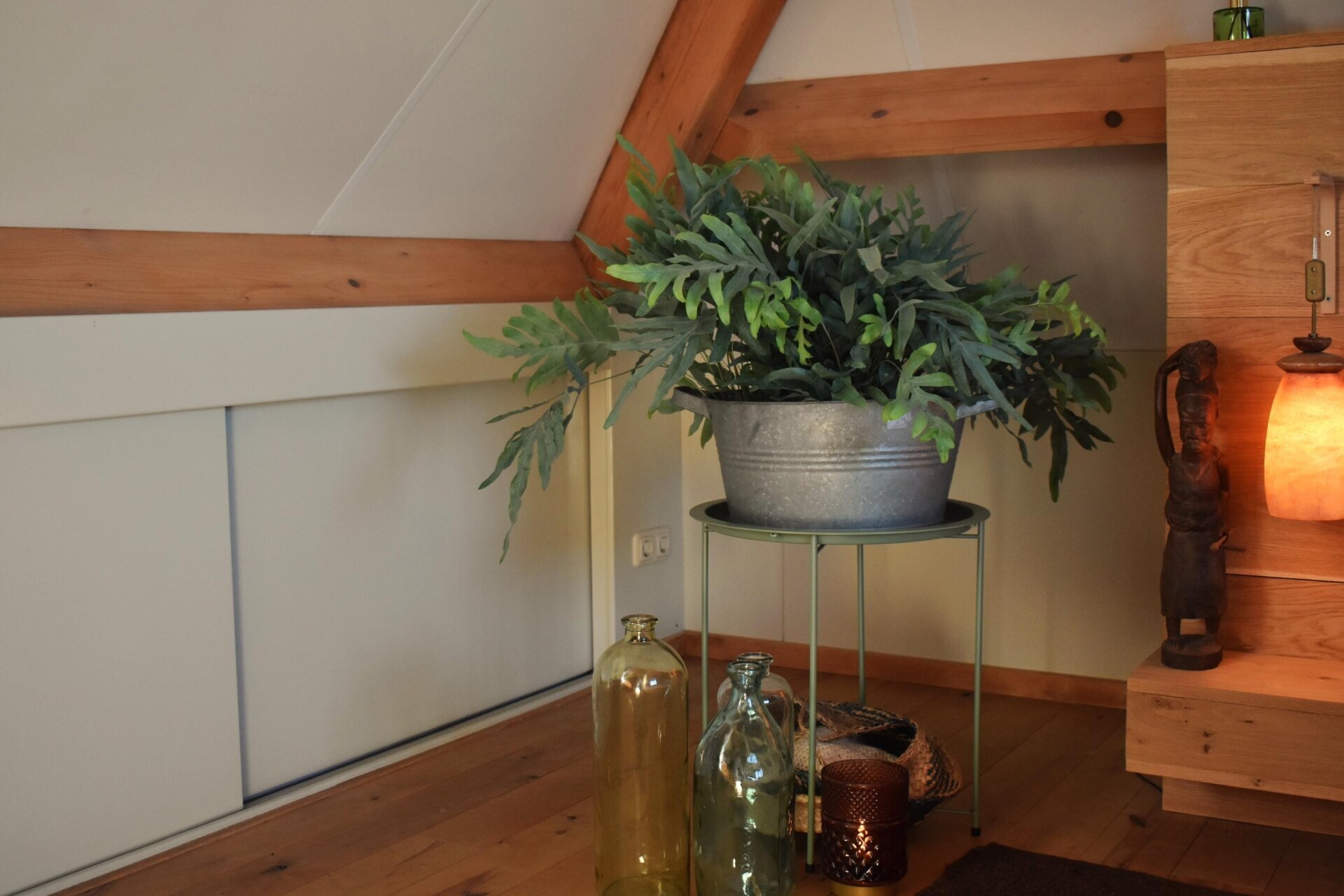 De masterbedroom bevindt zich aan de achterzijde en is heerlijk ruim dankzij de hoge nok en twee dakkapellen met kunststof ramen. De kamer heeft diverse knieschotten en via een luik is de bergzolder bereikbaar.