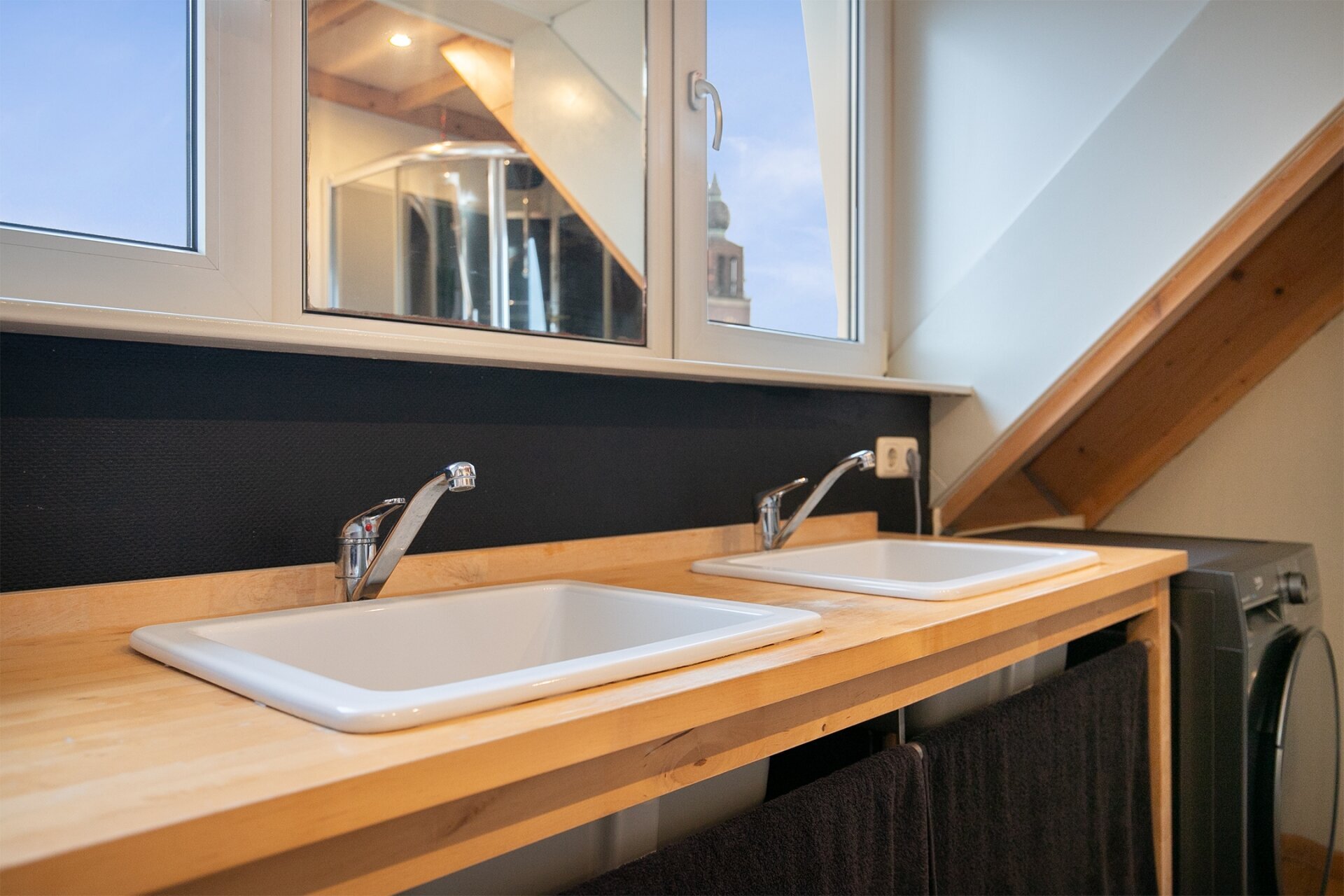 Op de tweede verdieping bevindt zich ook een moderne tweede badkamer, met zwevend toilet, dubbele wastafel en douchecabine. Tevens zijn hier de aansluitingen voor de wasmachine en droger.