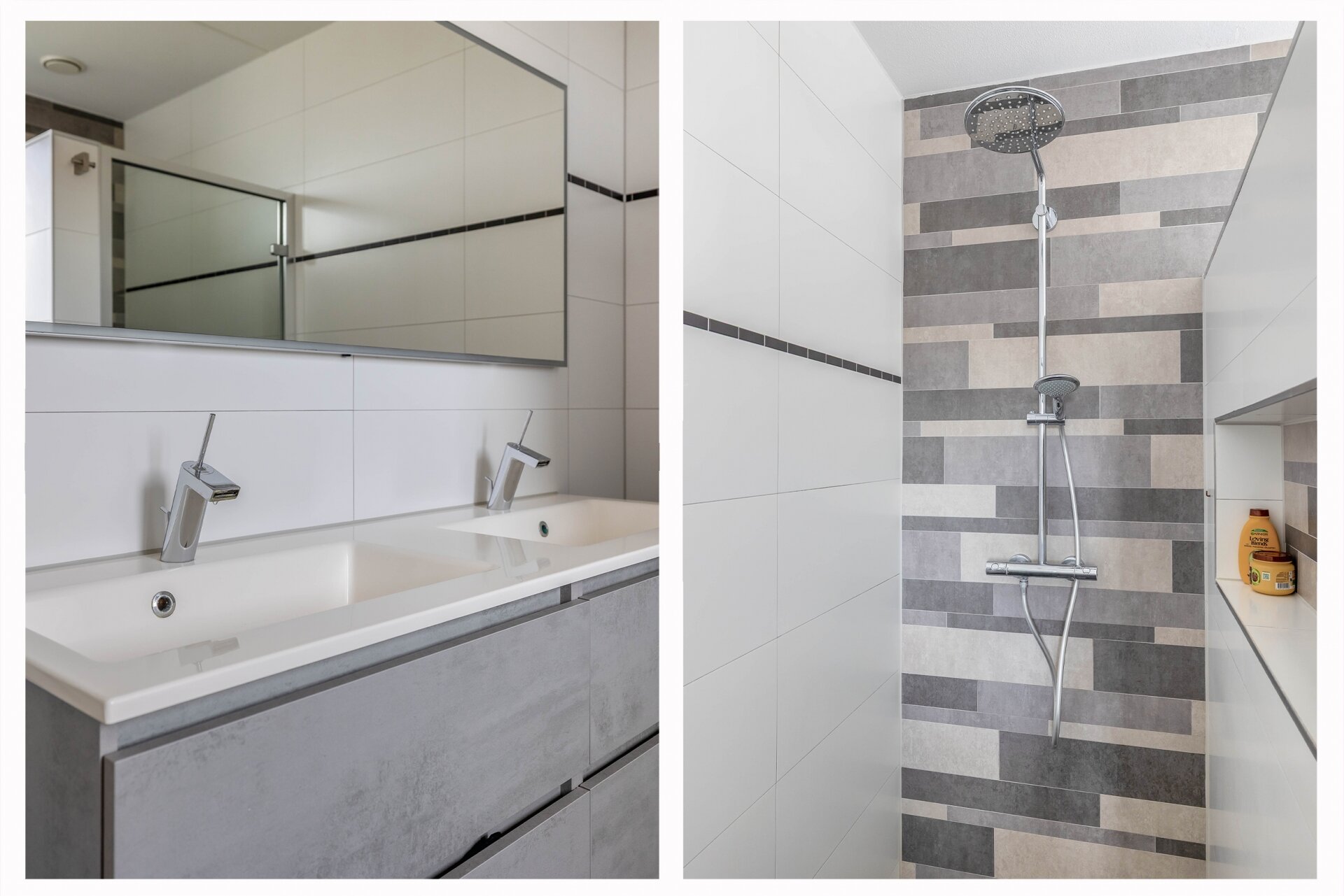 Op de eerste verdieping bevinden zich drie ruime slaapkamers, stuk voor stuk voorzien van een nette laminaatvloer en airconditioning – ideaal voor warme zomernachten en optimaal comfort het hele jaar door. De badkamer is ruim en luxe afgewerkt, volledig betegeld en voorzien van een hangend toilet, een dubbele wasbak en moderne sanitaire voorzieningen.