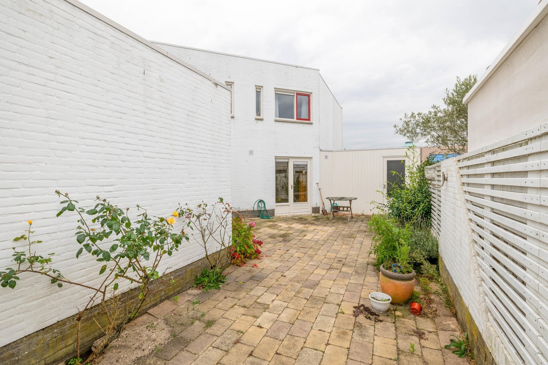 De woonkamer, keuken en slaapkamer bieden toegang tot de achtertuin. De tuin biedt veel privacy en is gelegen op het noordwesten. Dit maakt het mogelijk om tot laat van de zon te kunnen genieten. Verder beschikt de tuin over een berging en een buitenkraan.