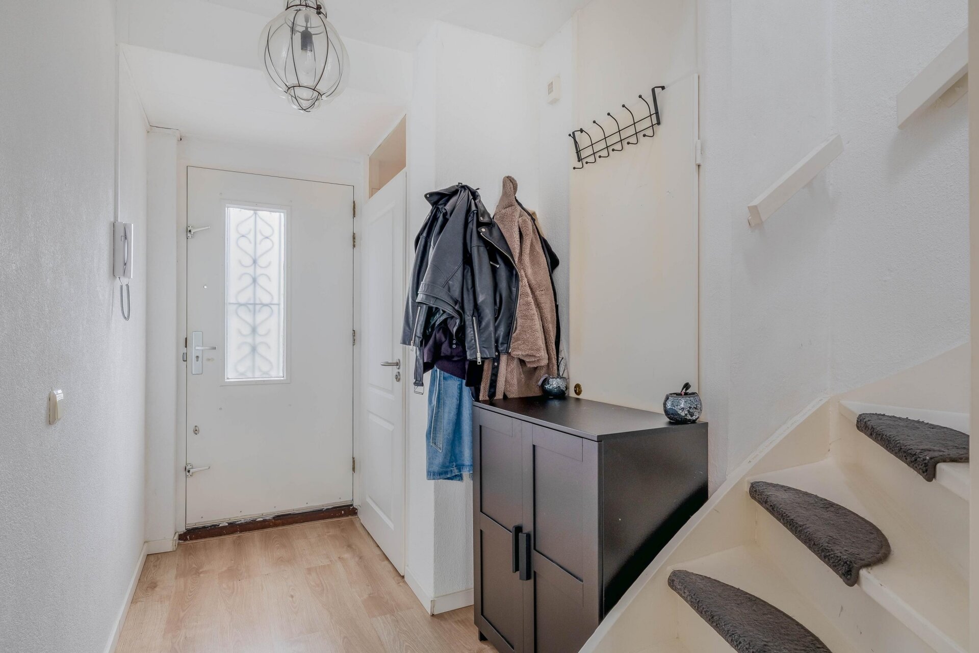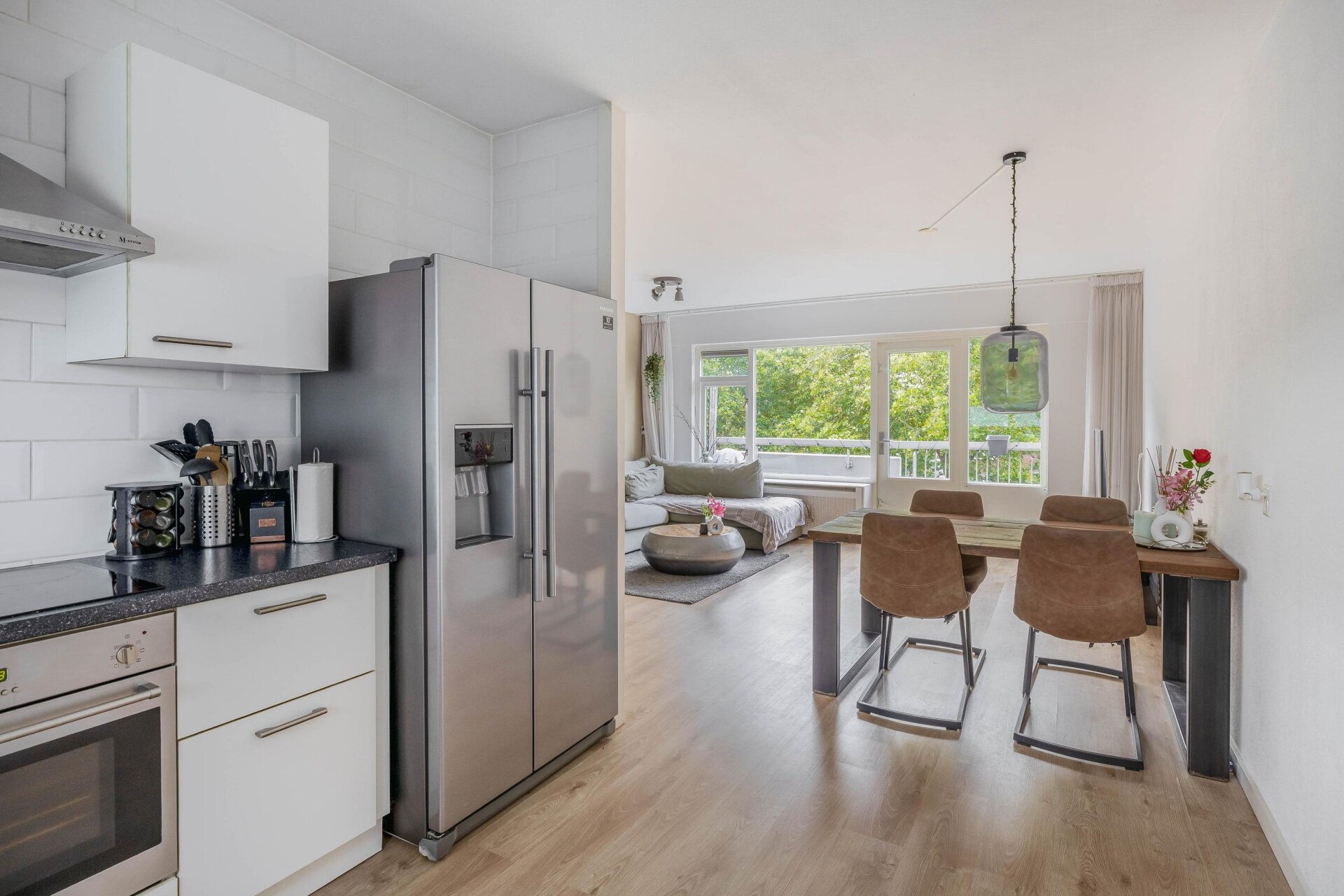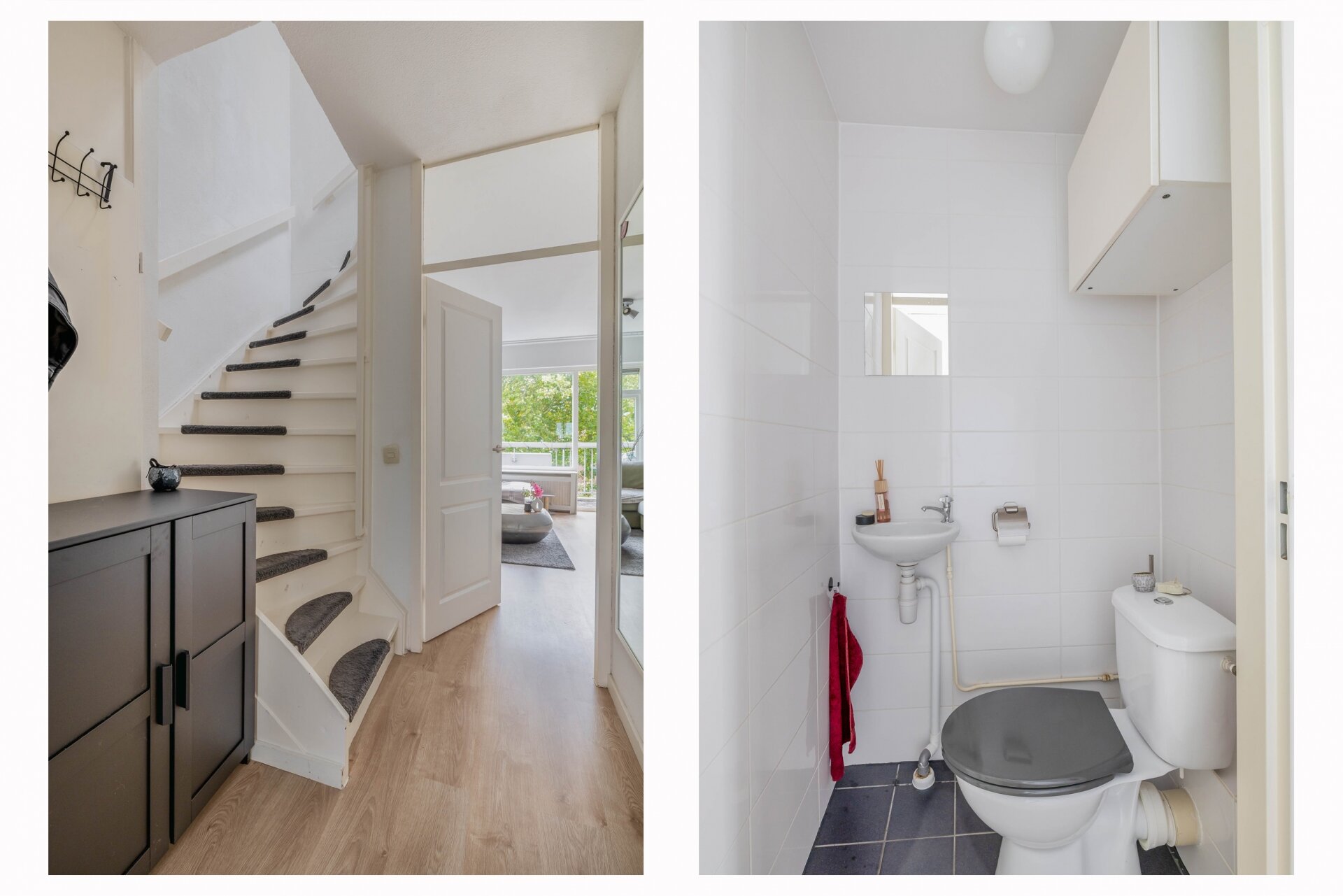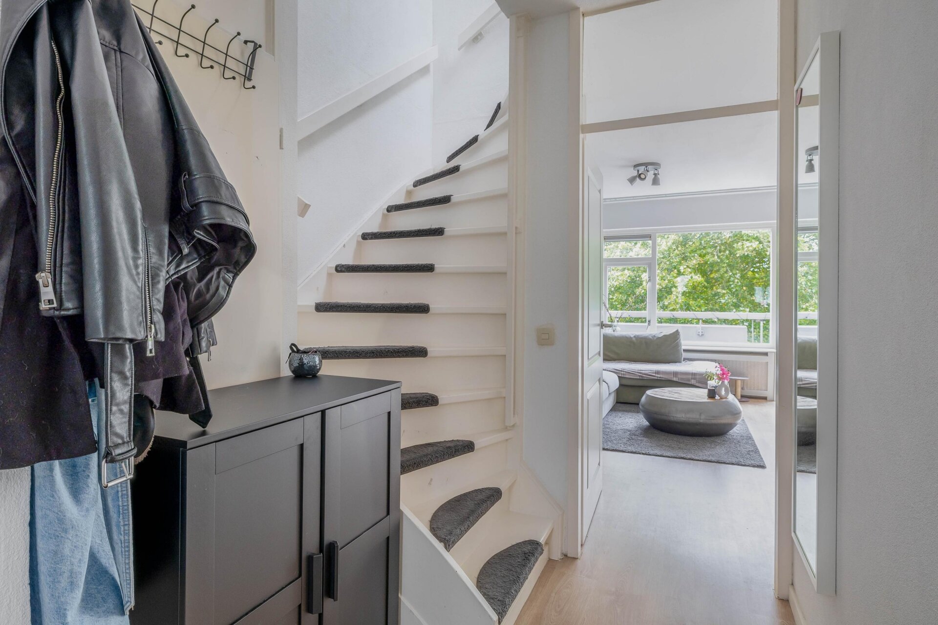 Via de entree kom je in de hal met meterkast, toilet met fonteintje en de trapopgang naar de verdieping. De lichte woonkamer valt direct op door de grote raampartijen en het groene uitzicht. Een praktische trapkast biedt extra bergruimte en via de woonkamer is er toegang tot het zonnige balkon.