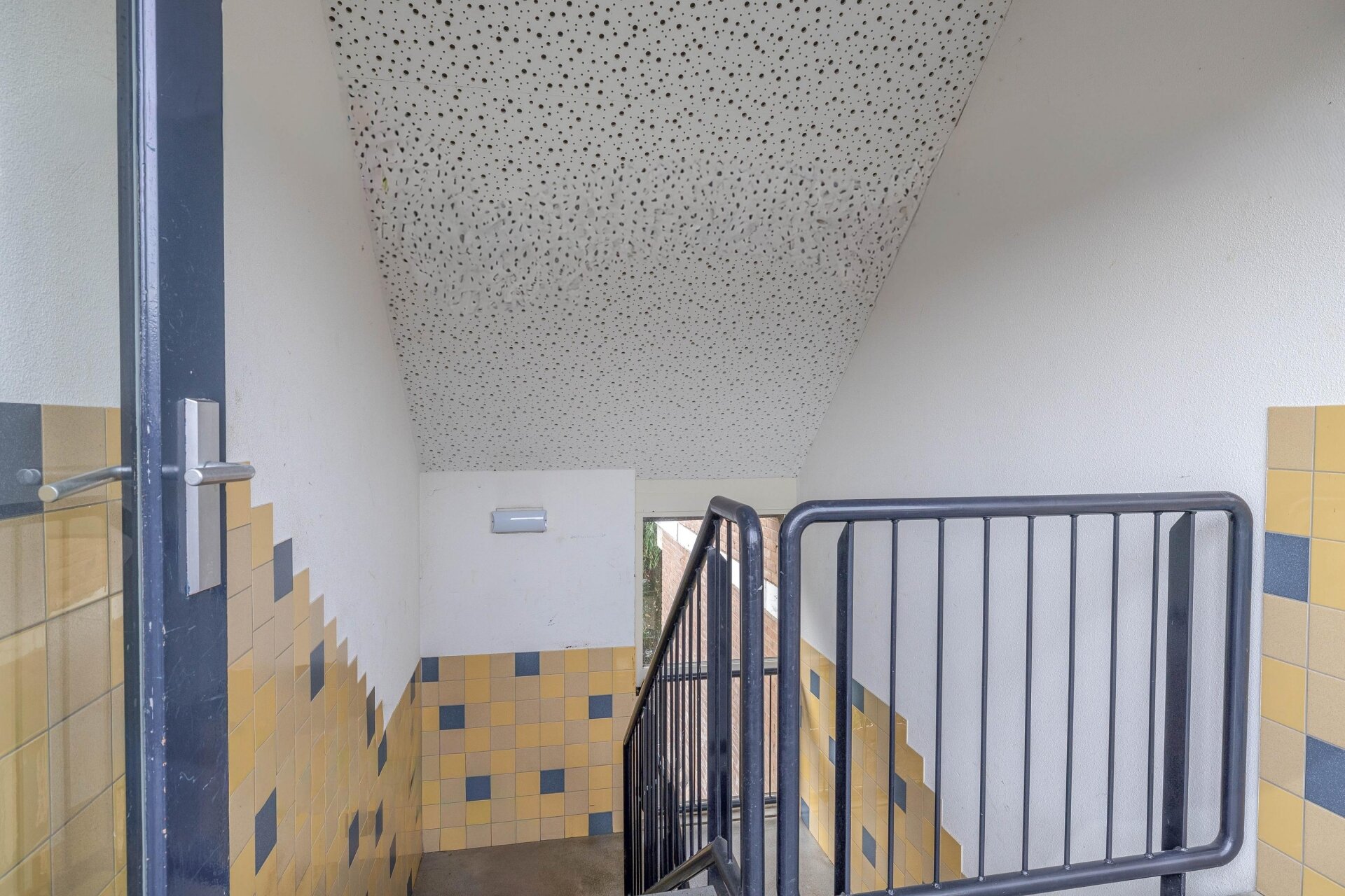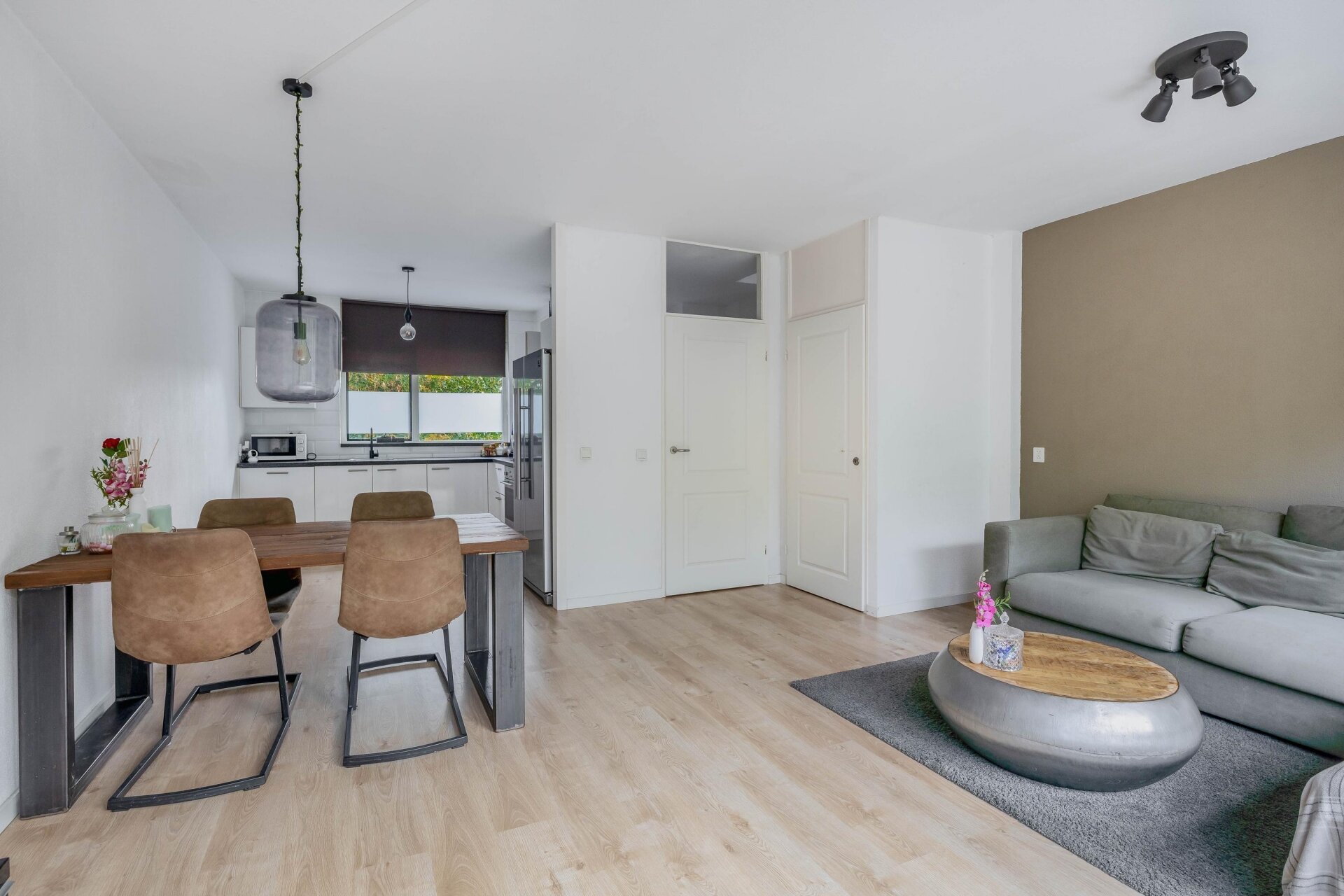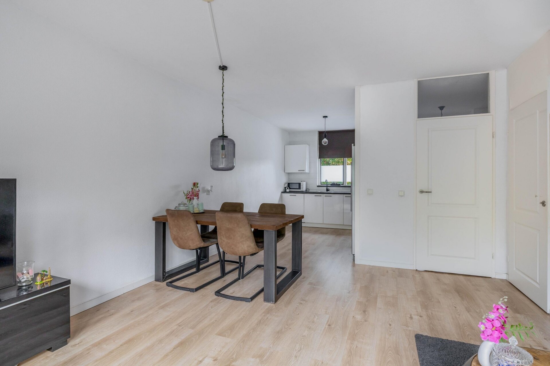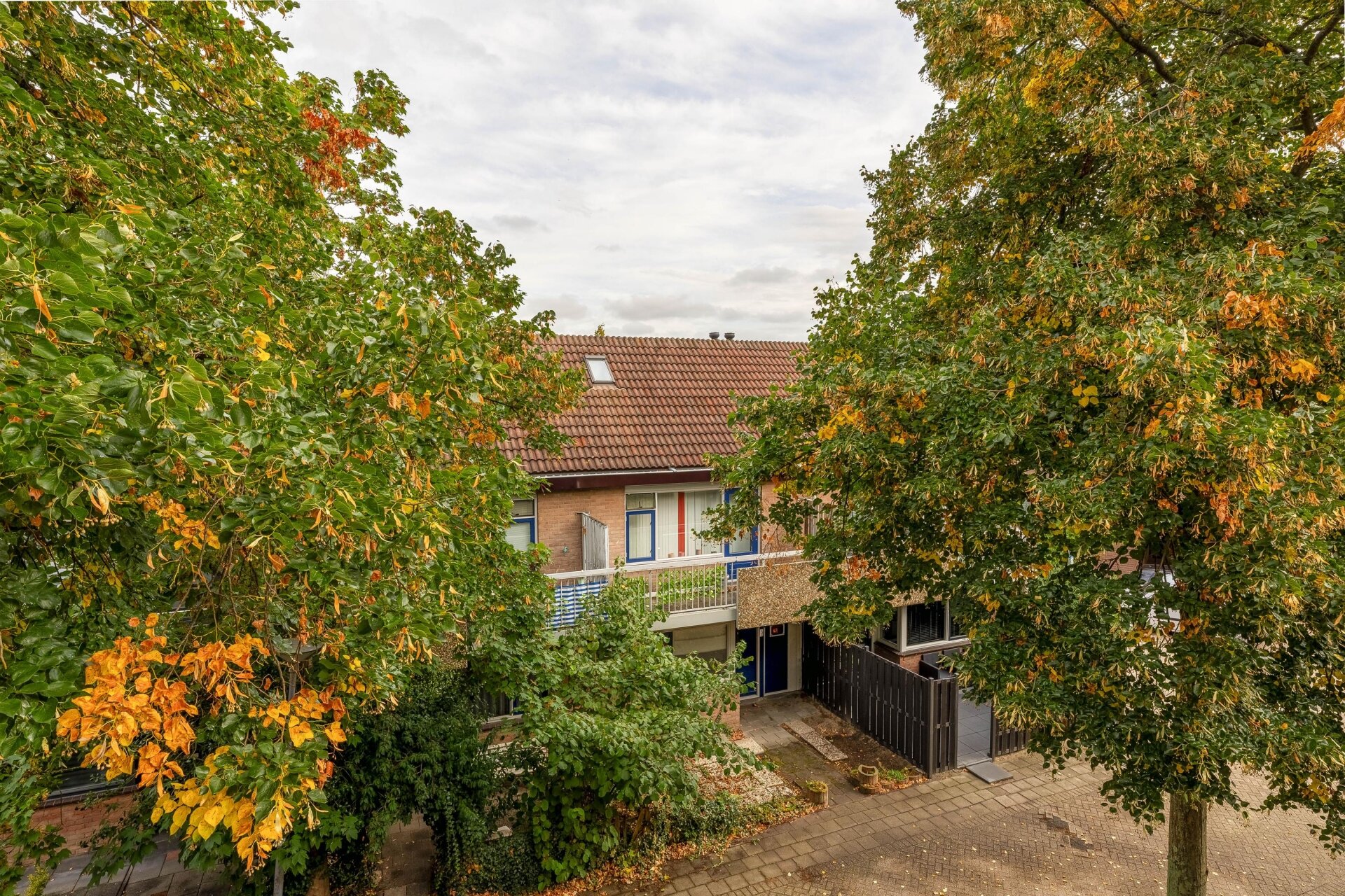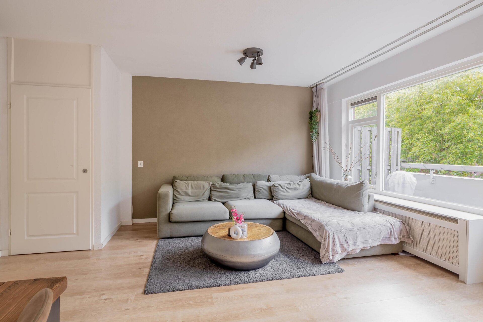 Via de entree kom je in de hal met meterkast, toilet met fonteintje en de trapopgang naar de verdieping. De lichte woonkamer valt direct op door de grote raampartijen en het groene uitzicht. Een praktische trapkast biedt extra bergruimte en via de woonkamer is er toegang tot het zonnige balkon.