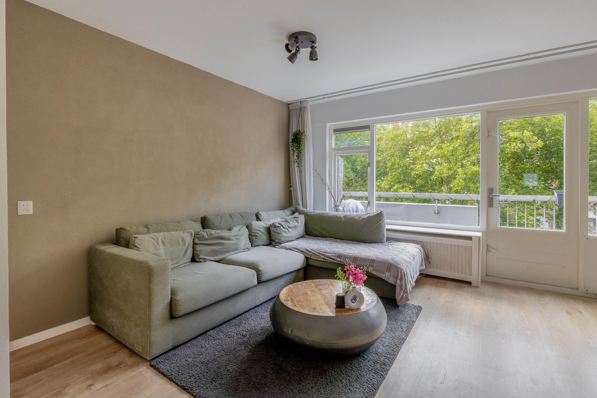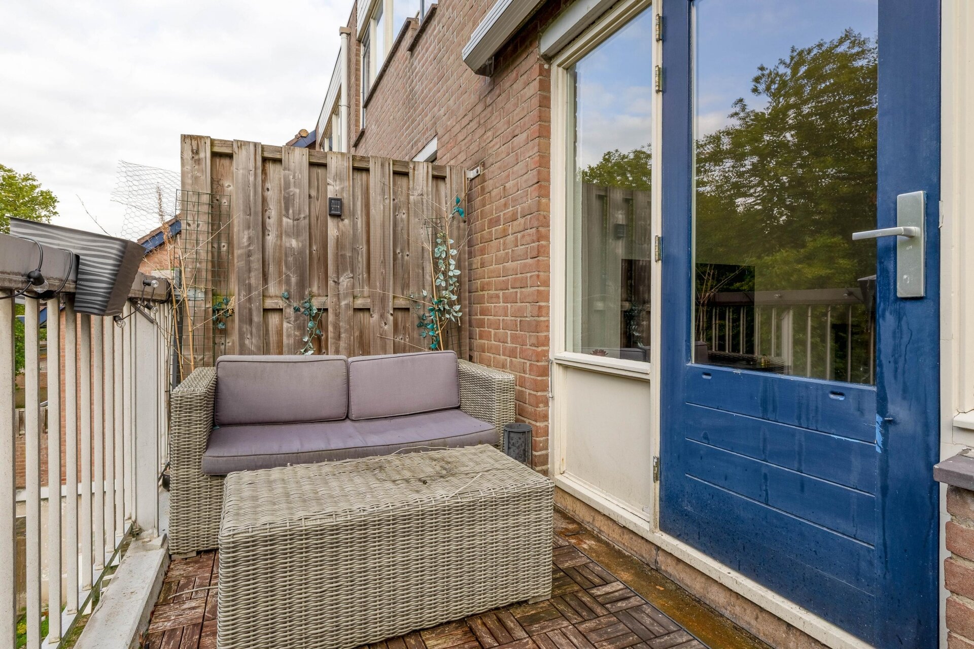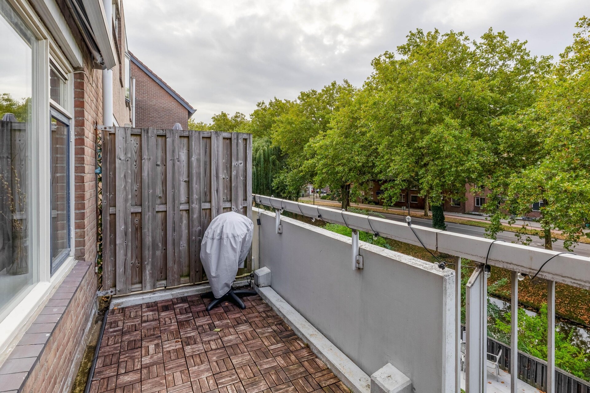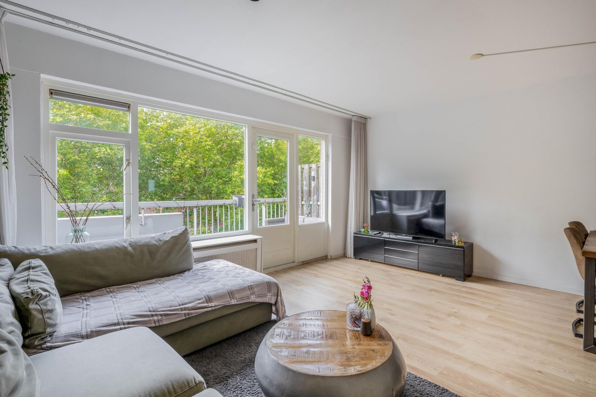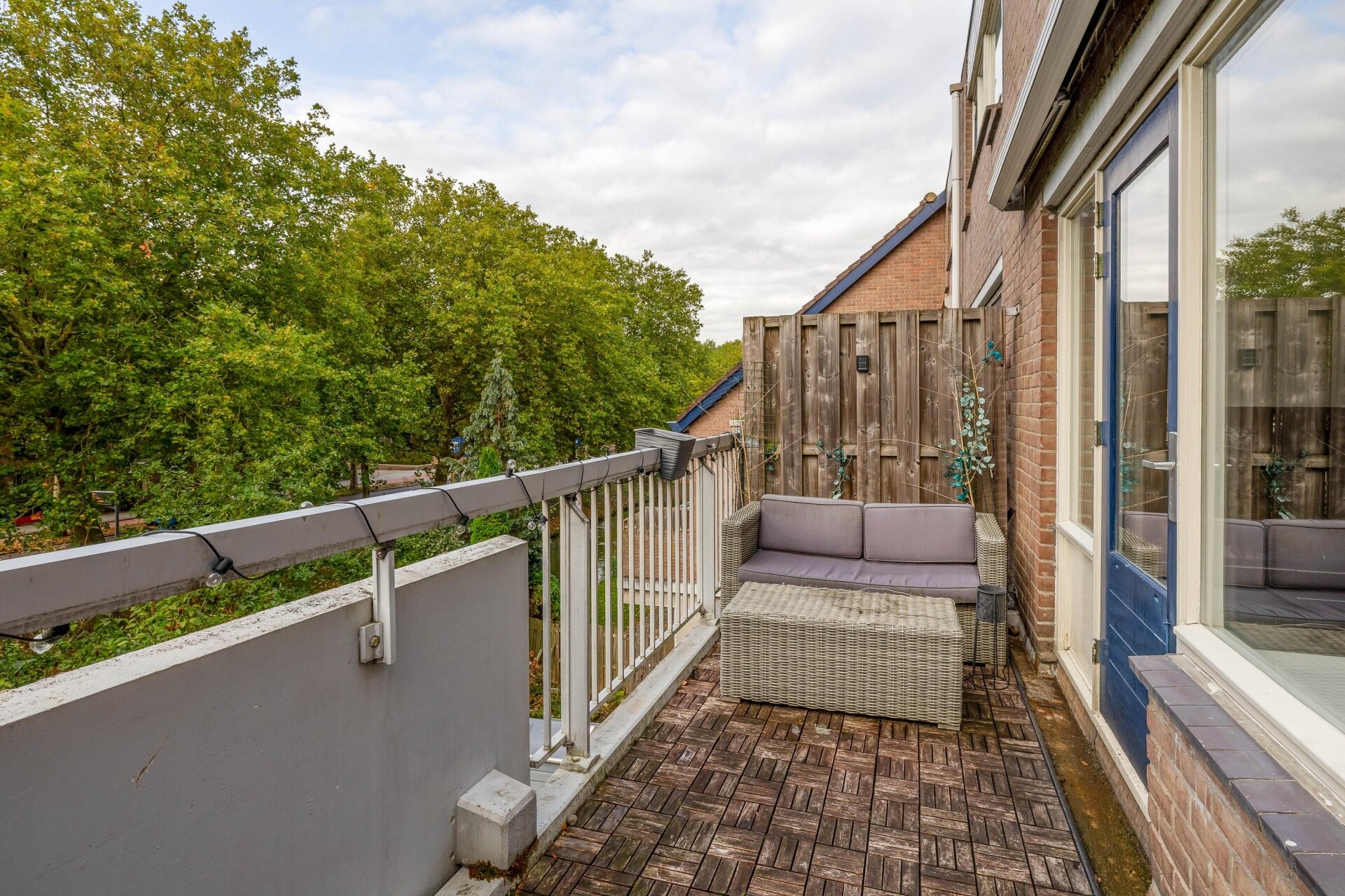 Het balkon, gelegen op het zuiden, is een heerlijke plek om te genieten van de zon en biedt een mooi uitzicht op het groen.