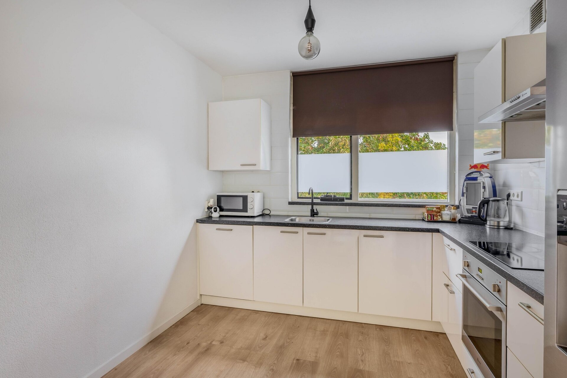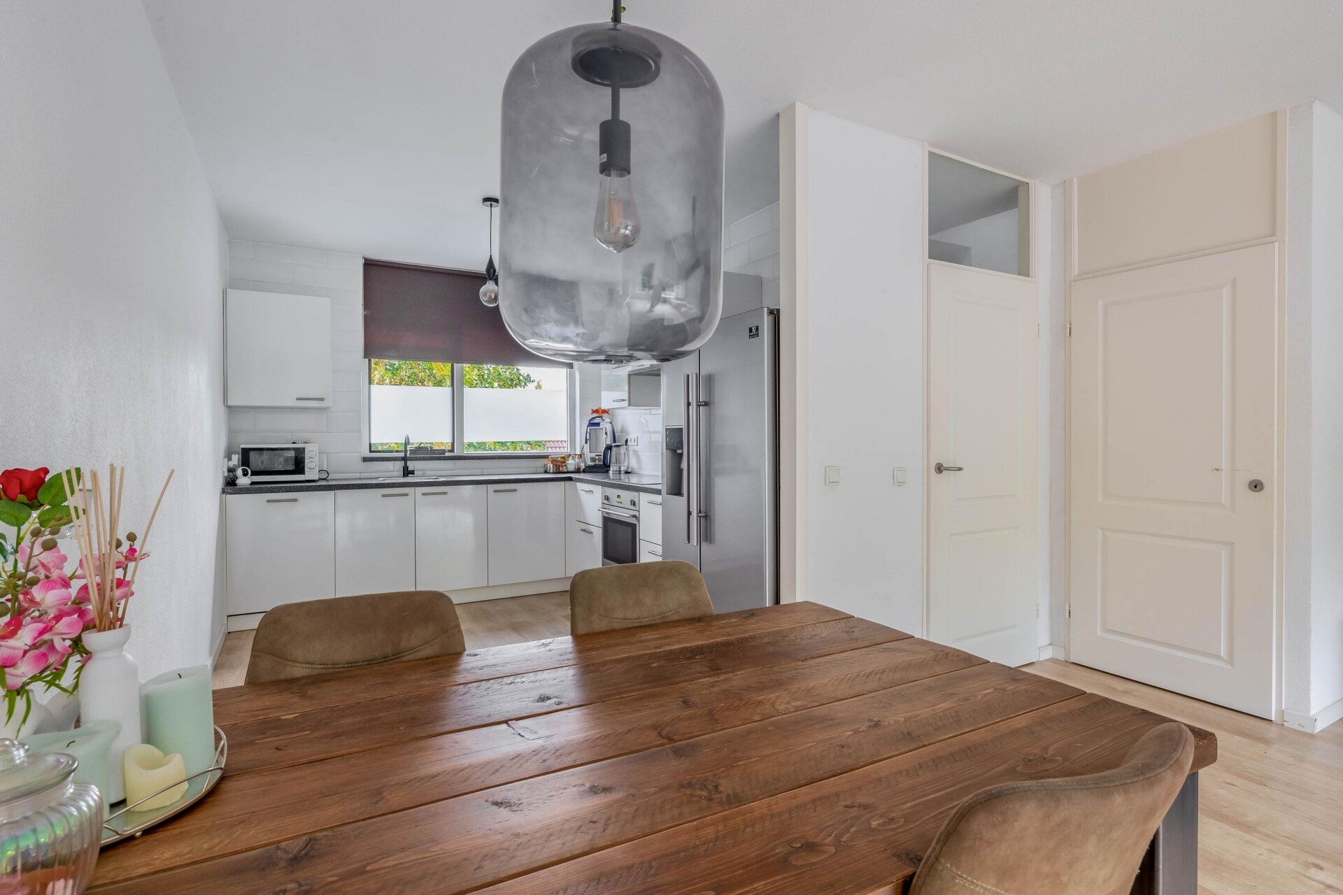 Aan de voorzijde bevindt zich de keuken in L-opstelling, voorzien van diverse inbouwapparatuur zoals een vaatwasser, elektrisch fornuis met oven, Amerikaanse koelkast en afzuigkap.
