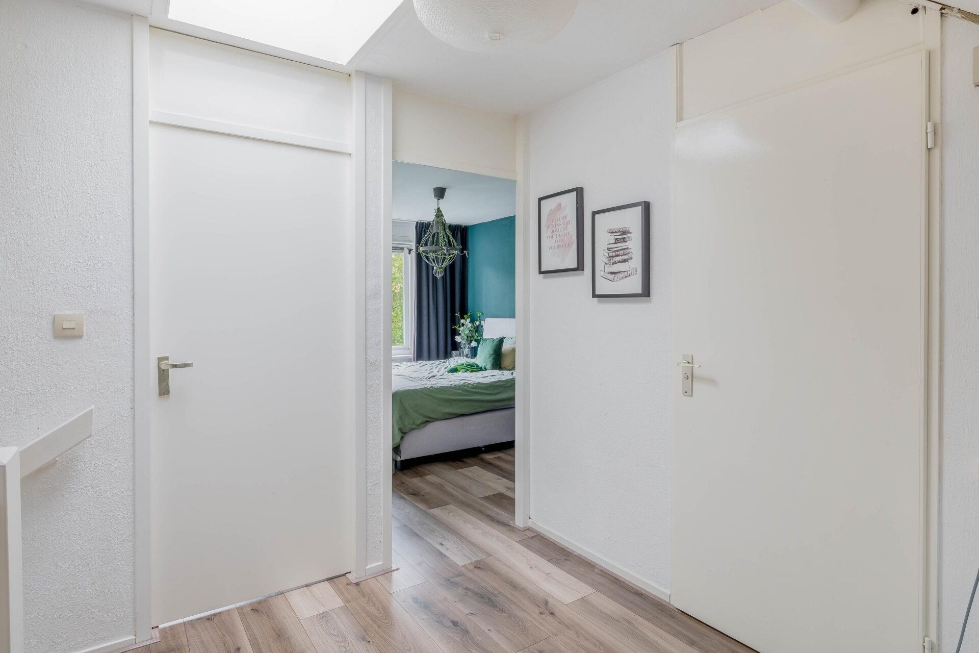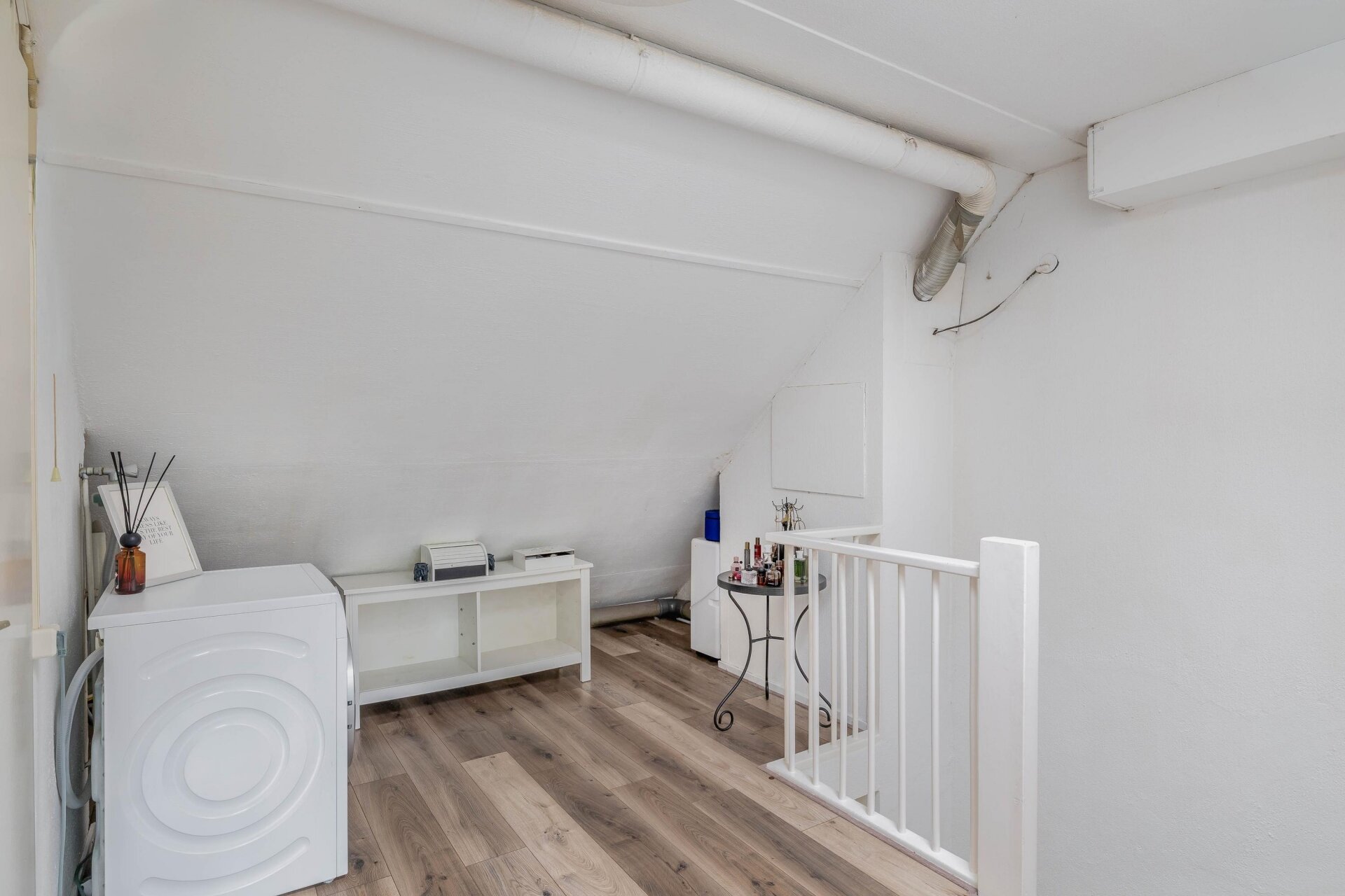 De ruime overloop met lichtkoepel biedt niet alleen veel licht, maar ook ruimte voor een leuke werk- of hobbyplek. Hier zijn tevens de aansluitingen voor wasmachine en droger aanwezig.