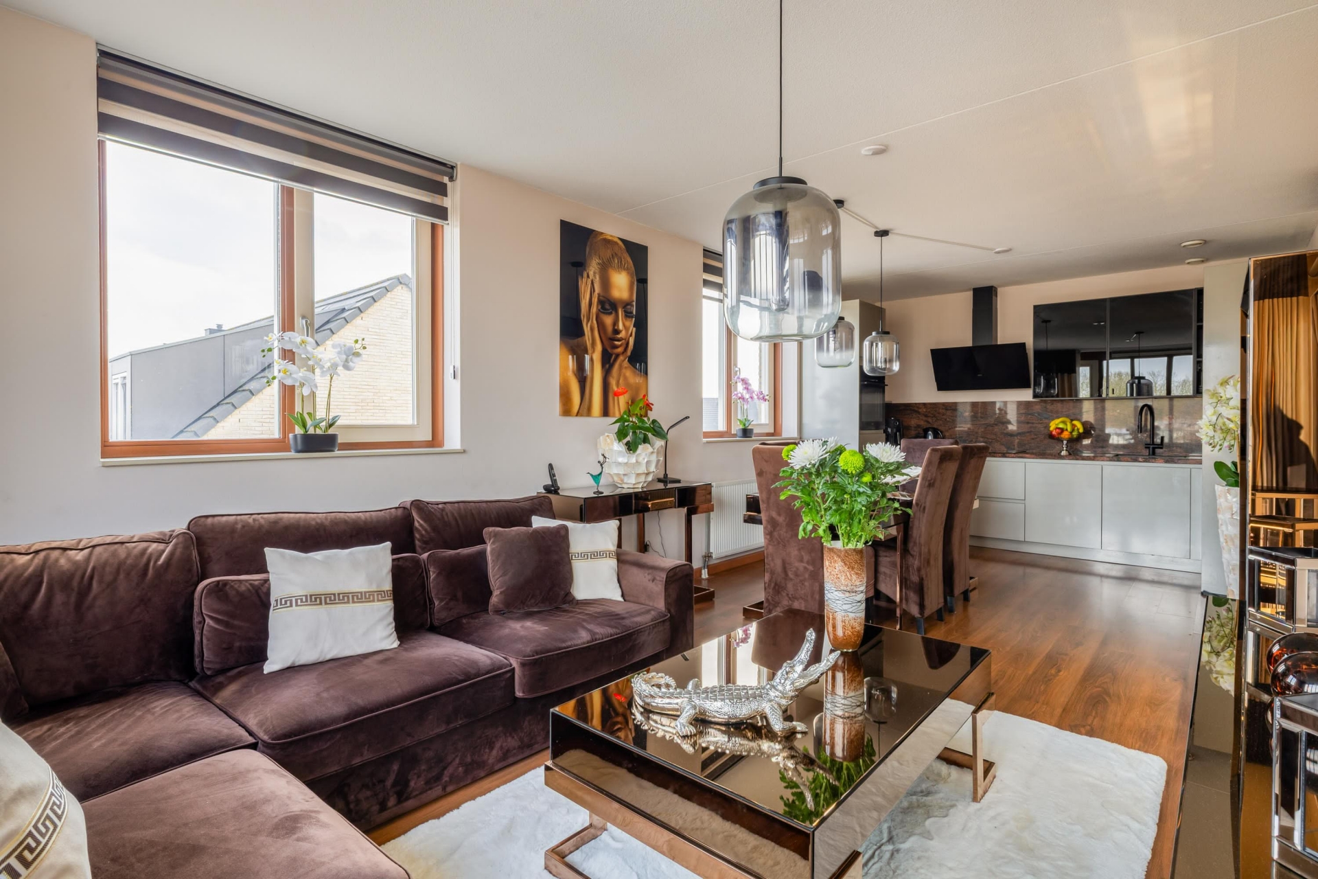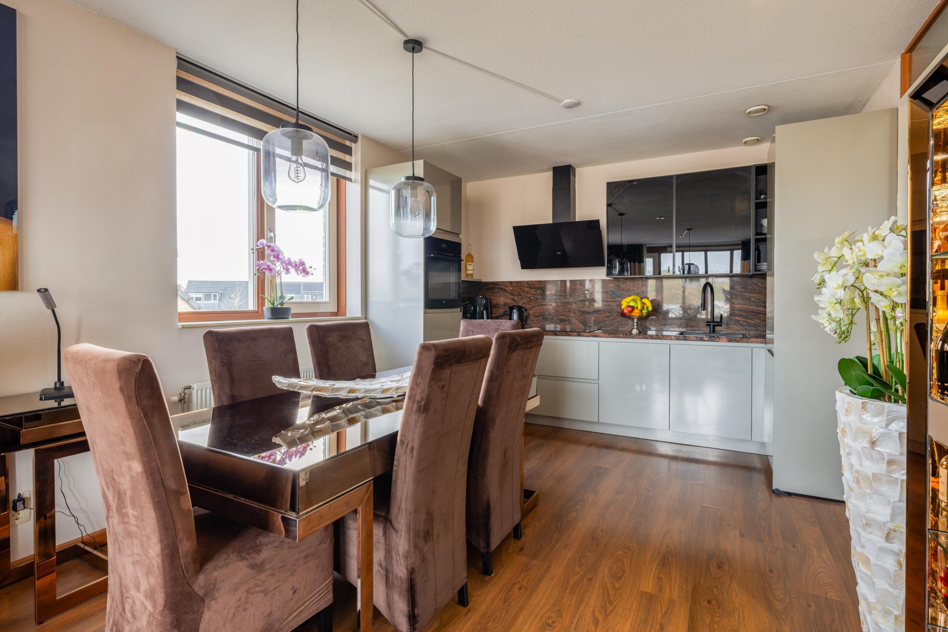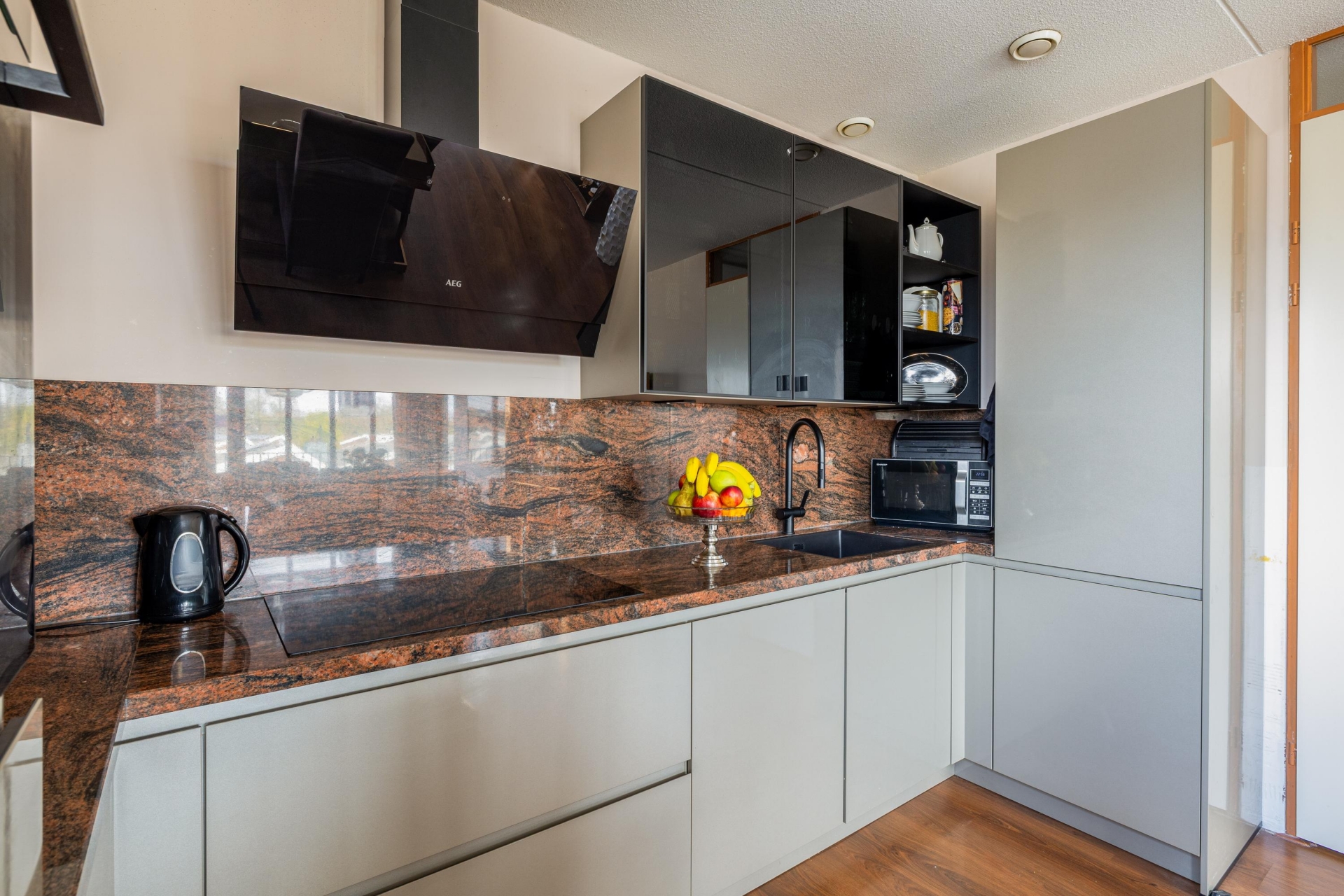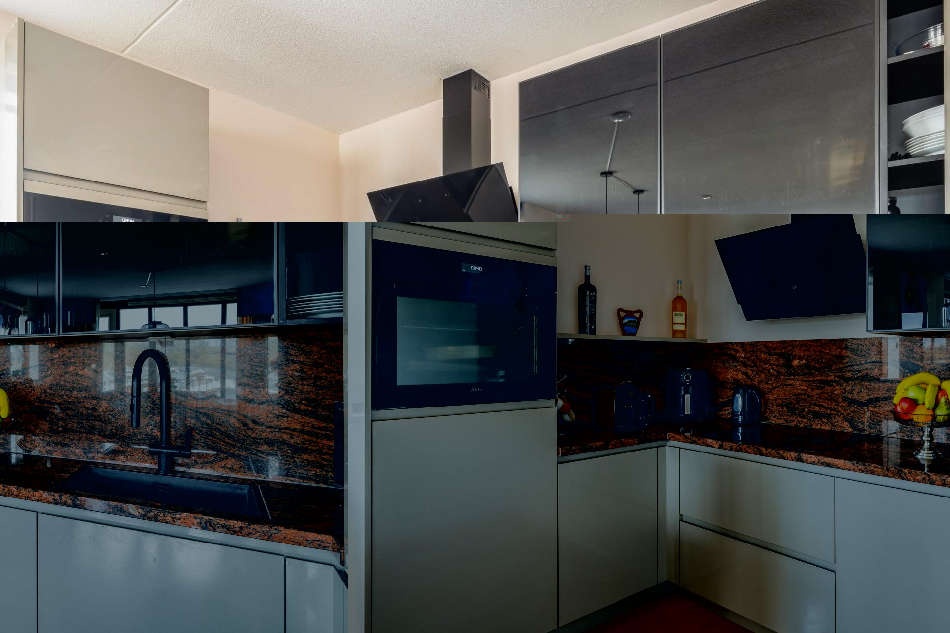 De open opstelling zorgt ervoor dat je contact houdt met de woonkamer, wat prettig is als je gasten ontvangt of gewoon gezellig samen bent. De combinatie van materialen en kleuren geeft de keuken een luxe uitstraling die perfect past bij de rest van het appartement.