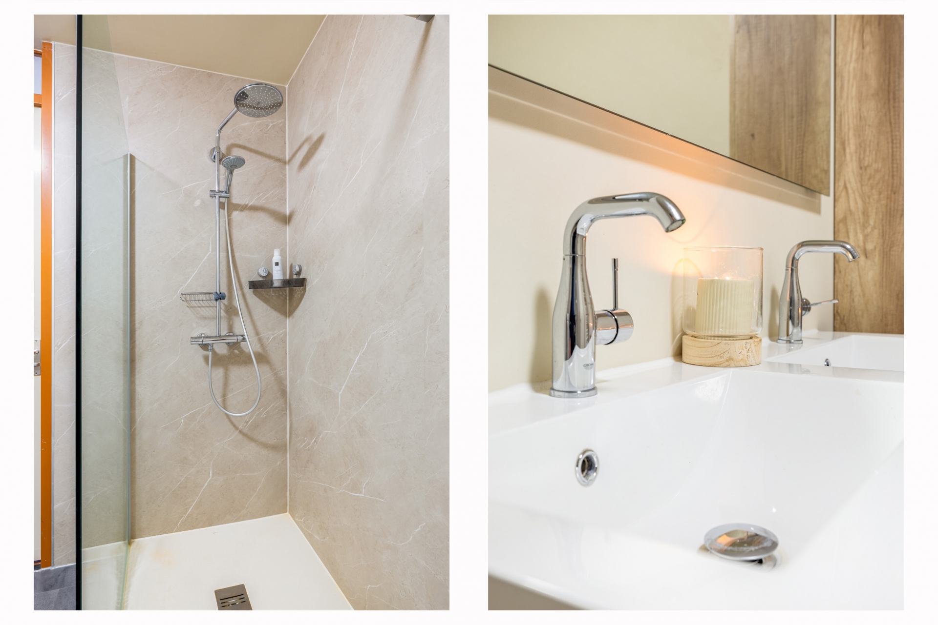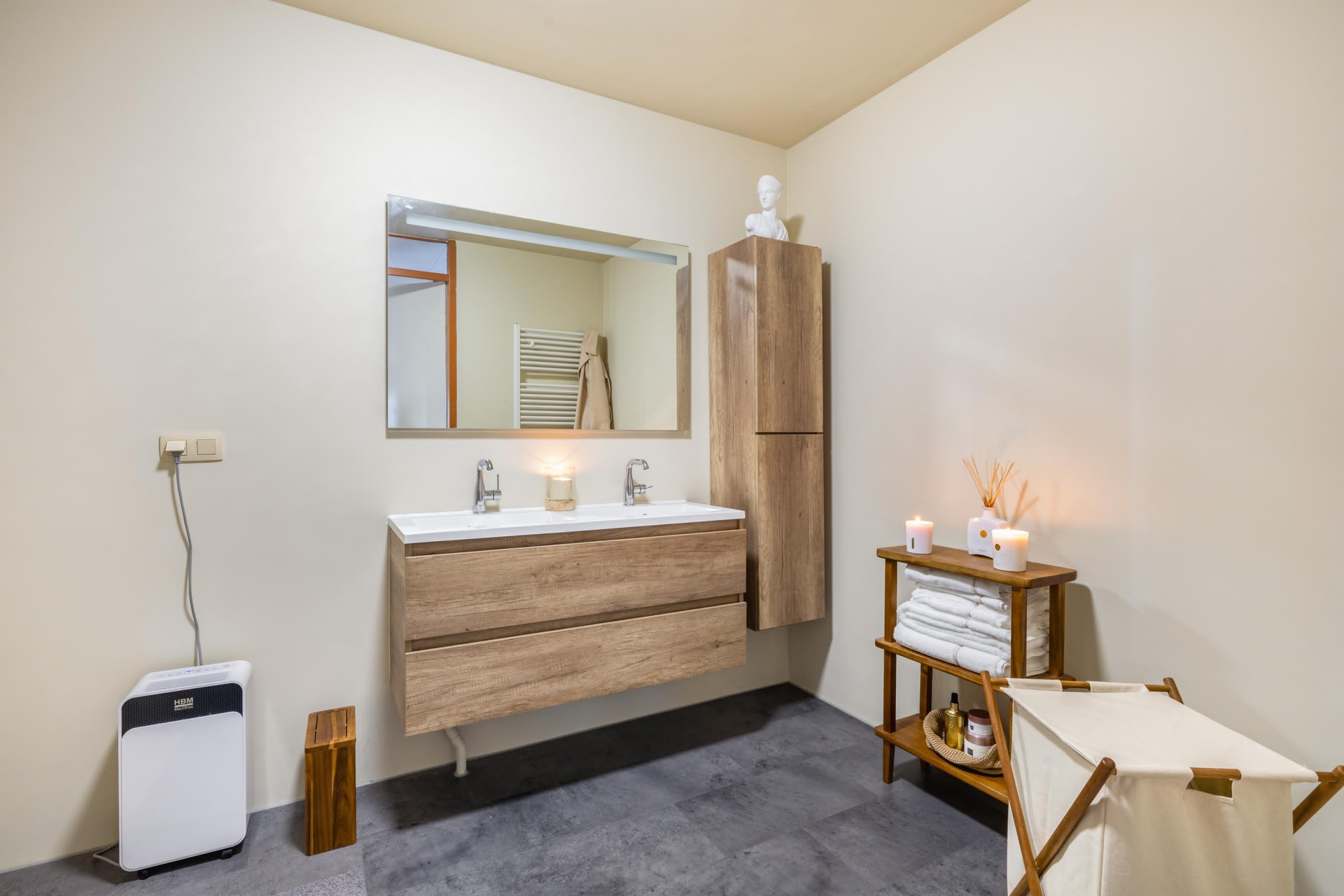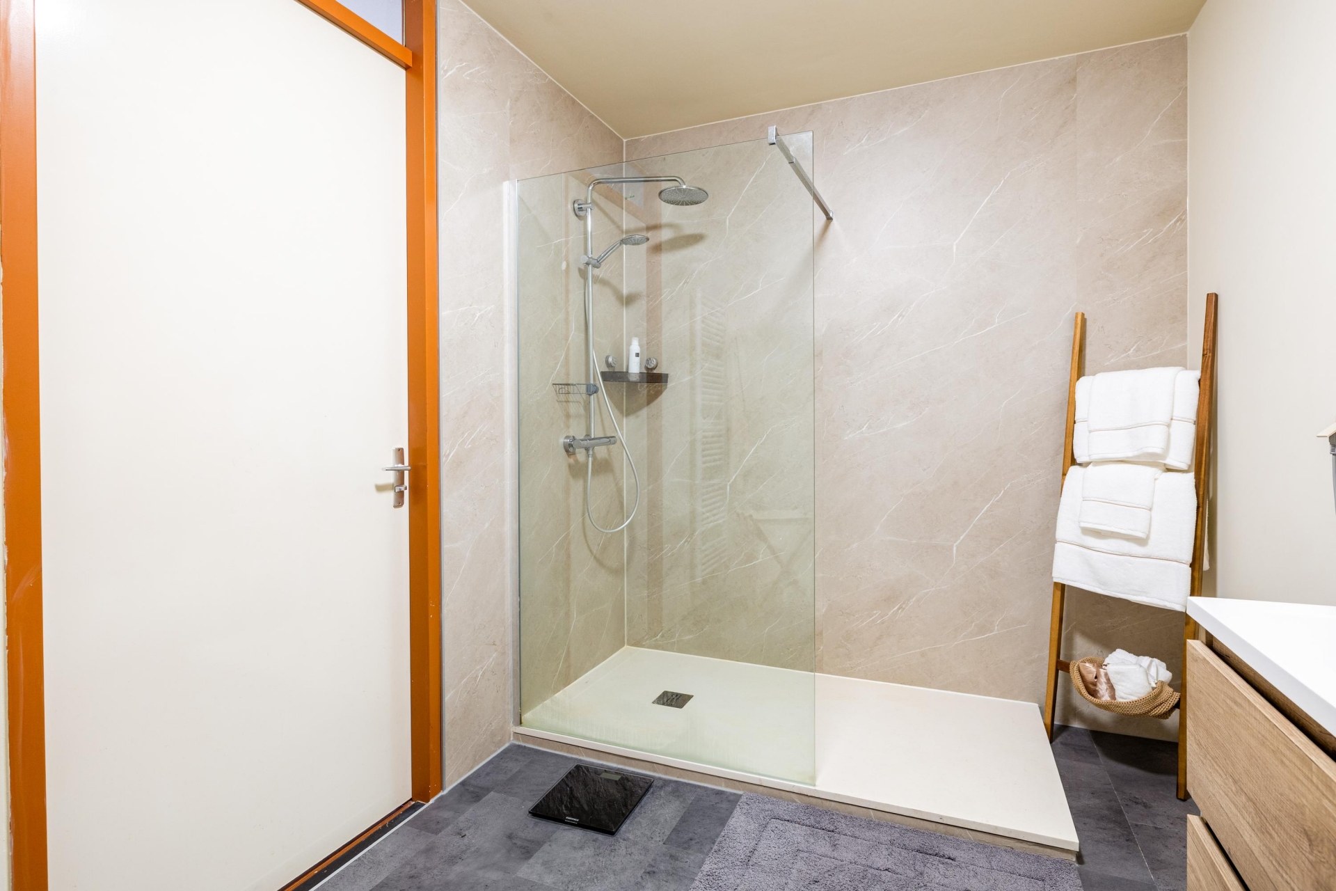 De badkamer is modern en strak afgewerkt, met een ruime inloopdouche, een stijlvol wastafelmeubel en hoogwaardige materialen. Alles is netjes onderhouden en klaar voor gebruik. Daarnaast is er een separaat toilet aanwezig, wat extra comfort biedt.