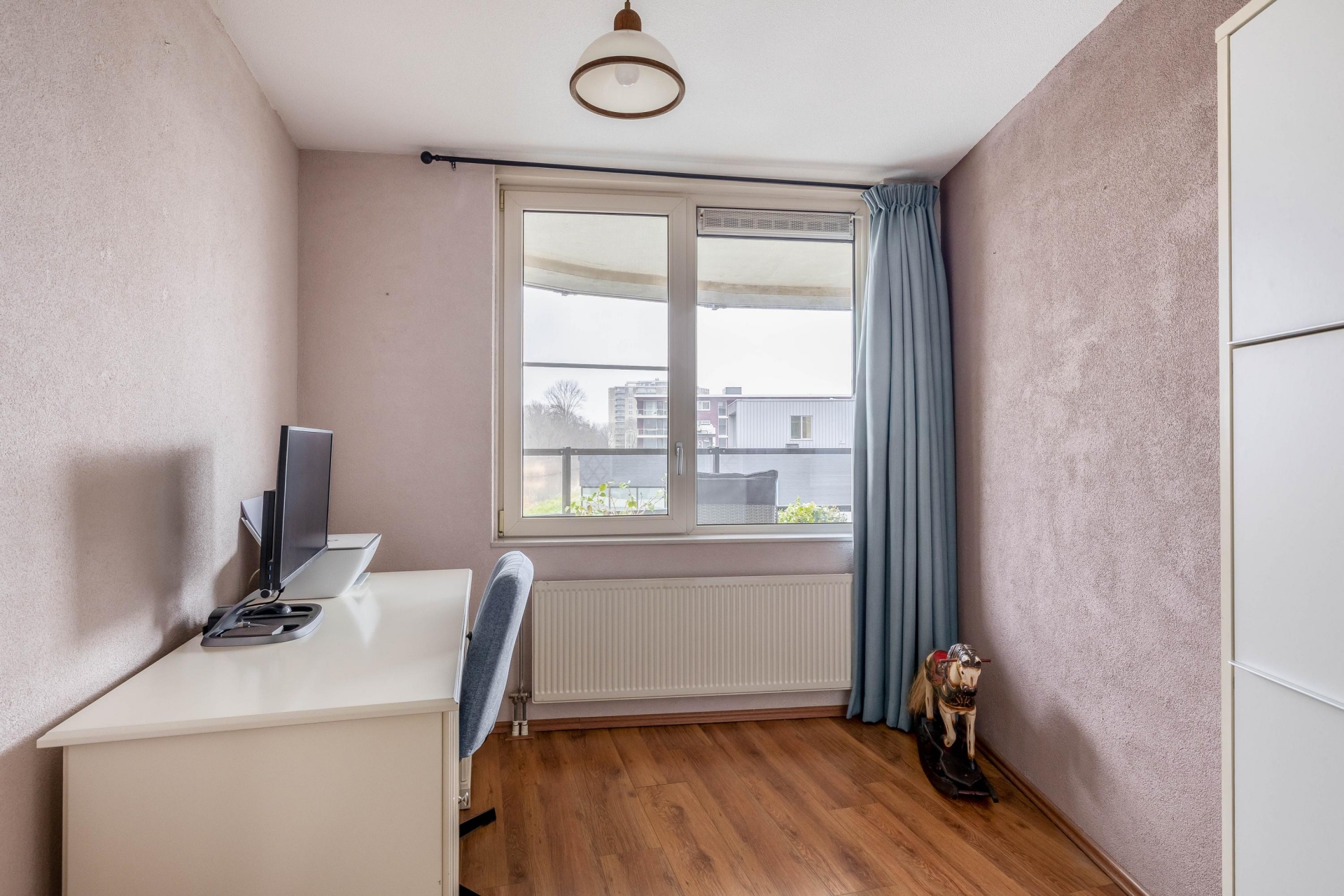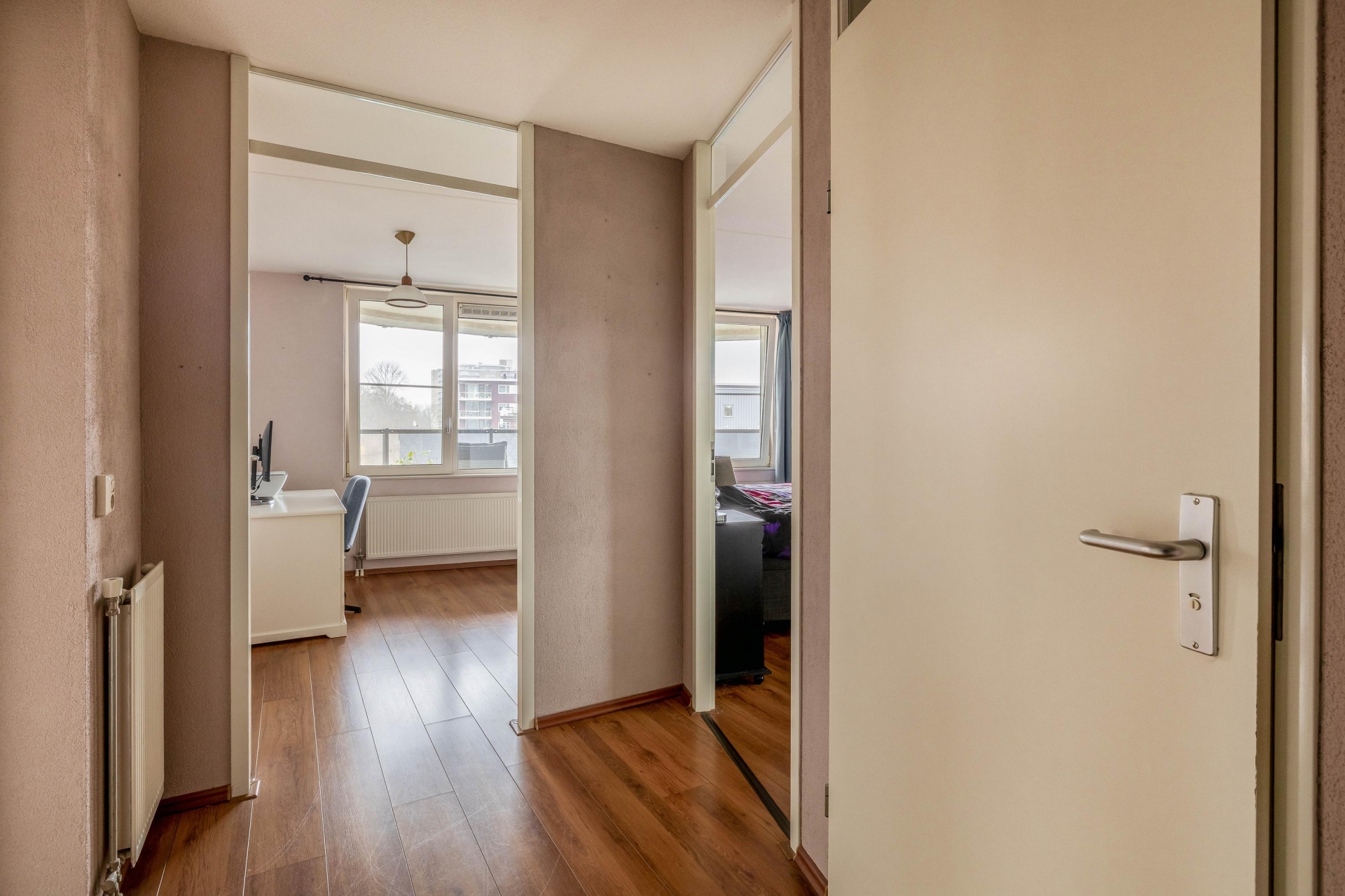 Het appartement beschikt over twee slaapkamers. De grootste slaapkamer biedt voldoende ruimte voor een tweepersoonsbed en een royale kledingkast. Ook hier zorgt het raam voor prettig lichtinval. De tweede slaapkamer is uitstekend geschikt als logeerkamer, hobbyruimte of werkkamer.