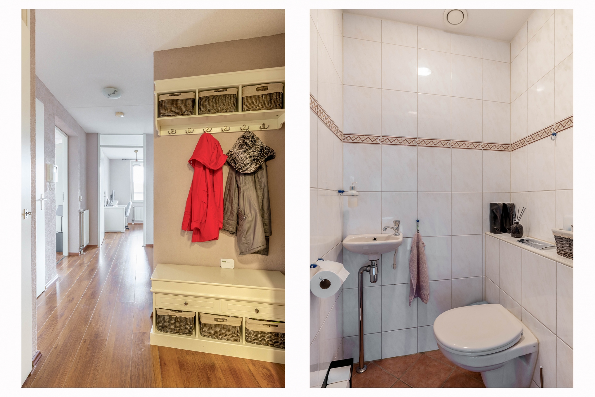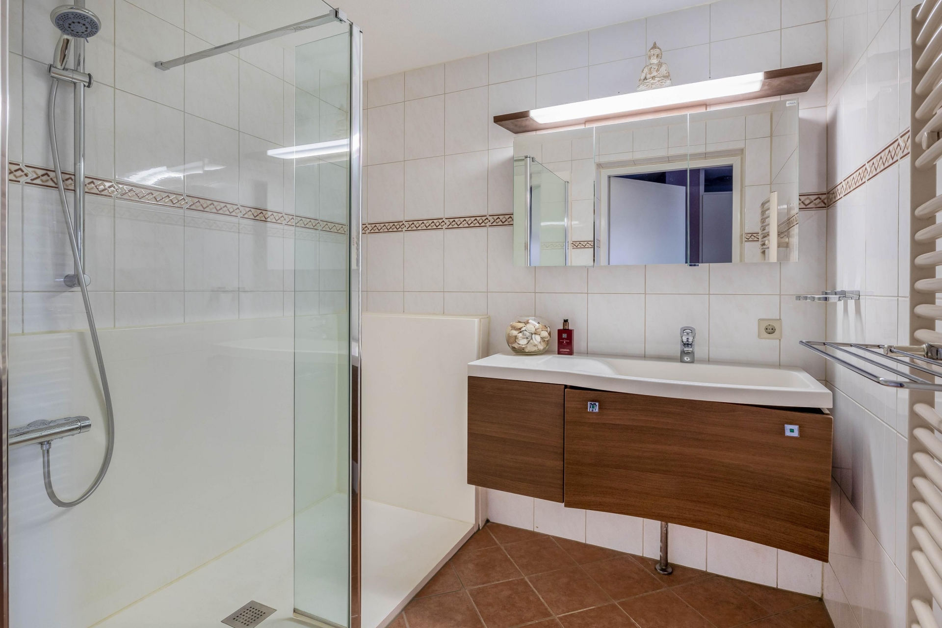 De badkamer is netjes uitgevoerd en voorzien van een inloopdouche en wastafelmeubel. Daarnaast is er een separate toiletruimte. Vanuit de hal vind je bovendien een praktische inpandige berging voor extra opslag en de wasapparatuur.