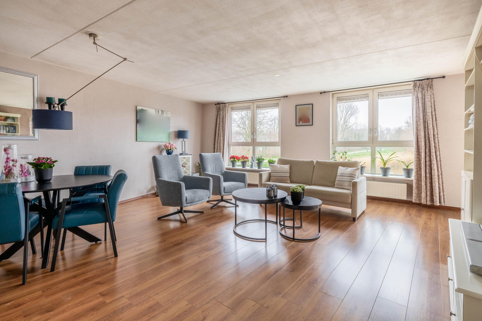 De woonkamer is direct het hart van het huis. Wat hier meteen opvalt, is het licht. Dankzij de grote raampartijen en de bijzondere, licht gebogen gevel stroomt het daglicht royaal naar binnen. Vanuit de zithoek kijk je uit over het water en de groene omgeving. De ruimte is royaal opgezet, waardoor je hier met gemak een comfortabele zithoek en een ruime eethoek kwijt kunt.
