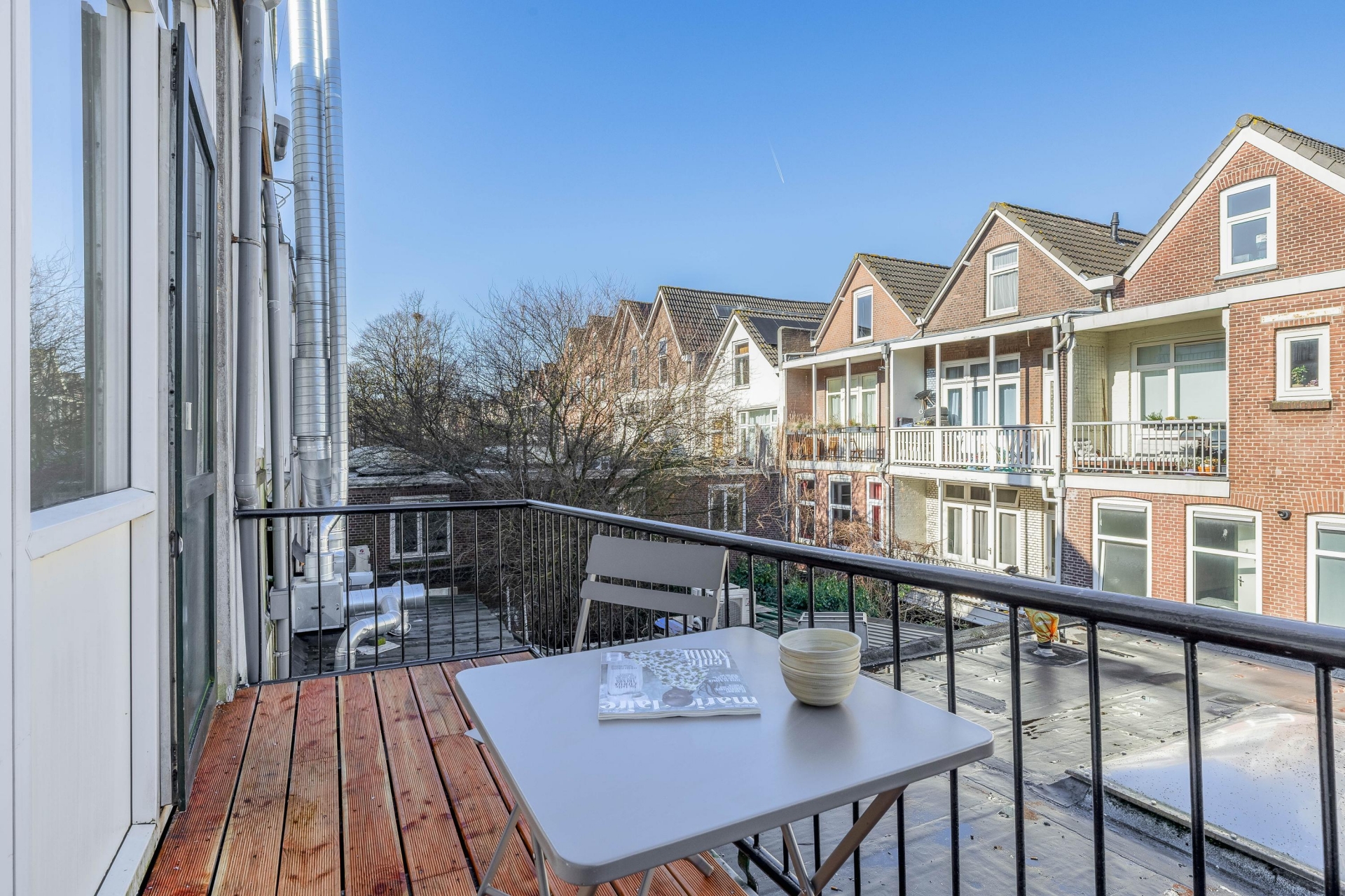 Het balkon aan de achterzijde biedt een prettige buitenruimte in stedelijke omgeving.