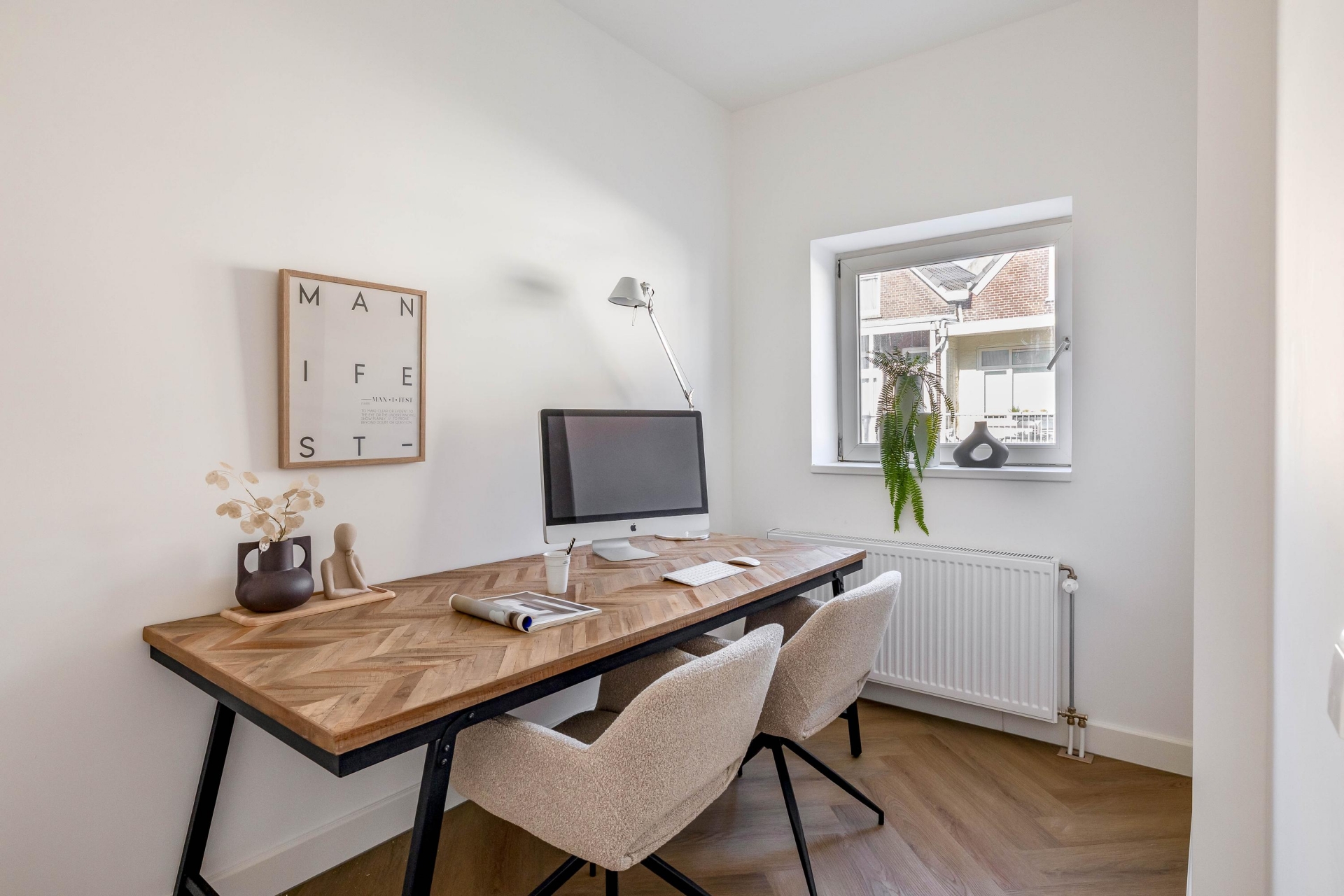 De keuken is voorzien van een Quooker, kookplaat met geïntegreerde afzuiging en hoogwaardige inbouwapparatuur. De strakke belijning en rustige kleurstelling sluiten naadloos aan bij de warme visgraatvloer en het lichte interieur. De directe verbinding met het balkon aan de achterzijde zorgt voor extra lichtinval en een prettige ruimtelijke beleving.