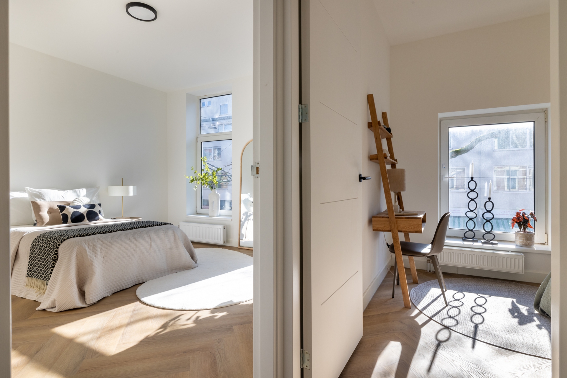 Aan zowel de voor- als achterzijde bevinden zich kamers, flexibel in te richten als hoofdslaapkamer, werkkamer of logeerkamer.