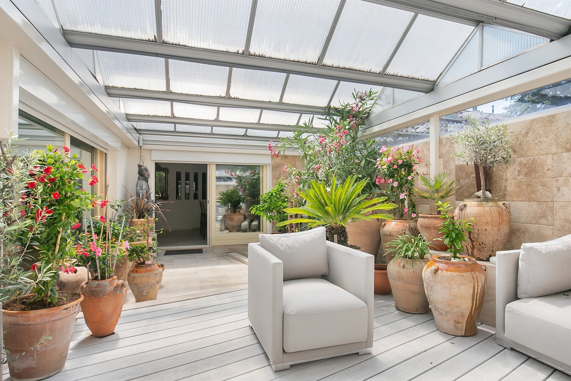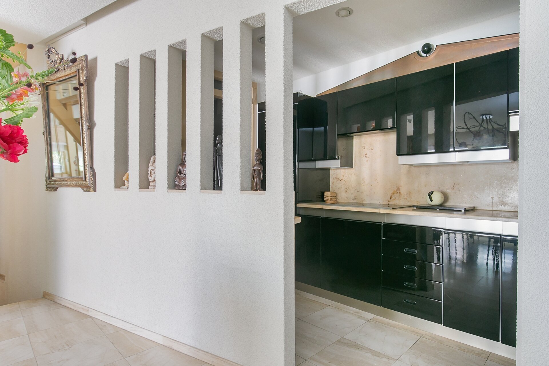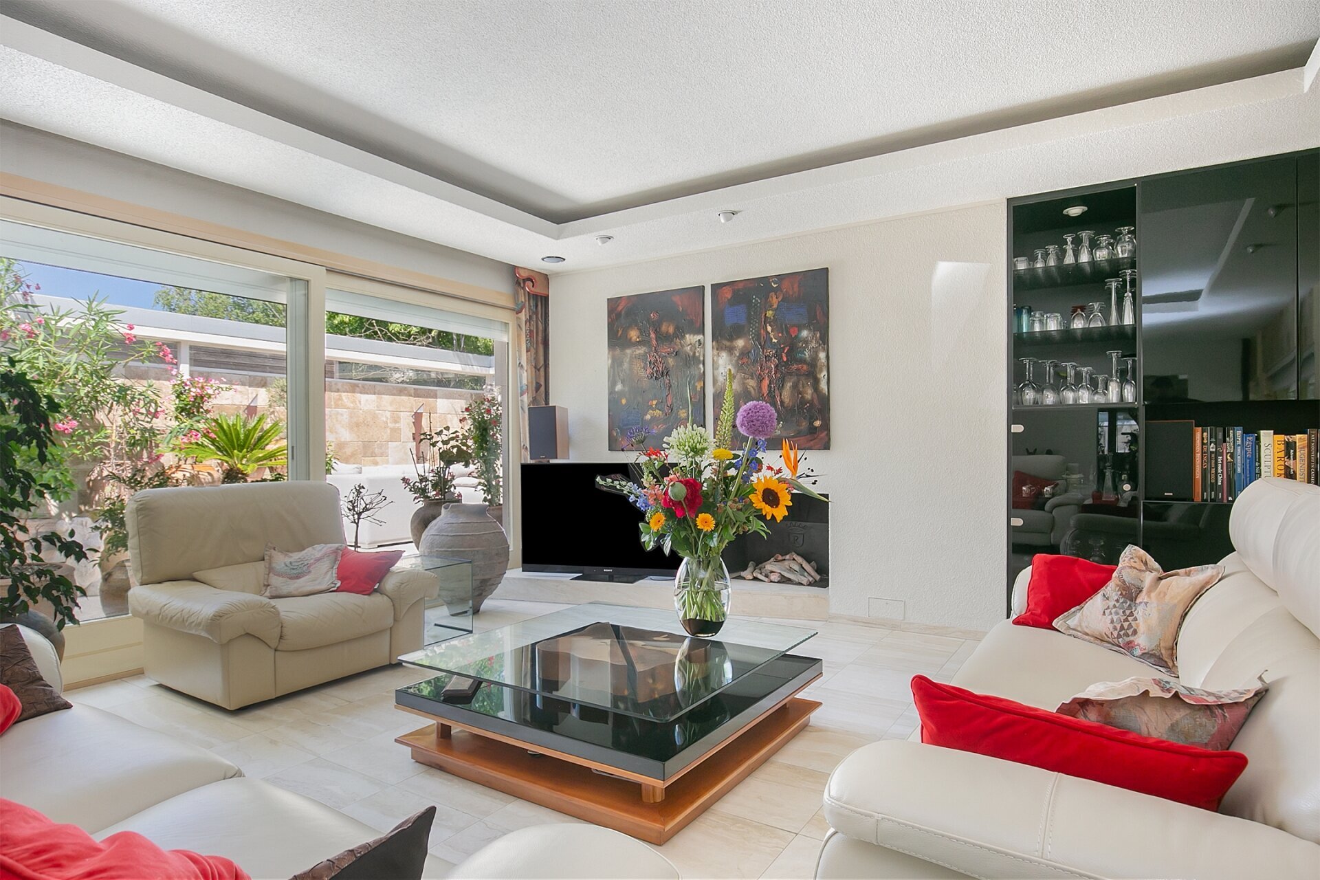 From the living room and dining room there is a good connection to the subtropical garden with many container plants. You can also sit on the patio when the sun is shining. Even when it rains, the patio doors can remain open and you can experience the pleasant pattering rain on the patio roof.