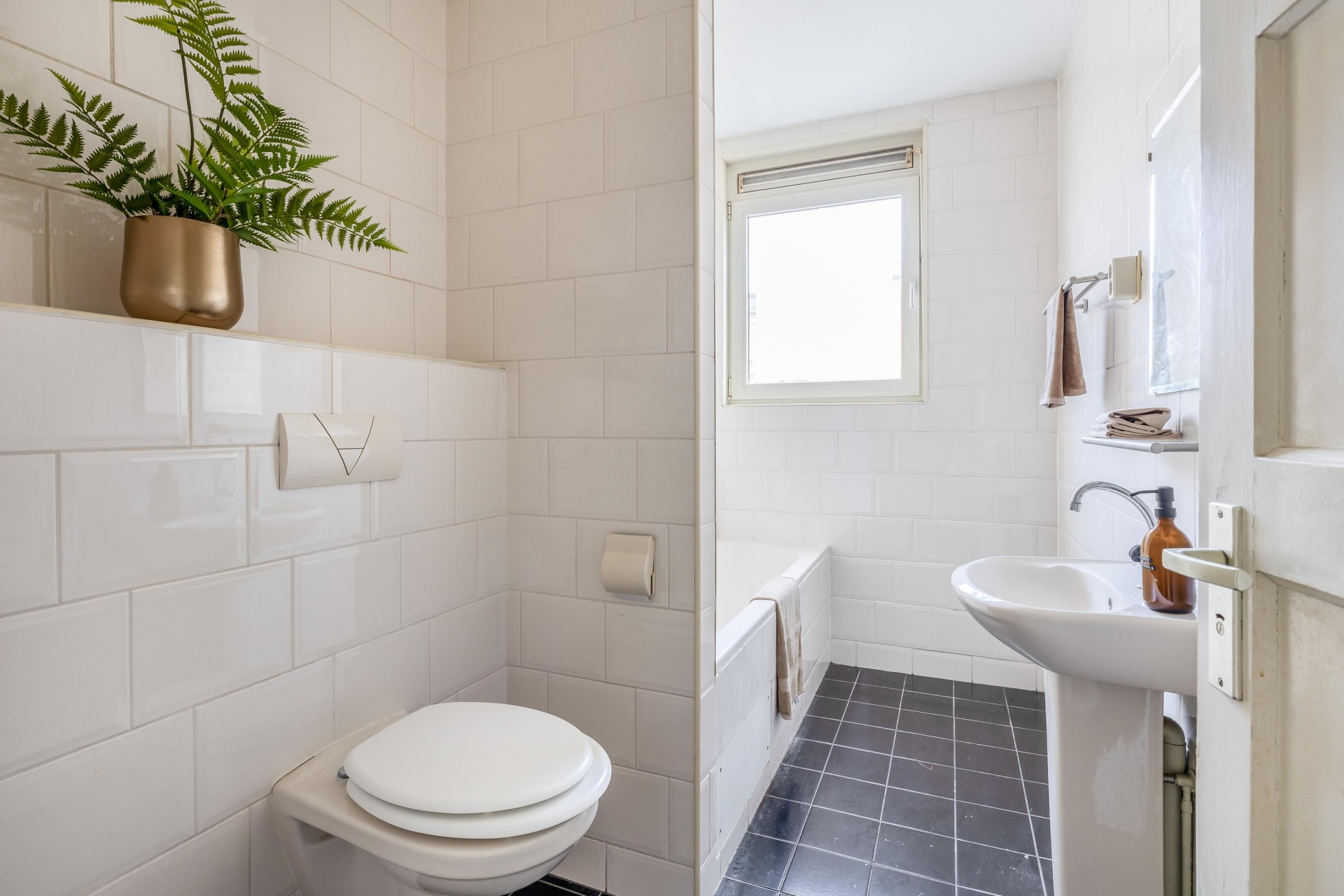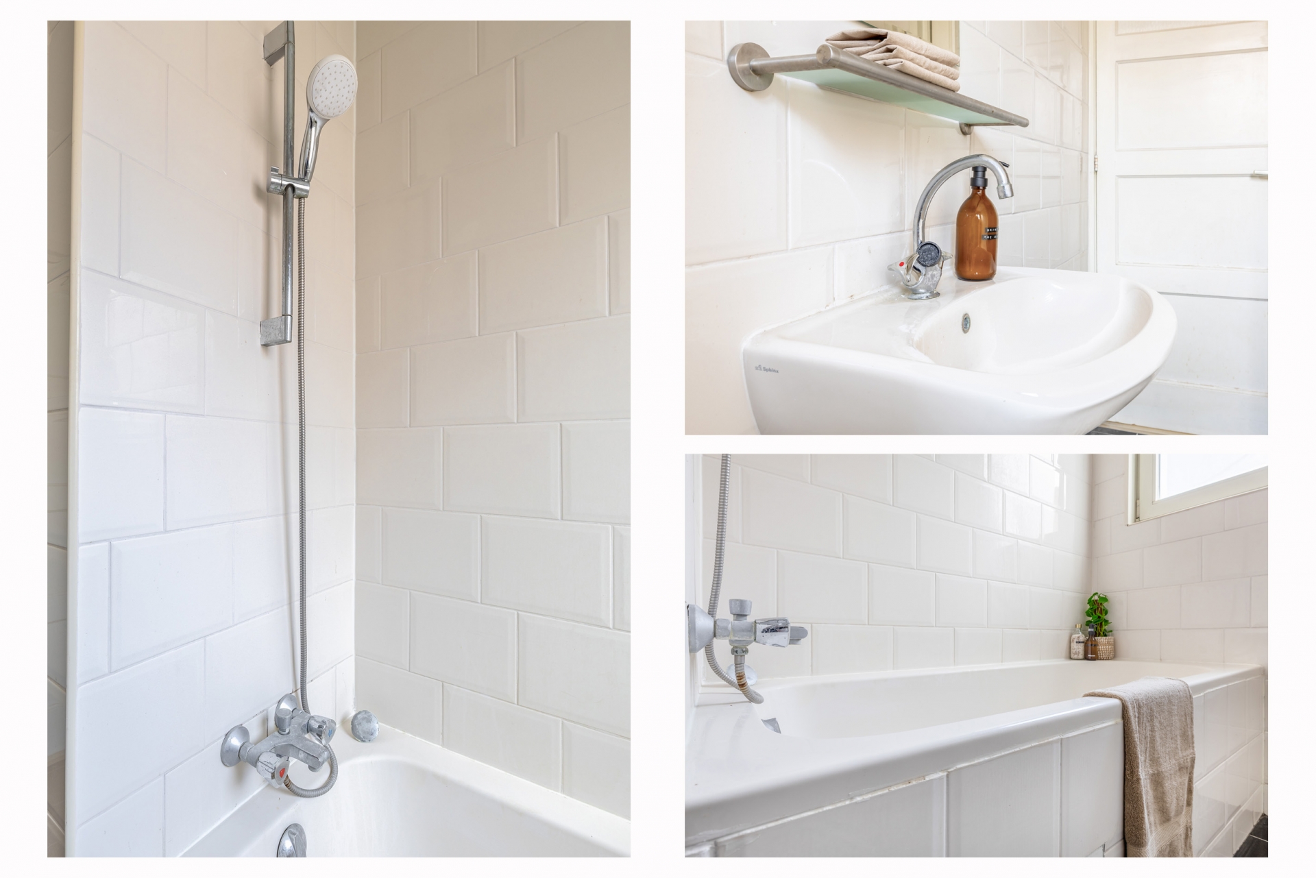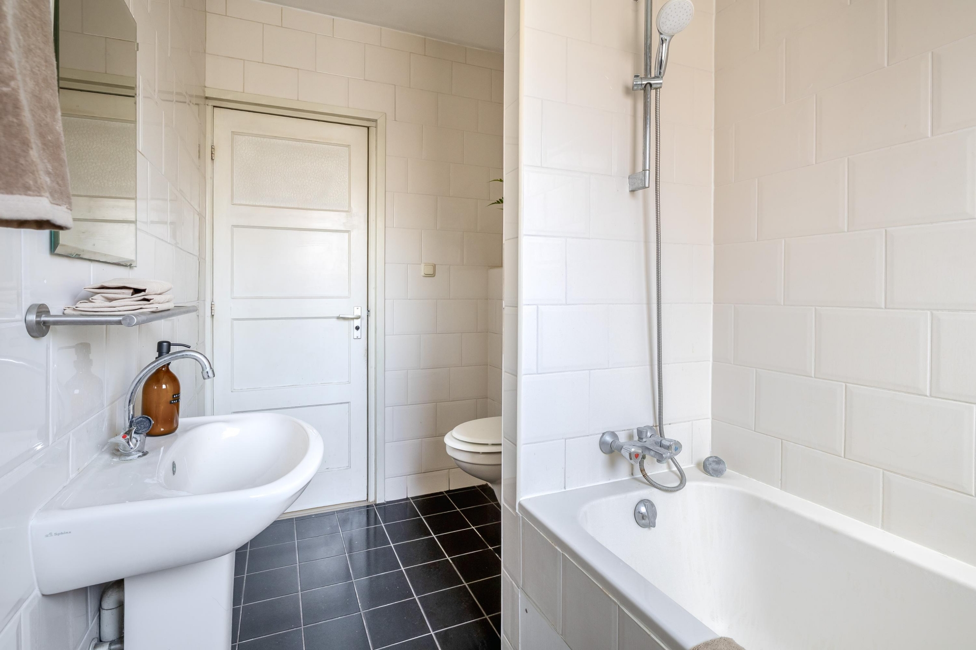 De badkamer is netjes uitgevoerd en voorzien van een ligbad. Compact en praktisch ingericht, met alles wat je nodig hebt.