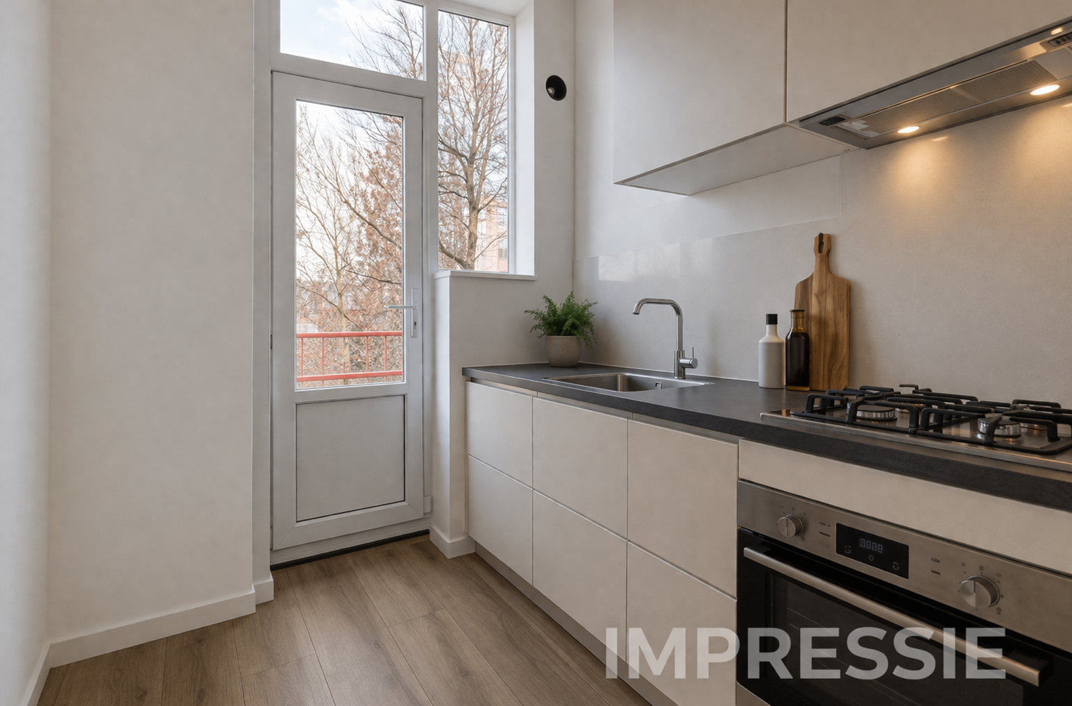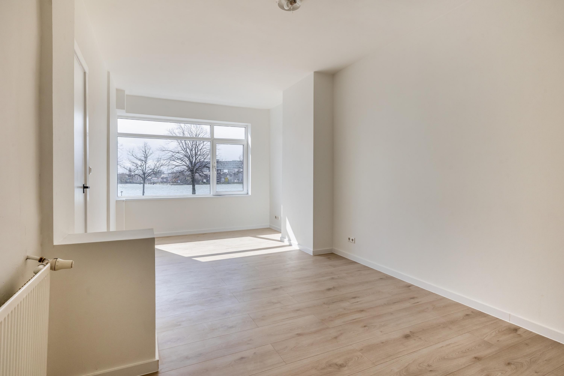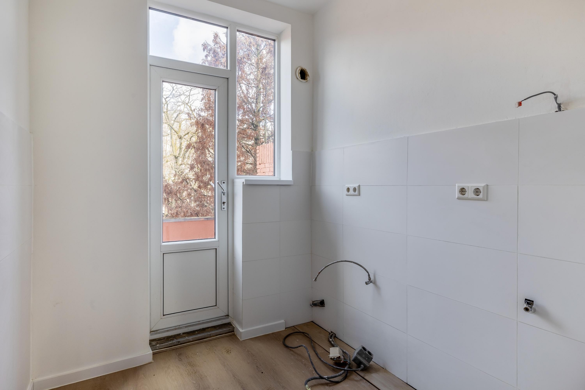 De woonkamer loopt over de volle diepte van het huis en voelt daardoor ruim en prettig aan. Aan de voorzijde geniet je van vrij uitzicht, terwijl de achterzijde aansluit op het balkon. Hier creëer je eenvoudig een fijne zit- en eethoek. De keukenruimte bevindt zich aan de achterzijde en is voorbereid met alle benodigde aansluitingen. Je hebt hier de mogelijkheid om een keuken volledig naar eigen smaak te plaatsen, zonder dat er eerst gesloopt hoeft te worden.