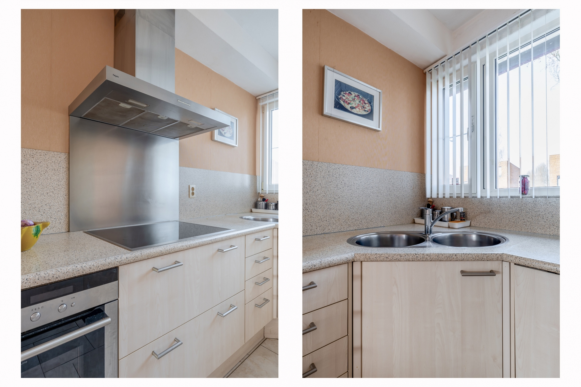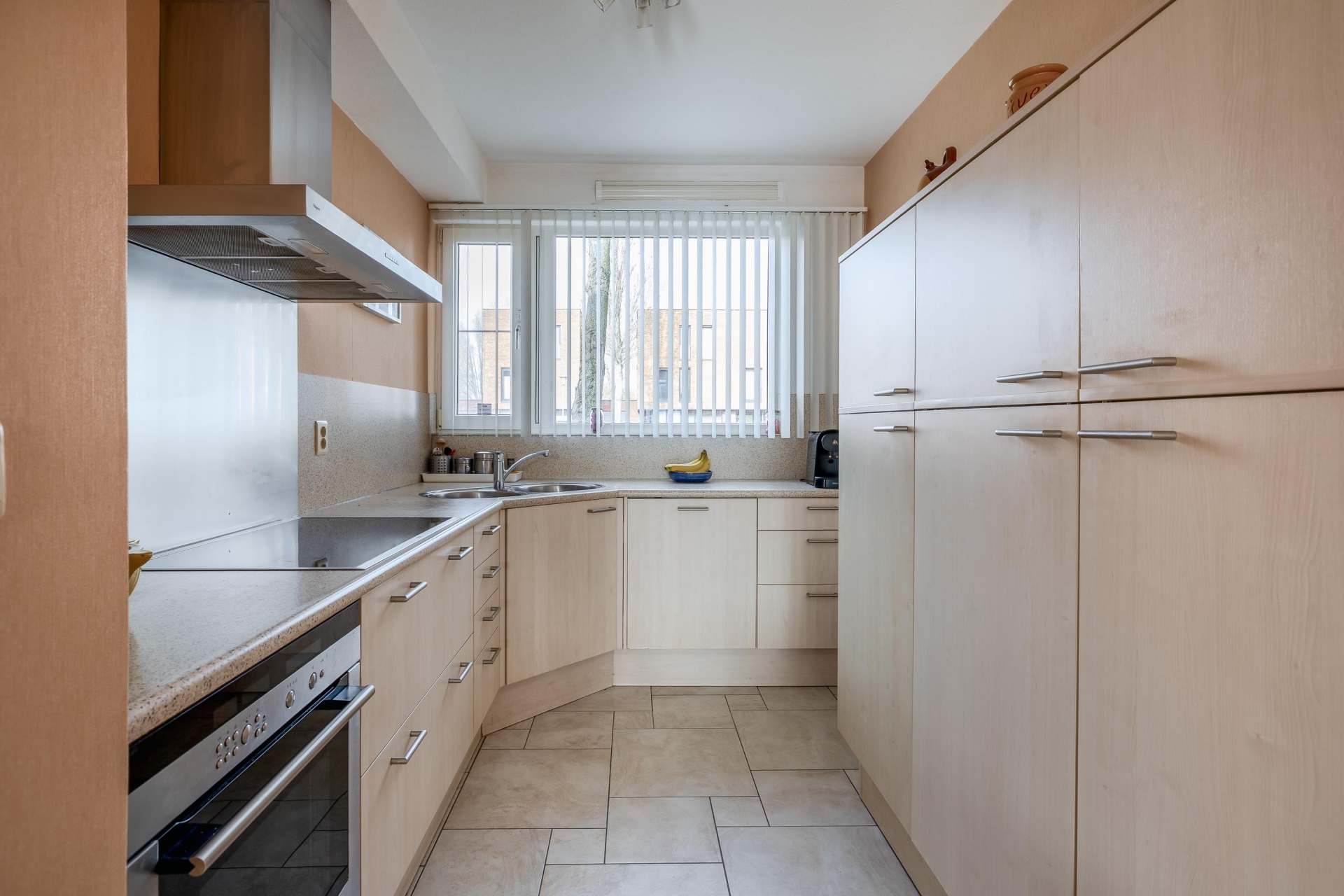 De keuken ligt aan de voorzijde van het huis en is uitgevoerd in een praktische L-opstelling. Dankzij het grote raam aan de voorzijde is ook hier veel natuurlijk licht aanwezig. De keuken biedt voldoende werk- en kastruimte en is voorzien van diverse inbouwapparatuur. Vanuit de keuken kijk je uit over de straat en de groenstrook voor het huis.