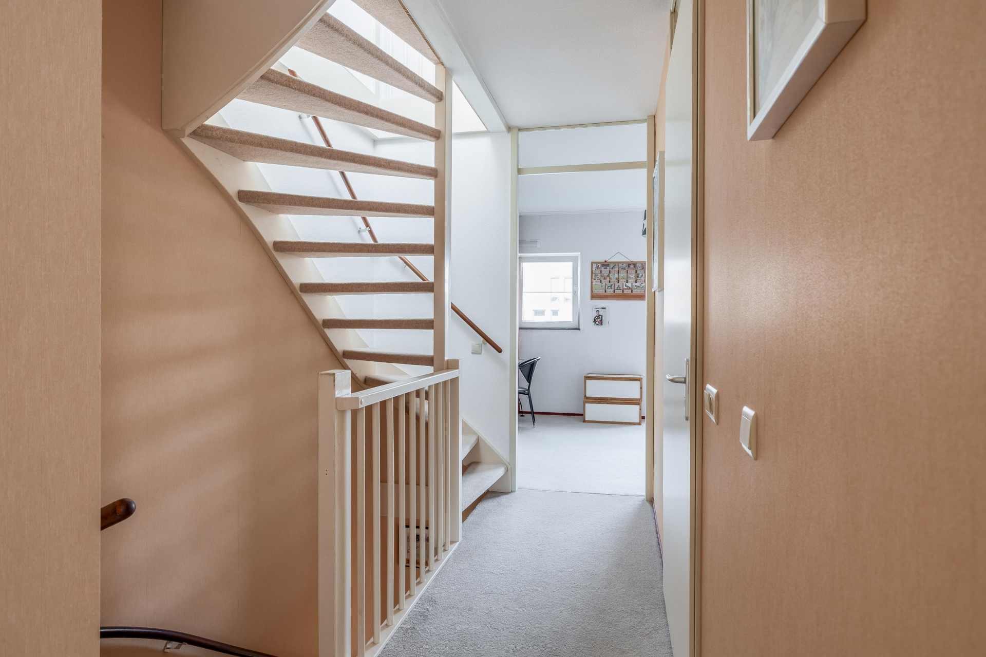 Op de eerste verdieping bevinden zich drie slaapkamers en de badkamer. De grootste slaapkamer ligt aan de achterzijde van het huis en biedt meer dan genoeg ruimte voor een groot bed en een kastwand. De overige twee slaapkamers zijn ideaal als kinderkamer, werkkamer of logeerkamer. De badkamer is compleet ingericht met een ligbad, douche, wastafelmeubel en een tweede toilet. Dankzij de neutrale afwerking vormt dit een fijne en praktische ruimte voor het hele gezin. Een groot pluspunt van dit huis is de tweede verdieping. De huidige eigenaren hebben hier zelf een vaste trap laten plaatsen, waardoor deze verdieping volwaardig te gebruiken is. Op de overloop is ruimte voor de wasmachine, de cv-ketel en extra bergruimte. Daarnaast zorgt de dakkapel voor extra licht en ruimte. Deze verdieping kan uitstekend dienen als werkruimte, hobbyruimte of extra slaapkamer.