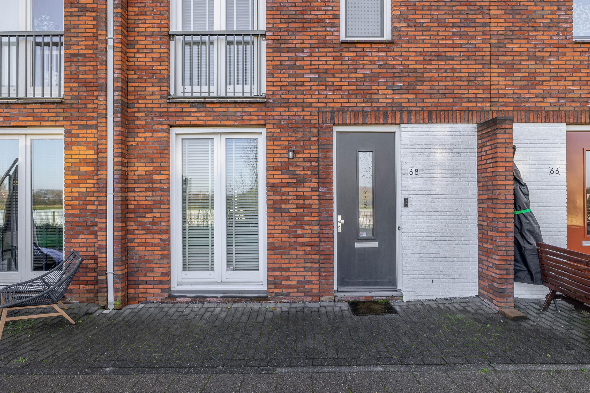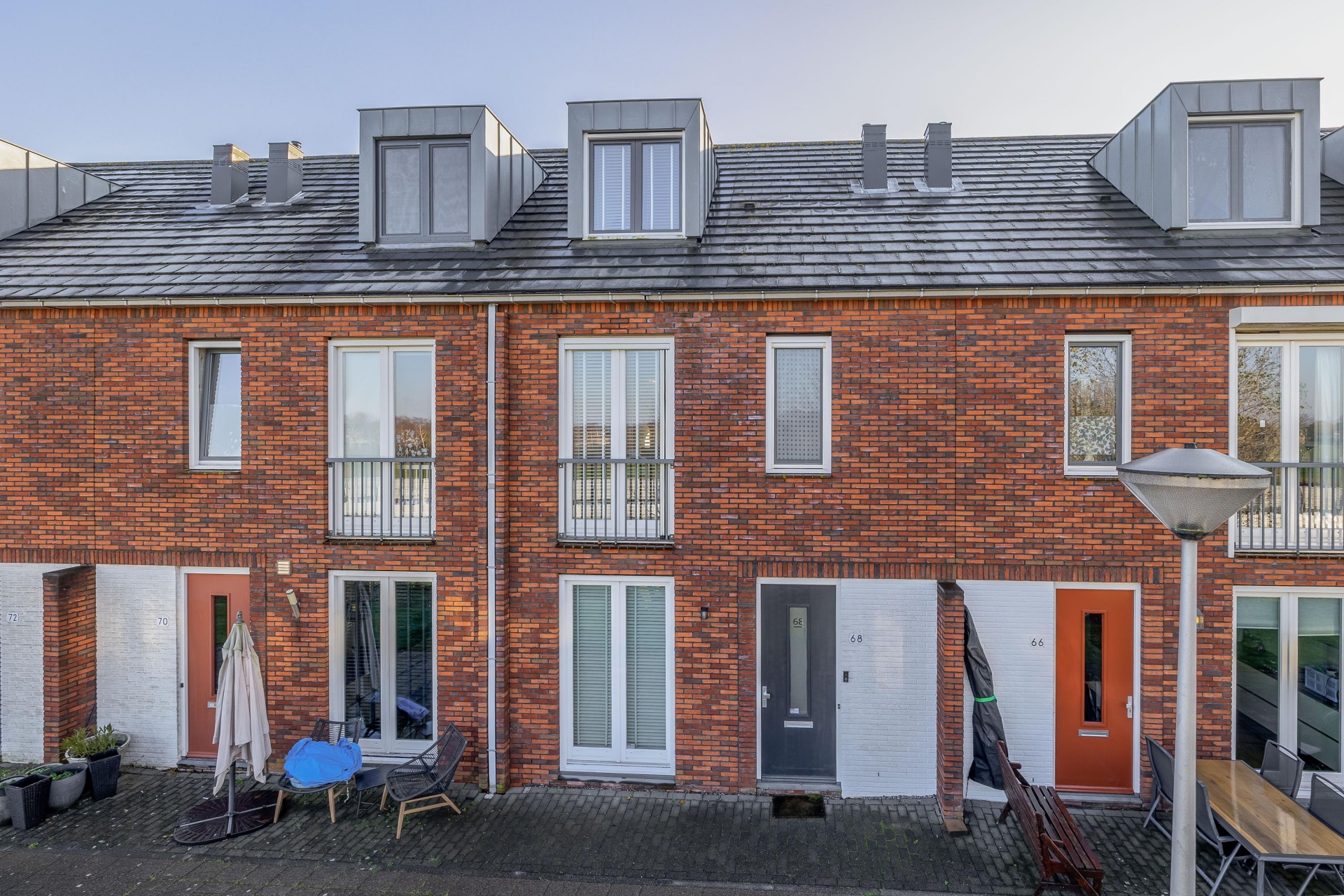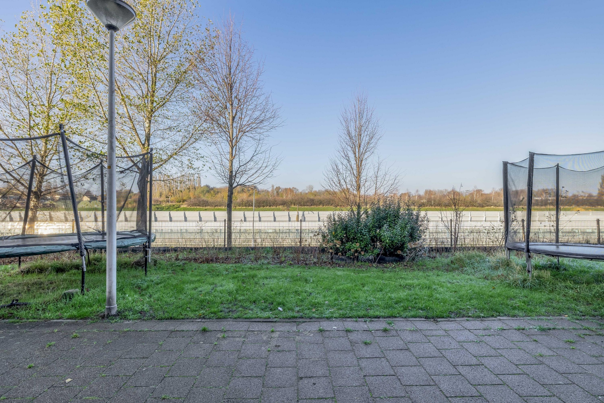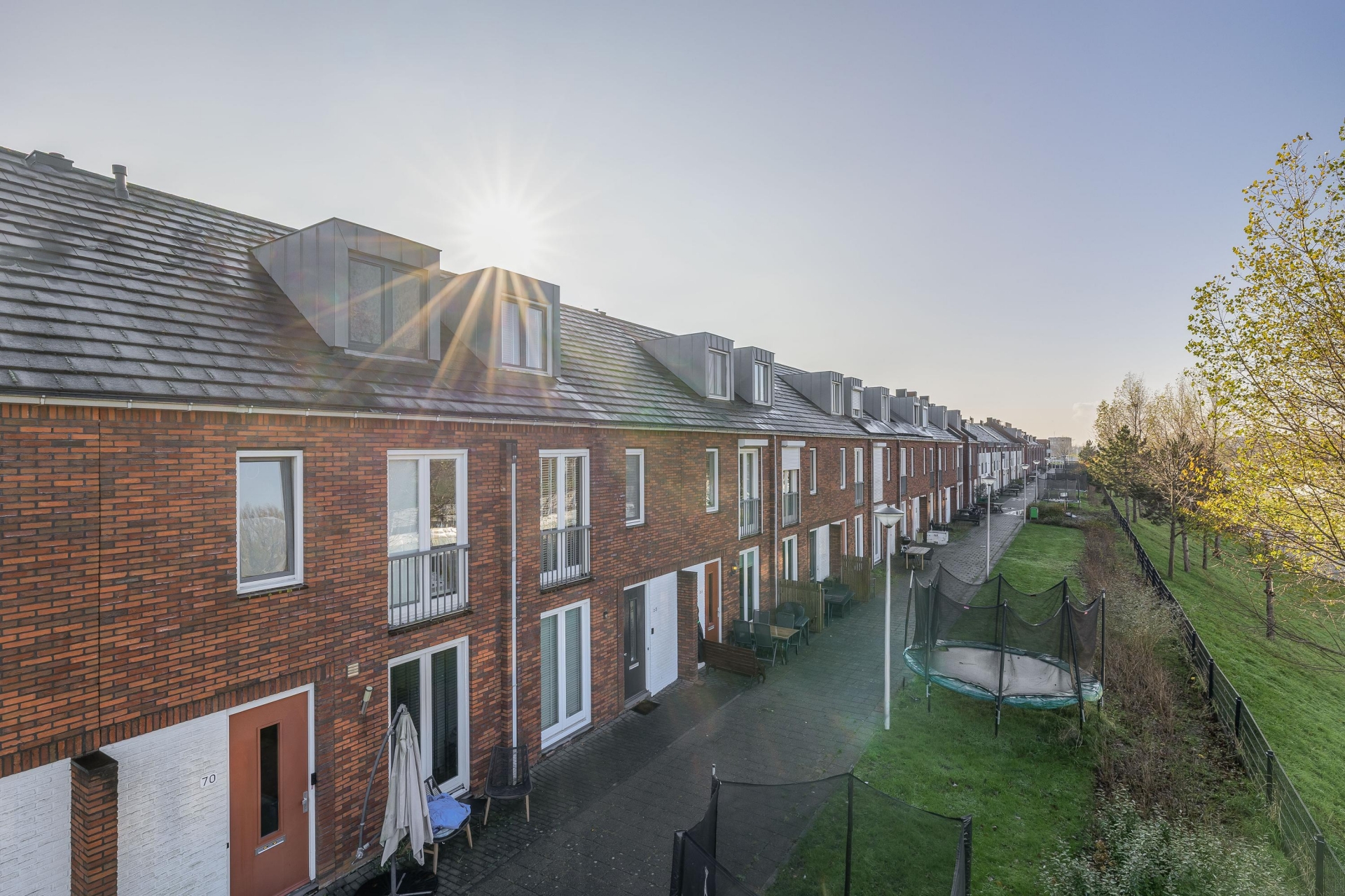 - Aan de voorzijde is een autovrij plantsoen. Verschillende buren hebben hier kinderspellen toestellen neergezet;