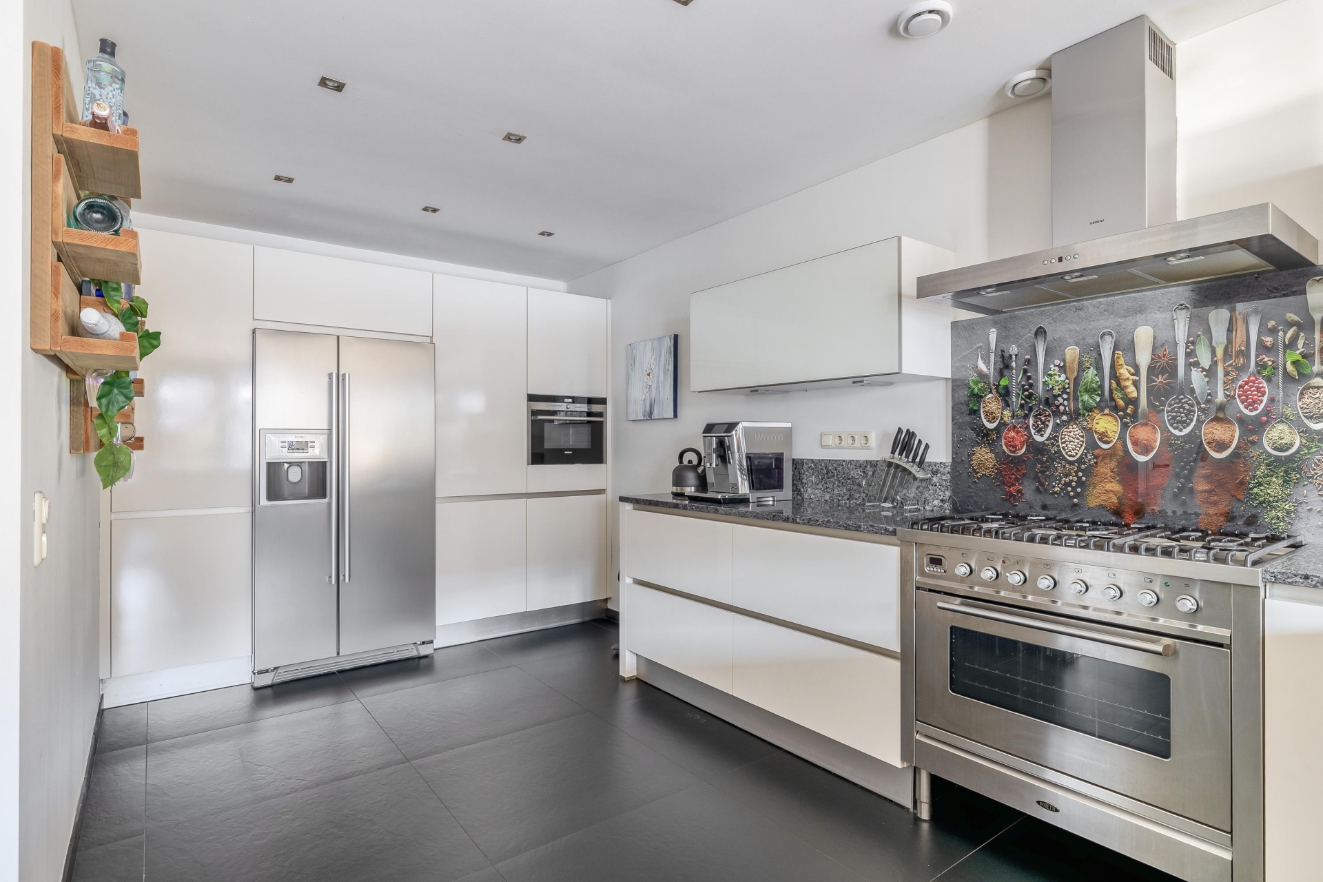 De living is strak afgewerkt, licht en voelt heerlijk open aan. Dankzij grote raampartijen aan de voorzijde en een slimme indeling is dit echt zo'n ruimte waar je graag samenkomt. Zowel in de living als in de woonkeuken ligt een natuurstenen vloer met vloerverwarming. De keuken is een waar kookparadijs – uitgerust met een royaal kookeiland, hoogwaardige apparatuur en veel werkruimte. De directe verbinding met de tuin maakt het plaatje compleet. De professionele overkapping maakt de tuin een verlengde van de woonkeuken. De overkapping is volledig af te sluiten. Daarnaast is de woning voorzien van een centraal afzuigsysteem dat op elke verdieping te gebruiken is. De woning beschikt over drie luxe toiletten, verspreid over de verschillende verdiepingen.