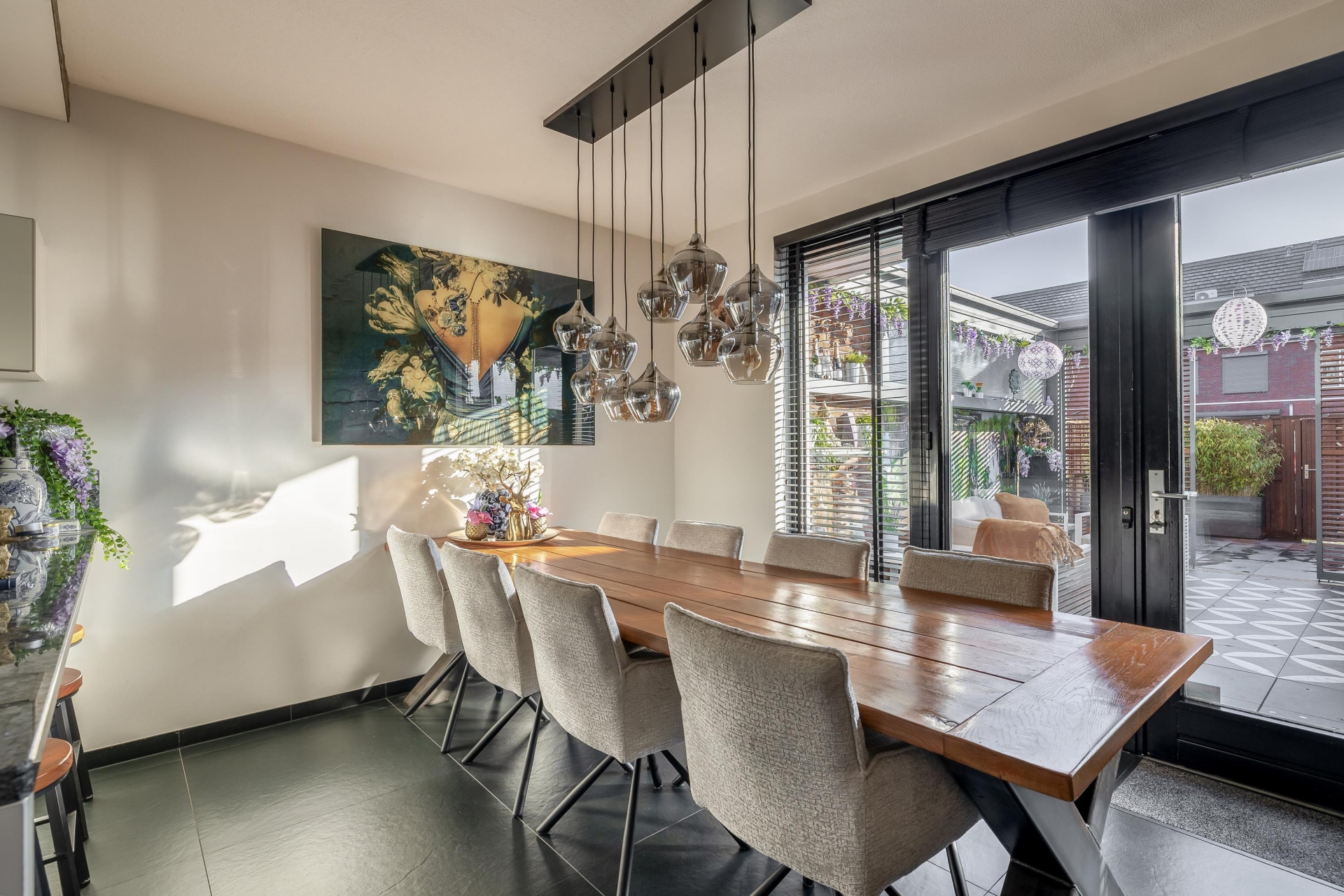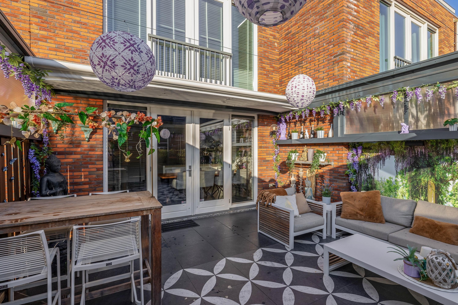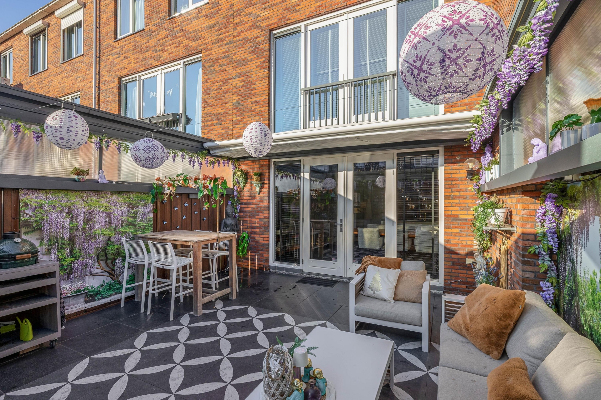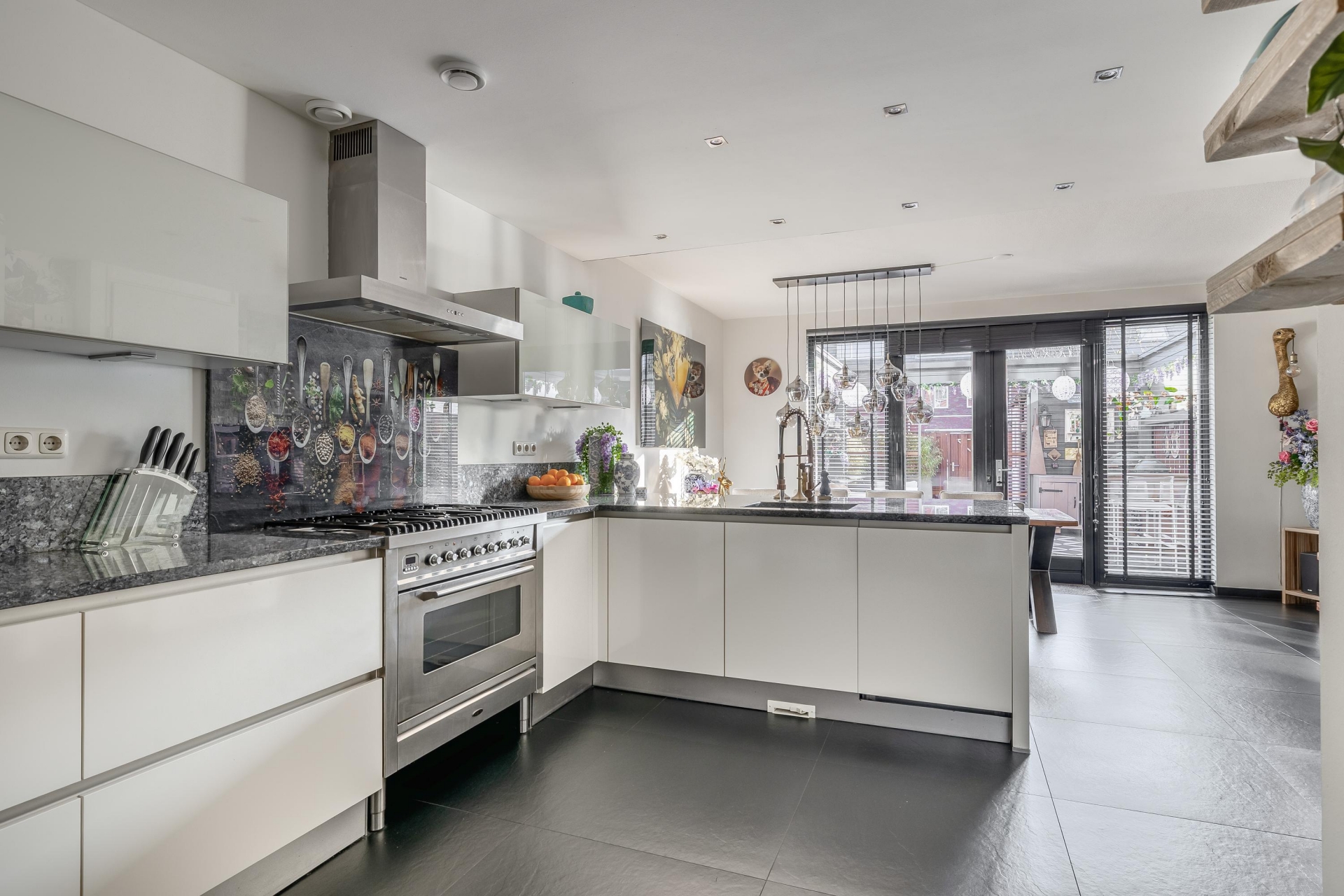 De keuken is zonder twijfel één van de eyecatchers van het huis. Met het ruime werkblad, het stoere fornuis en een stijlvolle afwerking is dit een plek waar koken echt een plezier is. Of je nu uitgebreid voor gasten kookt of even snel iets opwarmt – alles ligt binnen handbereik. Vanuit de keuken loop je direct de tuin in: een sfeervol aangelegde buitenruimte met overkapping die je open of dicht kunt zetten. Ideaal voor lange zomeravonden, maar ook perfect om het hele jaar door droog buiten te zitten.