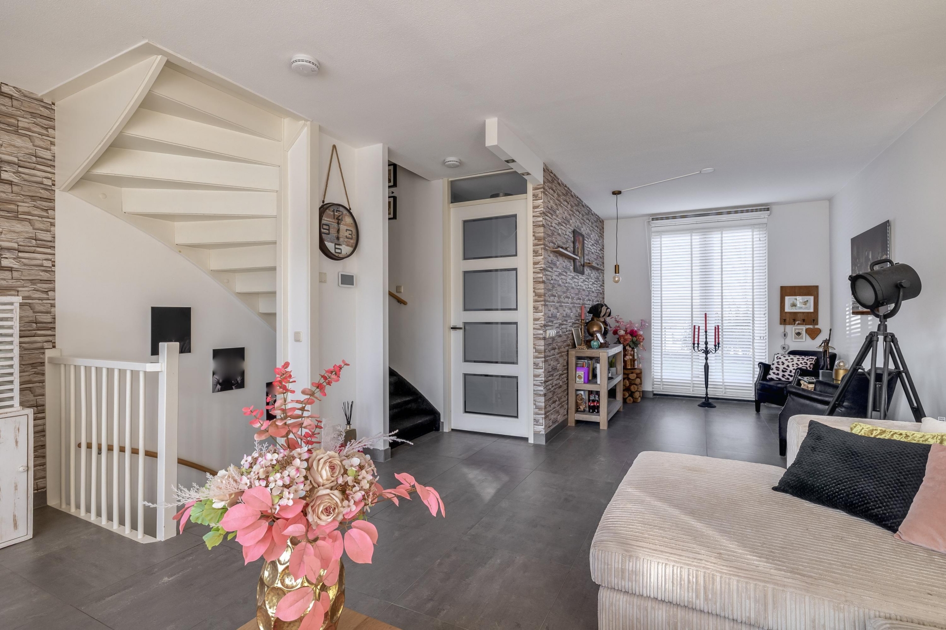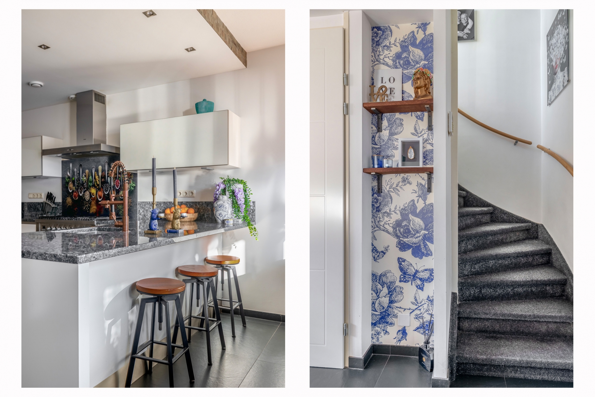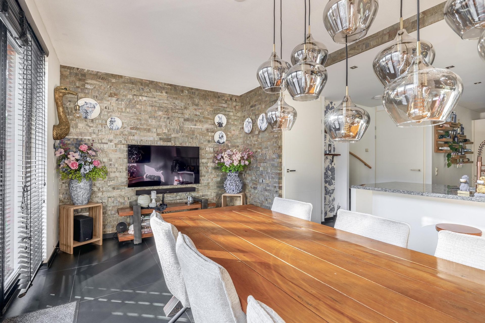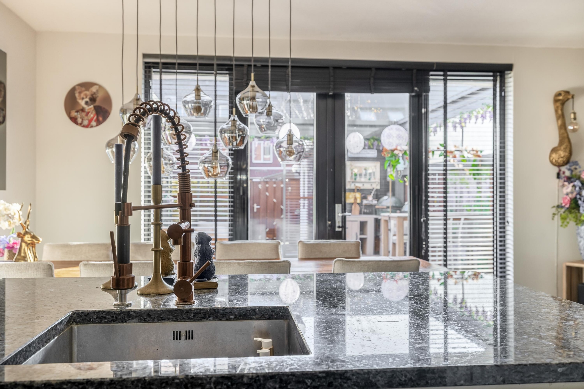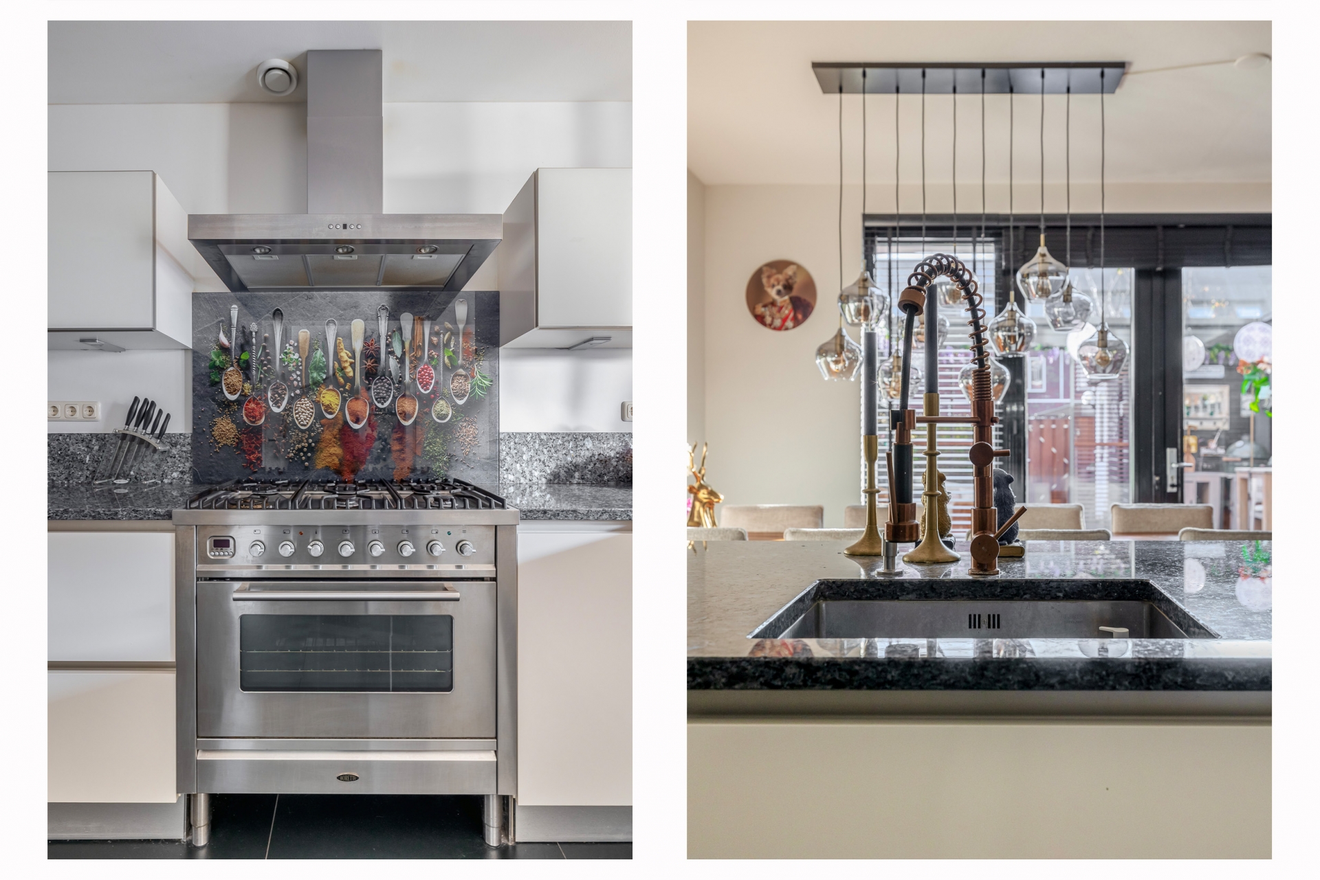 De keuken is zonder twijfel één van de eyecatchers van het huis. Met het ruime werkblad, het stoere fornuis en een stijlvolle afwerking is dit een plek waar koken echt een plezier is. Of je nu uitgebreid voor gasten kookt of even snel iets opwarmt – alles ligt binnen handbereik. Vanuit de keuken loop je direct de tuin in: een sfeervol aangelegde buitenruimte met overkapping die je open of dicht kunt zetten. Ideaal voor lange zomeravonden, maar ook perfect om het hele jaar door droog buiten te zitten.