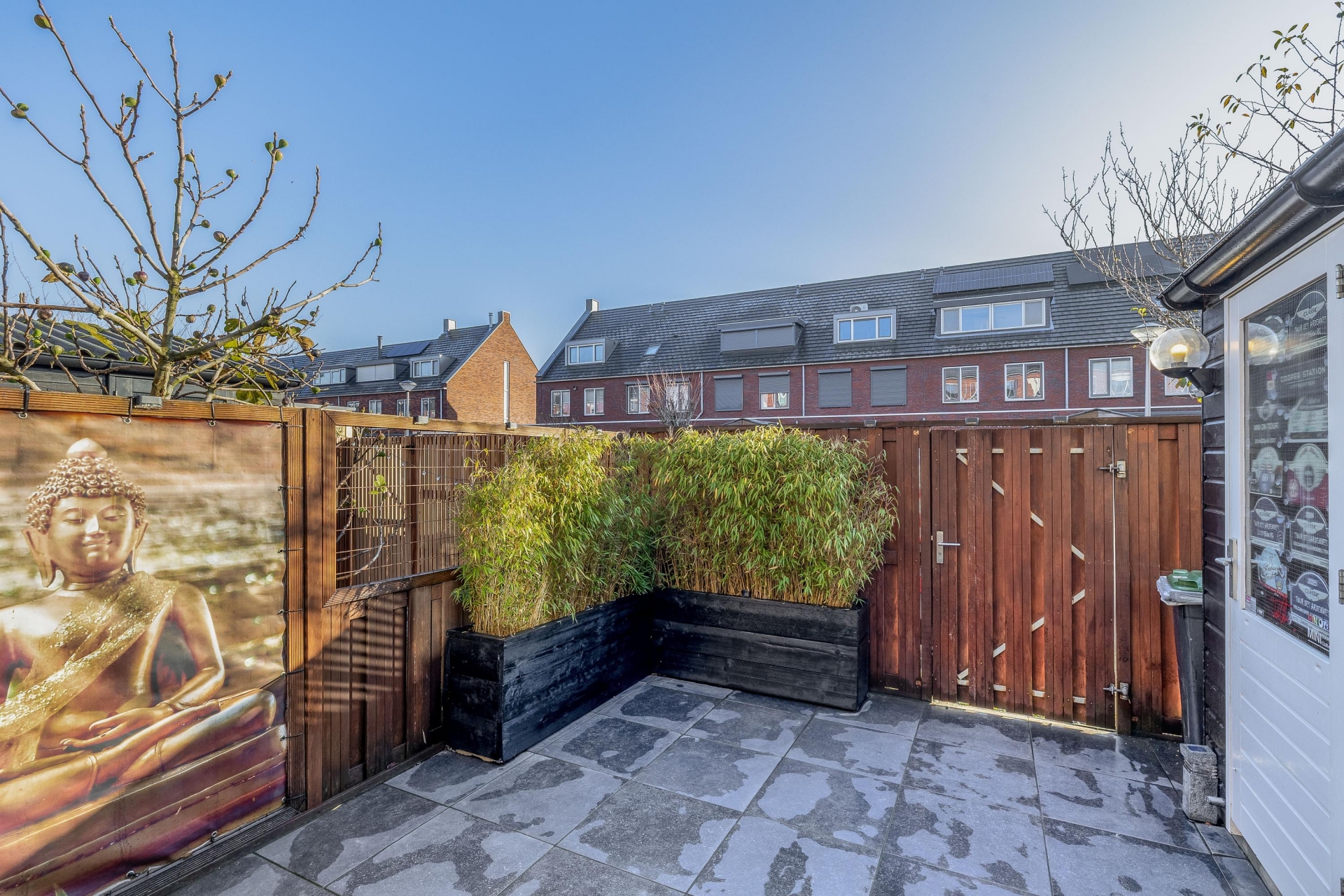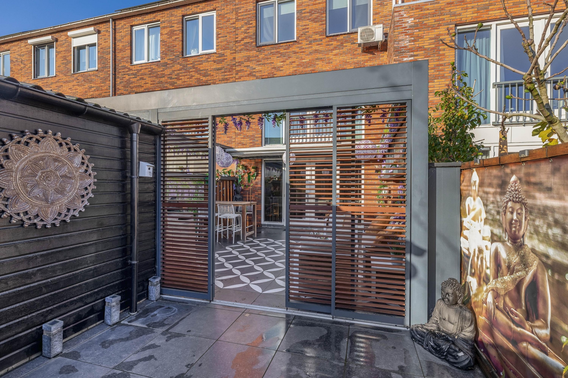De tuin ligt op het noordoosten, maar door de open ligging en slimme inrichting heb je hier veel zon – vooral in de ochtend en vroege middag. De gecoat aluminium (antraciet) overkapping met sfeervolle verlichting en buitenkeuken maakt van deze plek een verlengstuk van je woonkamer. Deze is elektrisch bedienbaar, is zes meter lang en voert het regenwater af via het aluminium frame. Heerlijk voor een barbecue met vrienden of gewoon ontspannen met een boek. De combinatie van privacy, gezelligheid en comfort maakt de tuin tot een plek waar je echt veel zult zijn.