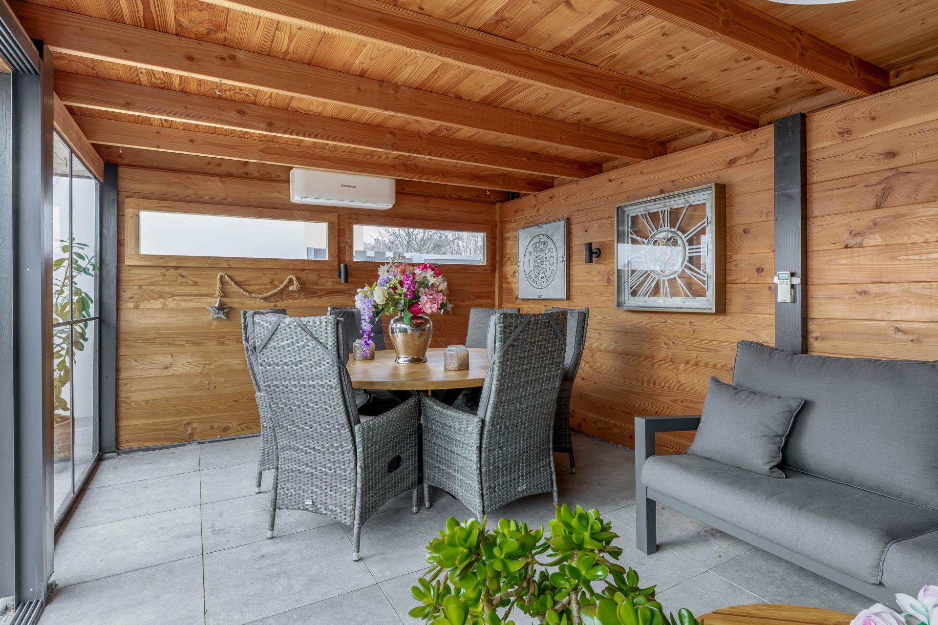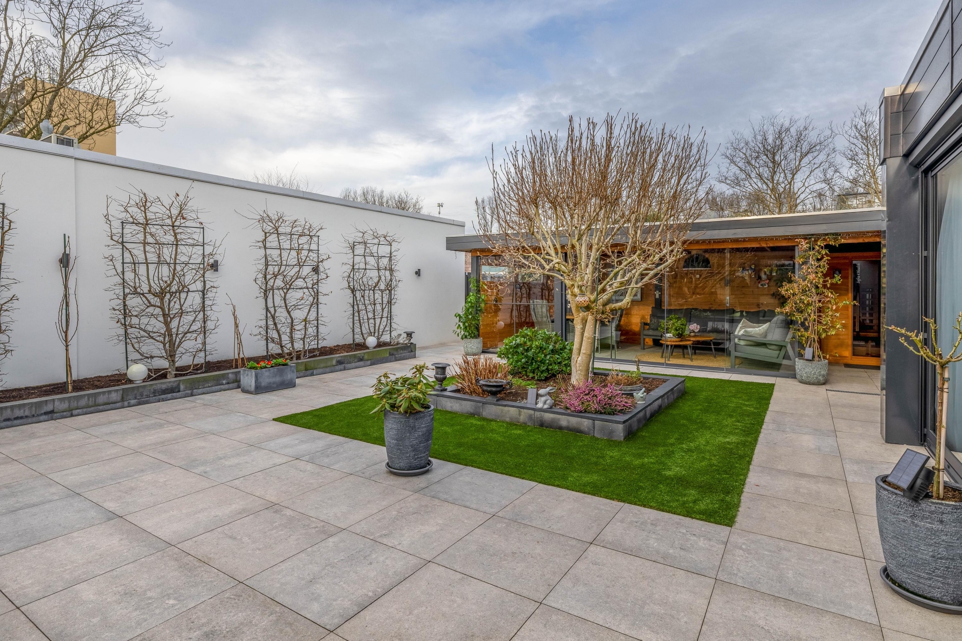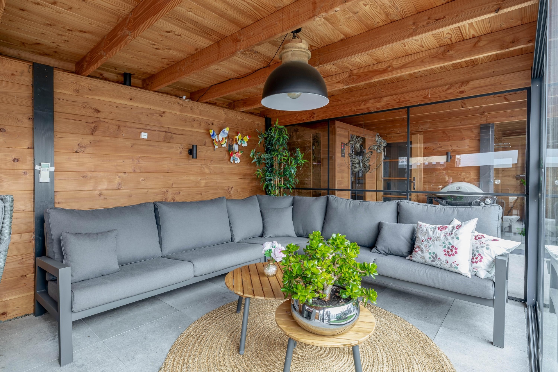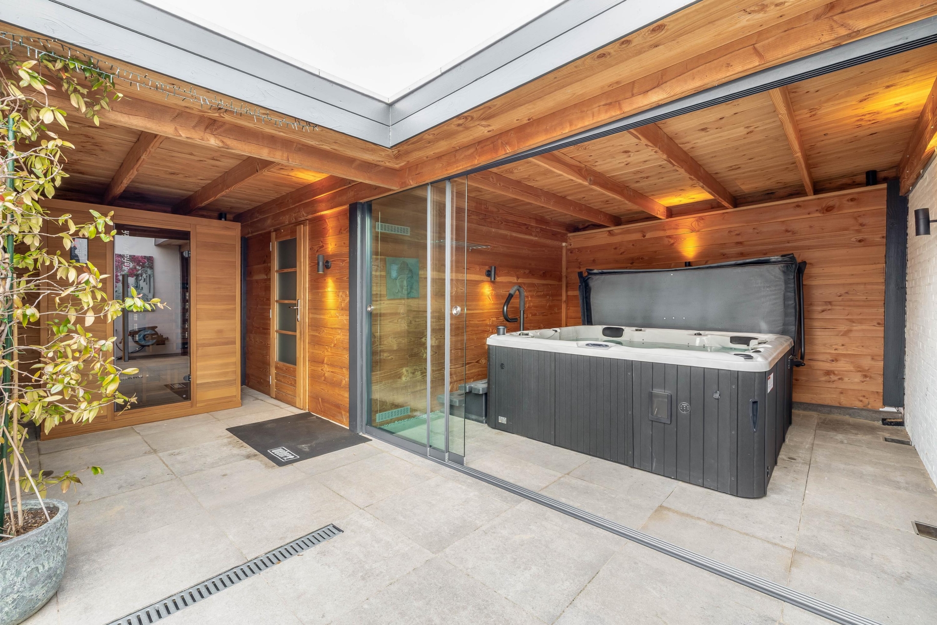 - Compleet vernieuwde achtertuin met riant tuinhuis met airco en schuifdeuren, buitenverblijf met jacuzzi, overkapping met infrarood cabine en tevens nog een ruime berging voor fietsen;