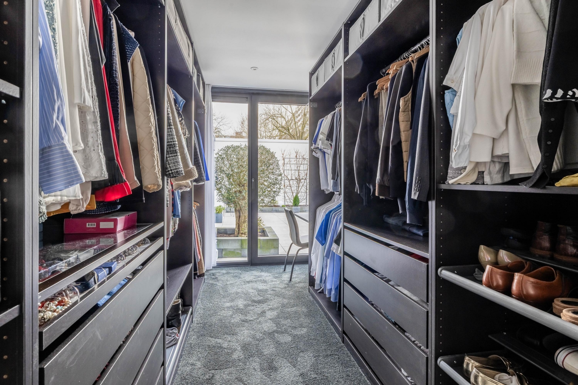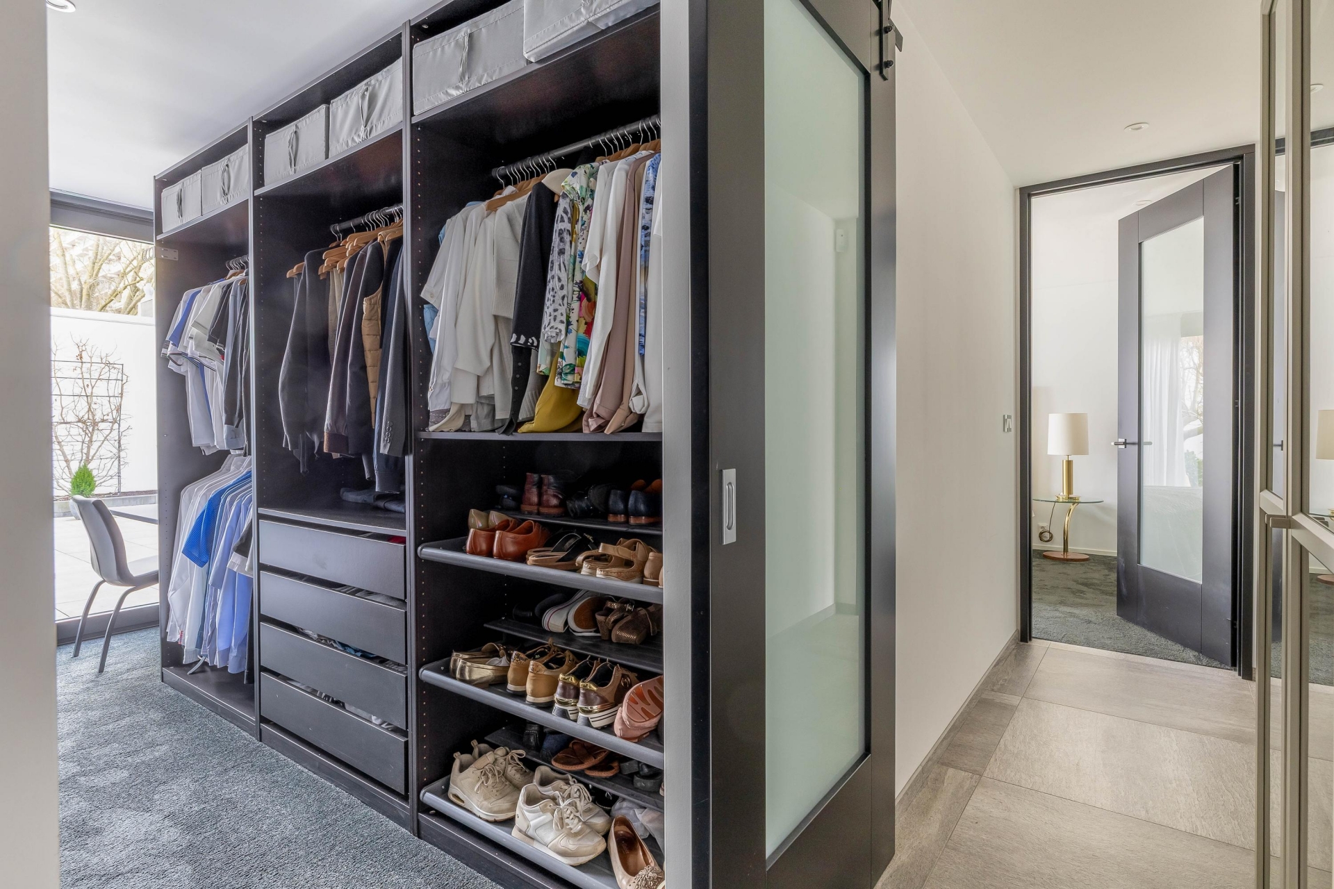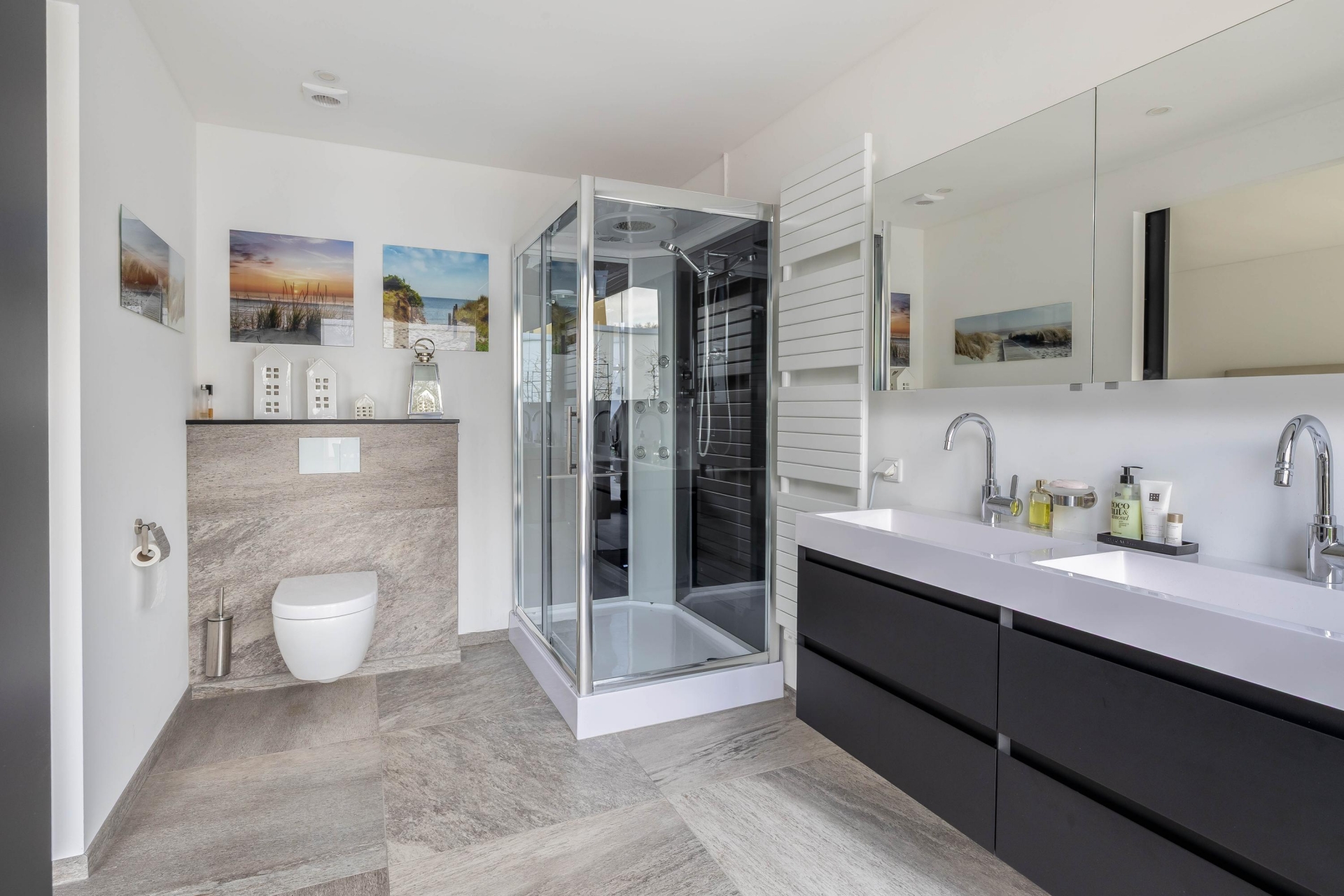 Vanuit de keuken is er toegang tot de hal waar een ideale bijkeuken is gerealiseerd. Deze heeft een oppervlakte van ruim 4 m² en beschikt over voldoende kast/bergruimte. Hier is tevens de opstelling voor de wasmachine en droger en is er warm- en koud water aanwezig. De naastgelegen technische ruimte beschikt over de cv-ketel. De hal biedt verder toegang tot het toilet en 2 slaapkamers. De slaapkamers hebben een oppervlakte van 9 en 16 m². De master bedroom is omgebouwd tot een ware luxe hotelkamer. De badkamer en-suite maakt het plaatje compleet. Deze is vernieuwd in 2019 en beschikt over een dubbele wastafel met meubel, inloopdouche, toilet en een decorradiator. De 2e slaapkamer is totaal ingericht als inloopkast. Beide slaapkamers beschikken over vloerbedekking voor comfort.