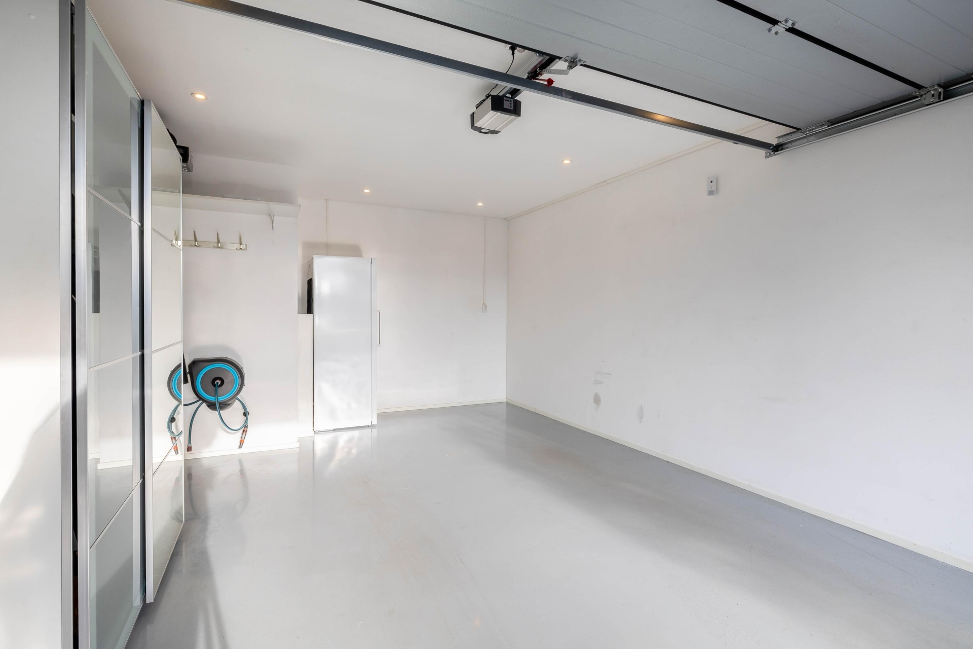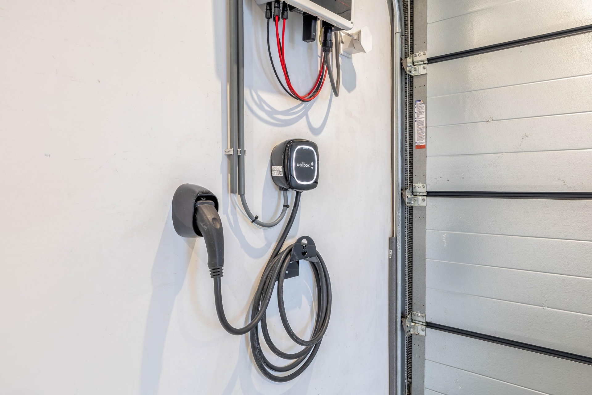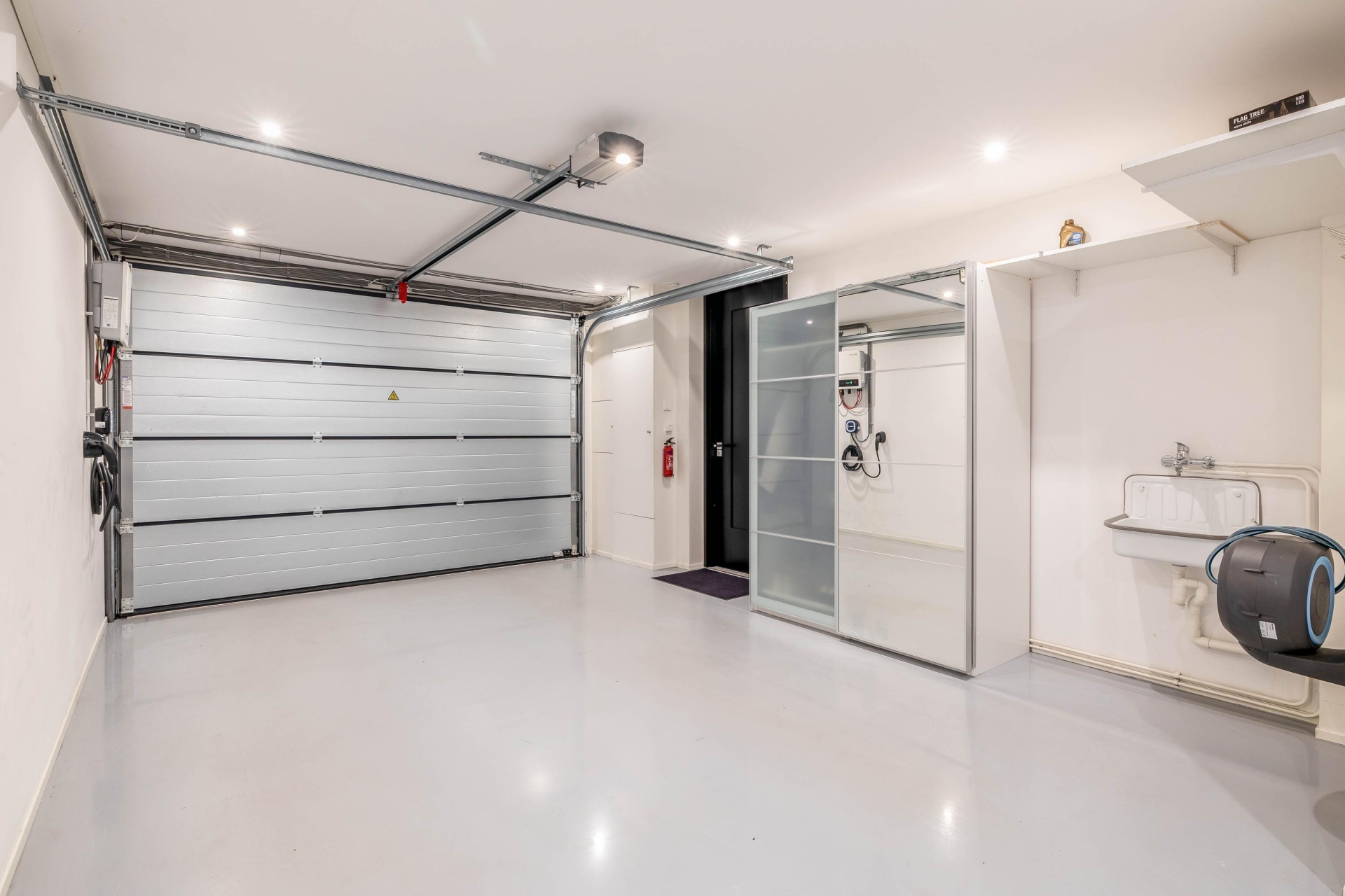 - Garage met elektrische roldeur, gestucte wanden, geëgaliseerde vloer met vloerverwarming en een aansluiting voor het laden van een elektrische auto;