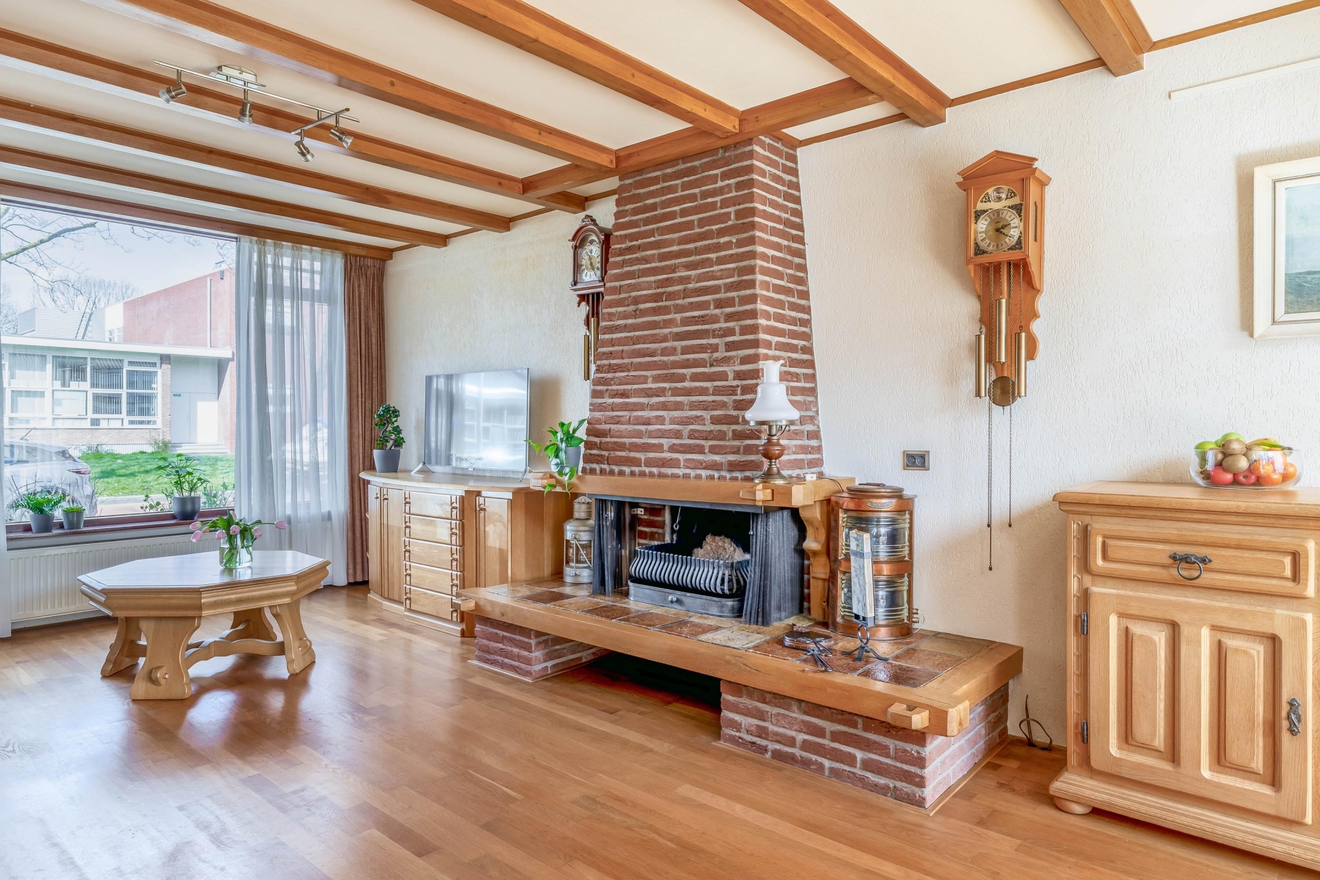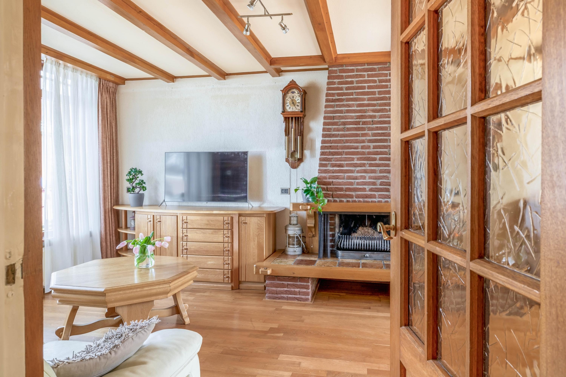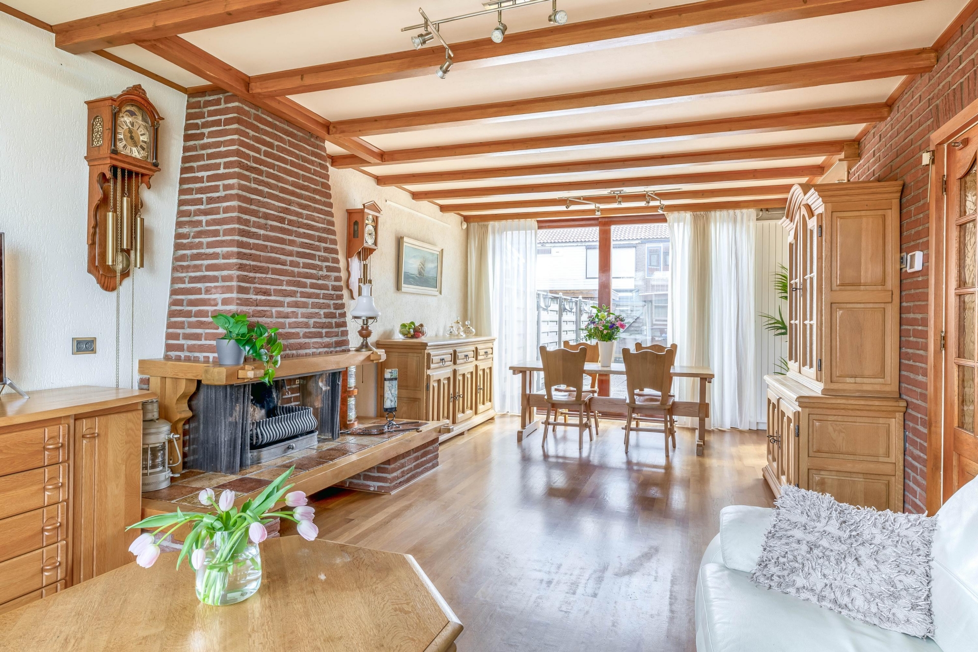 De woonkamer heeft een warme uitstraling door de houten vloer, de zichtbare balken en de sfeervolle open haard. Hier maak je eenvoudig een gezellige zithoek aan de voorzijde en een ruime eethoek aan de tuinzijde.