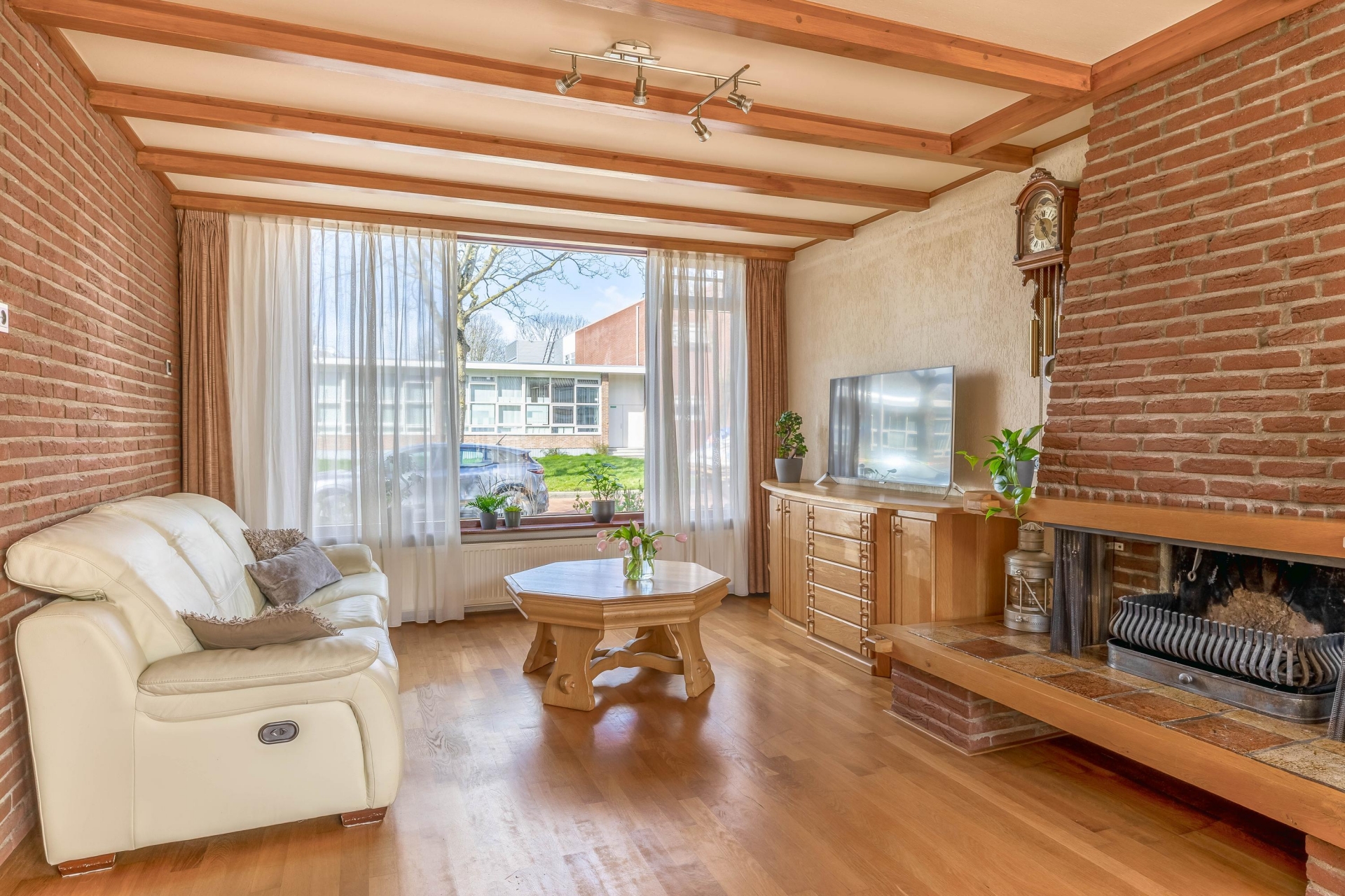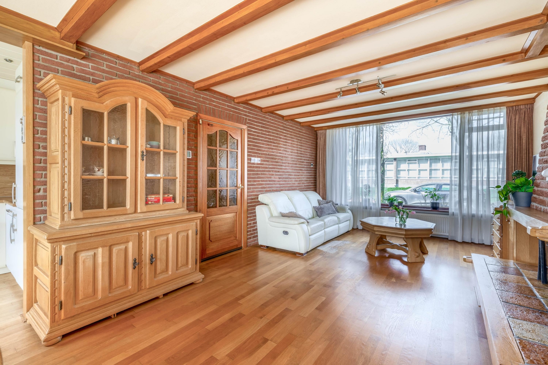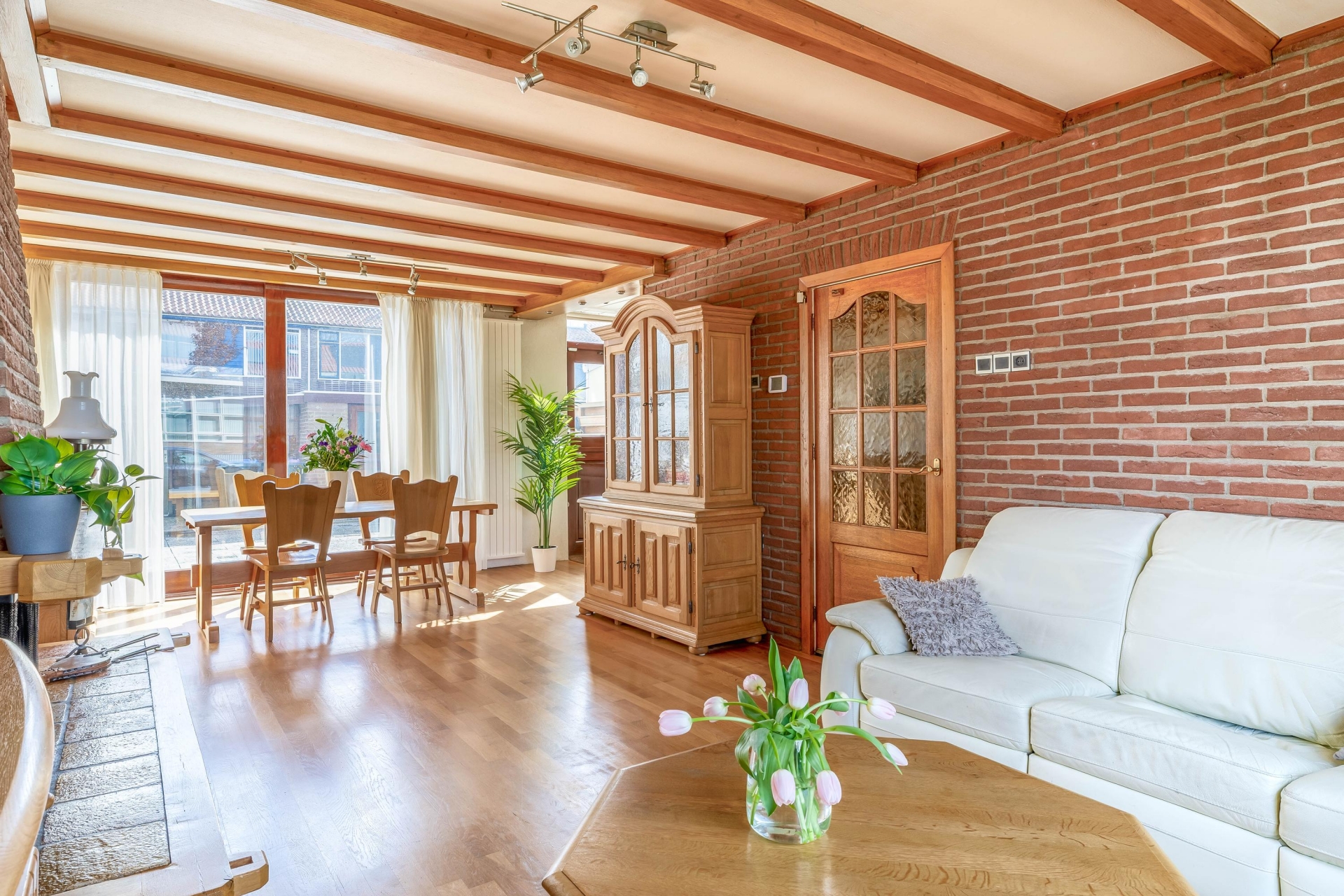 De woonkamer heeft een warme uitstraling door de houten vloer, de zichtbare balken en de sfeervolle open haard. Hier maak je eenvoudig een gezellige zithoek aan de voorzijde en een ruime eethoek aan de tuinzijde.