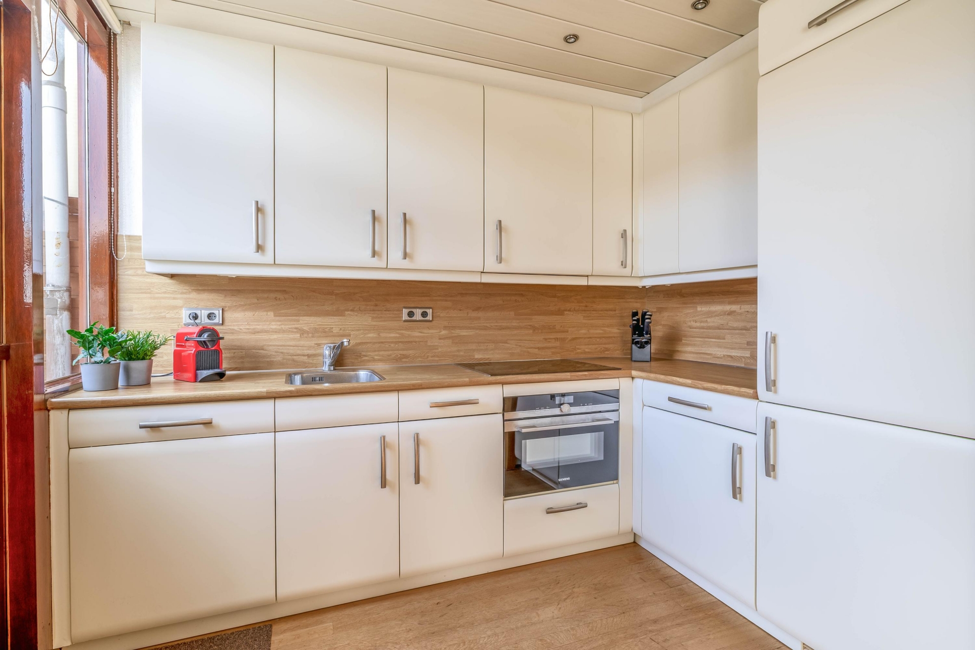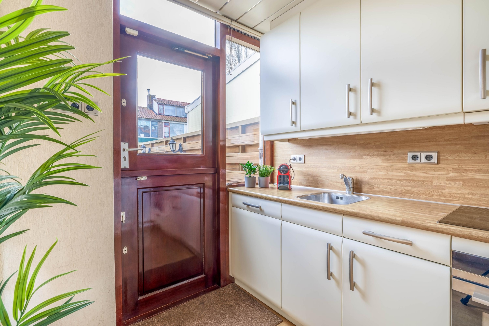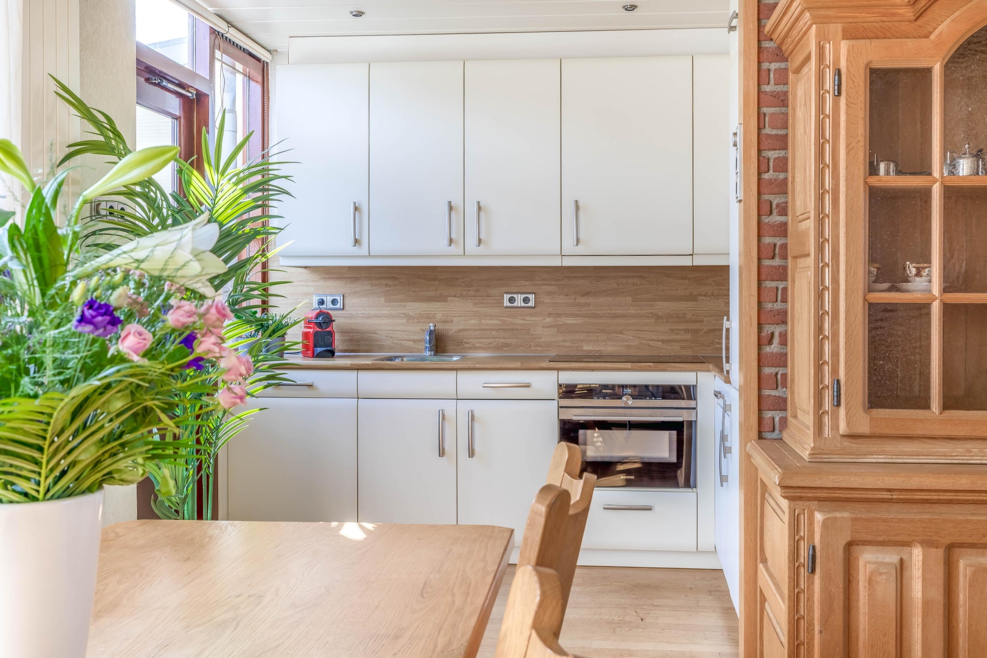 De keuken ligt aan de achterzijde en is netjes en functioneel ingericht. Vanuit hier heb je direct zicht op de tuin, wat het een prettige plek maakt tijdens het koken. De opstelling biedt alles wat je nodig hebt en tegelijkertijd zie je hier direct de kans om het geheel te vernieuwen en bijvoorbeeld open te trekken richting de woonkamer.