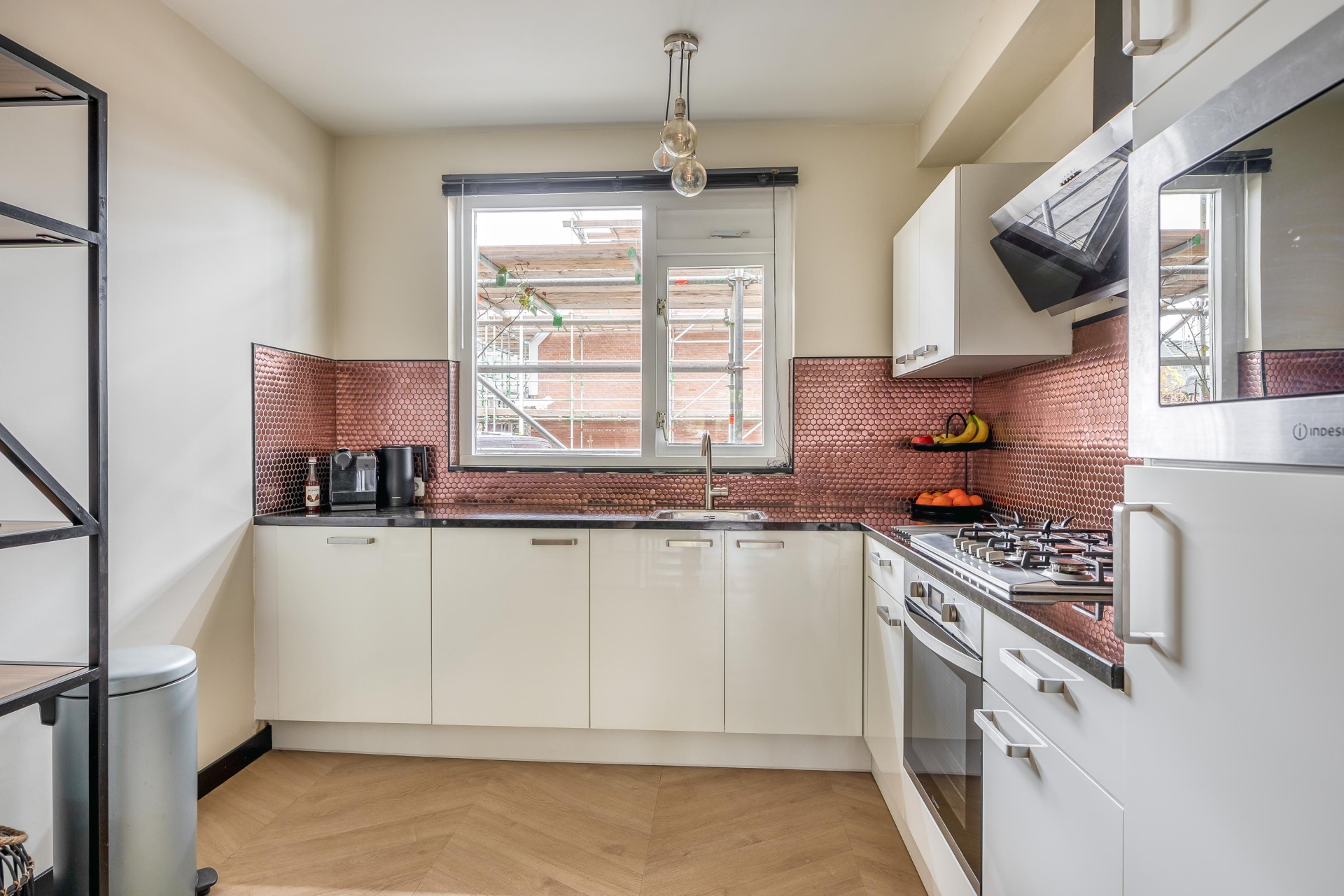 De keuken is eigentijds en stijlvol uitgevoerd met een opvallende, koperkleurige achterwand en een functionele indeling. Hier vind je een vijfpits-gasfornuis met afzuigkap, magnetron, oven, koelkast, vaatwasser en veel praktische werk? en bergruimte. De keuken heeft een prettige ligging aan de voorzijde van het huis met natuurlijk licht via het raam.